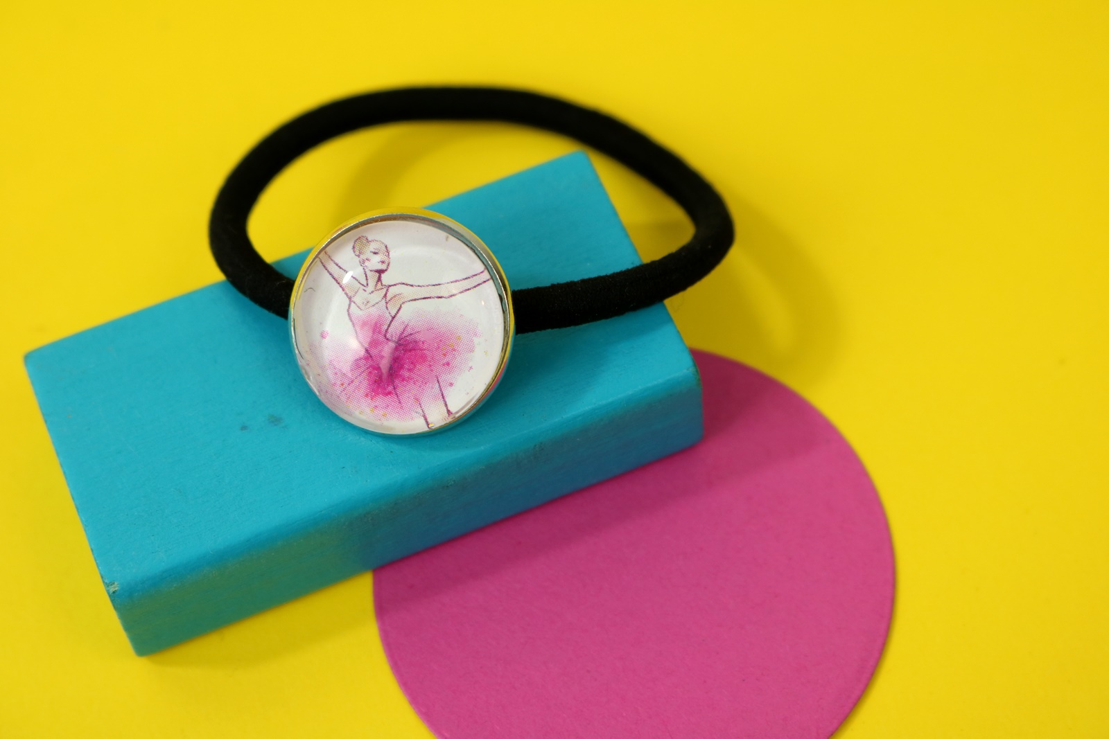 Do czarnej gumki przymocowana jest metalowa baza, w której wkleiłam szkiełko z grafiką. Szkiełko ma średnicę 2 cm.