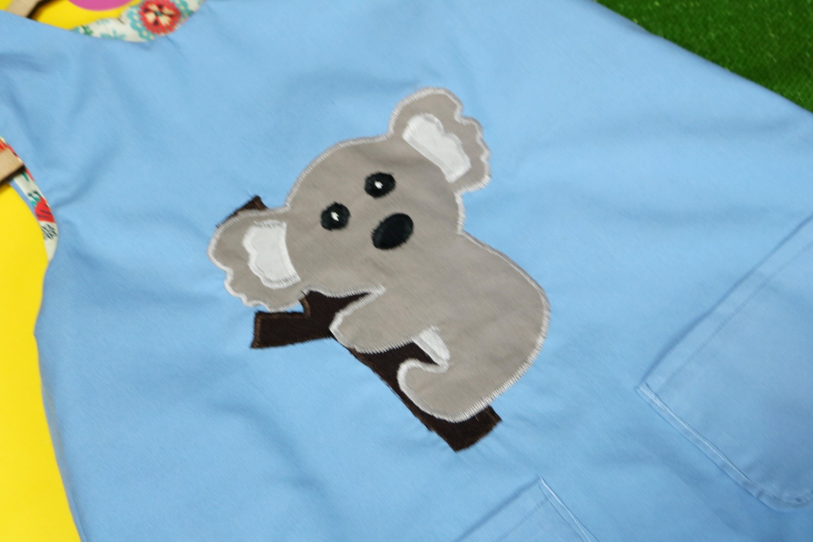 Sukienka wykonana w całości z bawełny (zdekatyzowanej przed uszyciem – sukienka nie skurczy się po praniu). Zapinana na guziki z obu stron, na każdej z nich naszyte także dwie kieszonki. Na pierwszej stronie naszyta aplikacja z koalą.