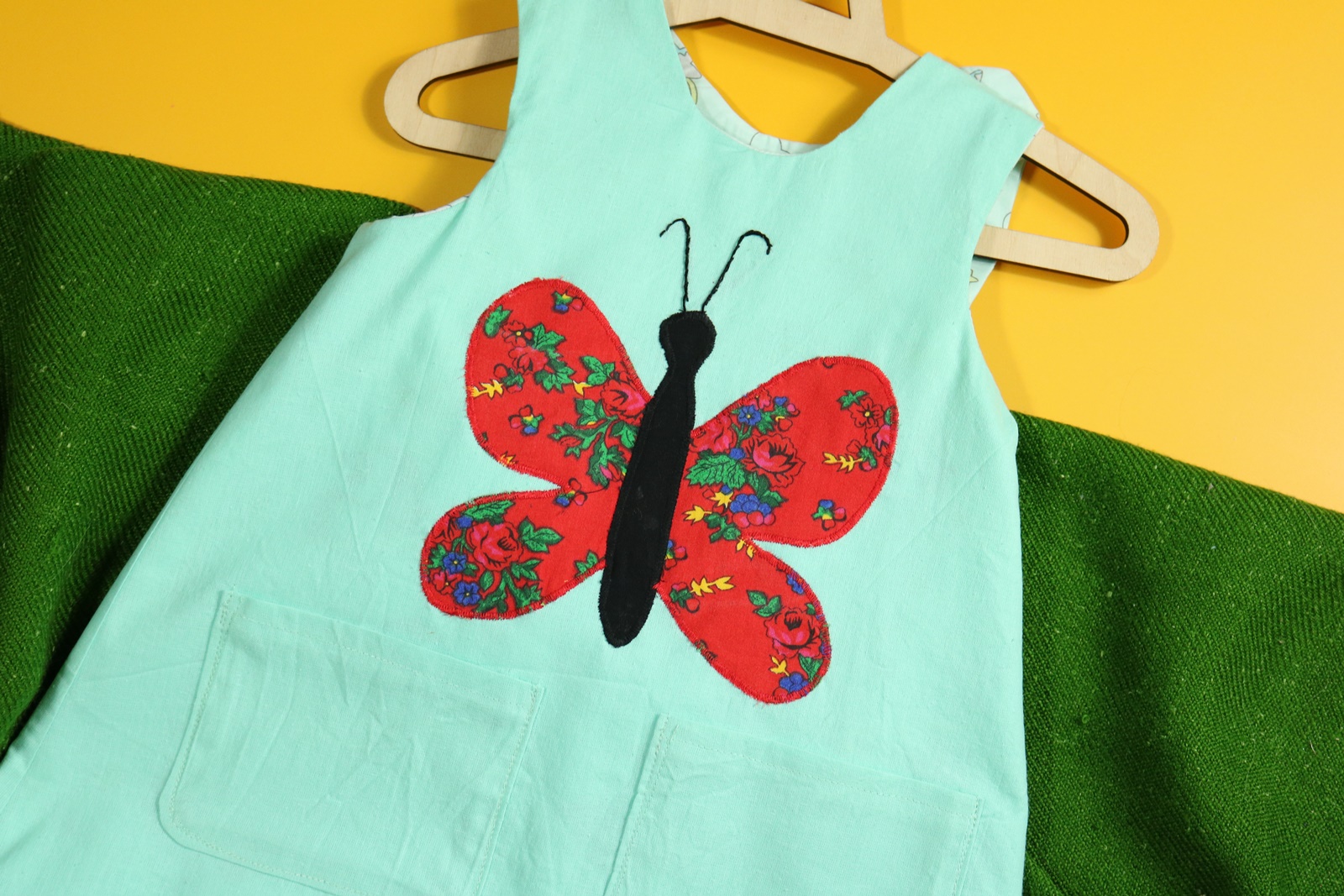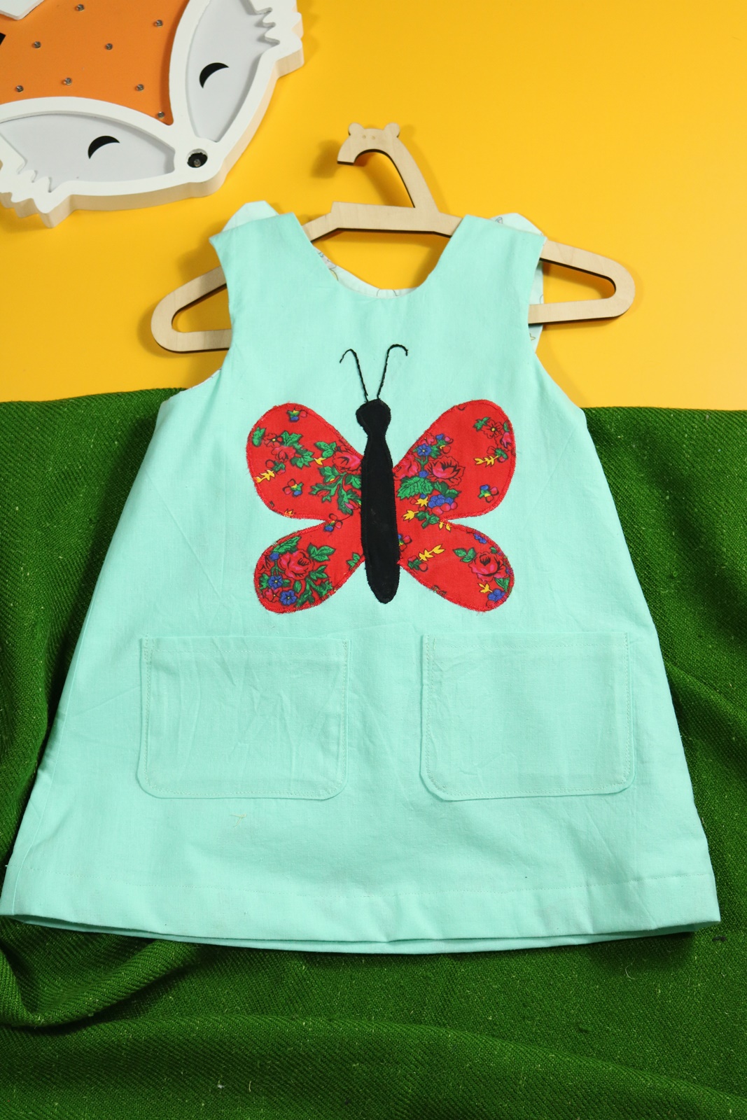 Sukienka wykonana w całości z bawełny (zdekatyzowanej przed uszyciem – sukienka nie skurczy się po praniu). Zapinana na guziki z obu stron, na każdej z nich naszyte także dwie kieszonki. Na pierwszej stronie naszyta aplikacja z motylem.