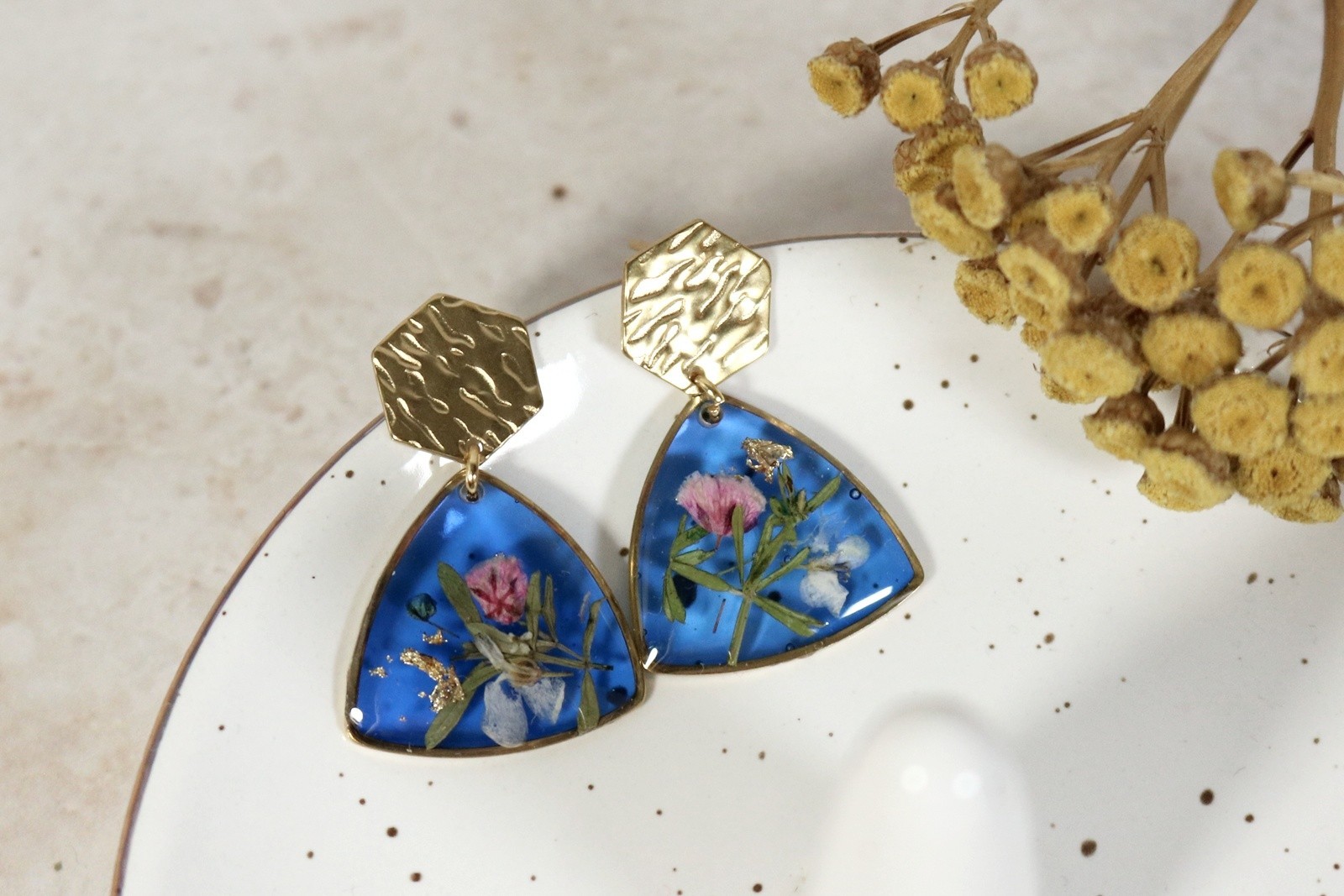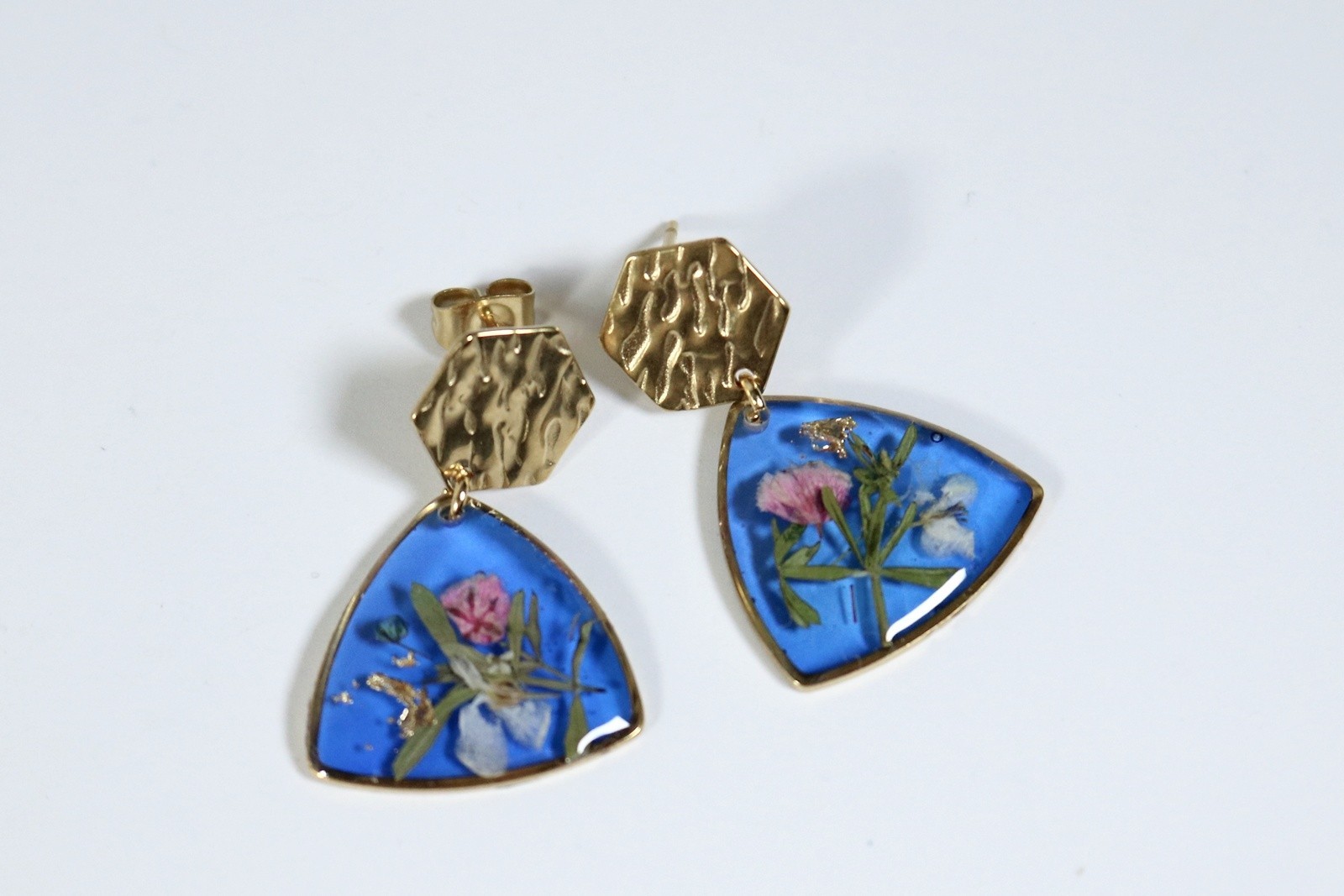 Kwiaty umieściłam na tle w kolorze kobaltowym. Całość pokryta przezroczystą żywicą.