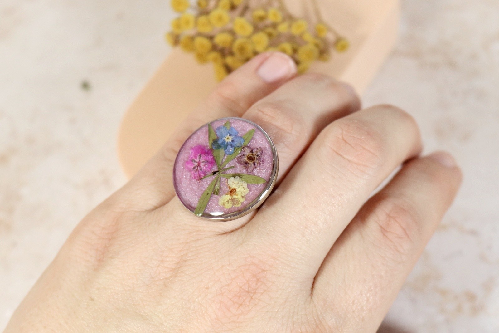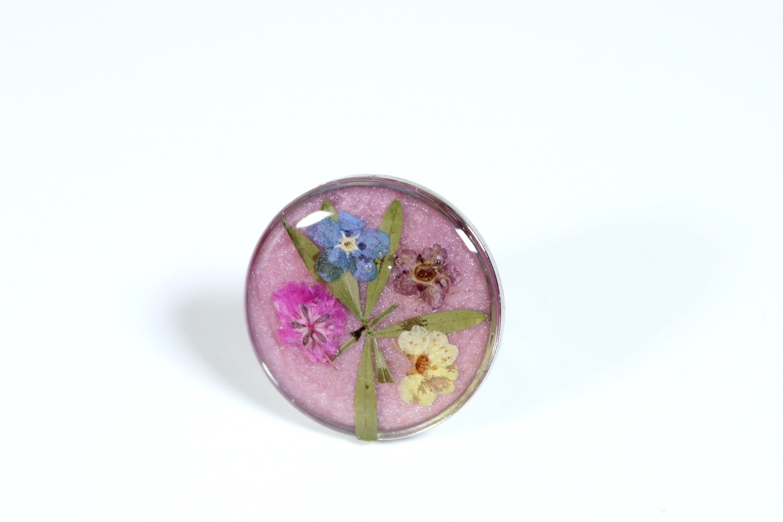 Kwiaty gipsówki, liście przytulii umieściłam na tle w kolorze perłowym różowym. Całość oczka pokryta krystaliczną żywicą.