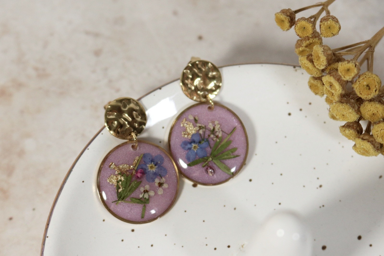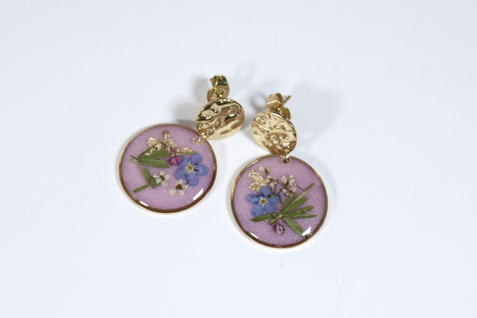 Kwiaty gipsówki, przytulia umieściłam na tle w kolorze różowym. Całość pokryta przezroczystą żywicą.