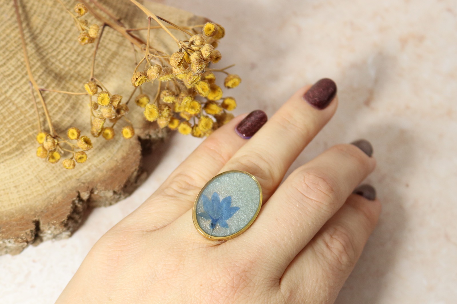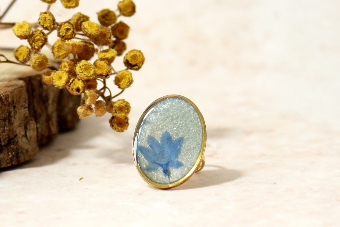 Płatki chabrów umieściłam na tle w kolorze perłowym białym. Całość oczka pokryta krystaliczną żywicą.