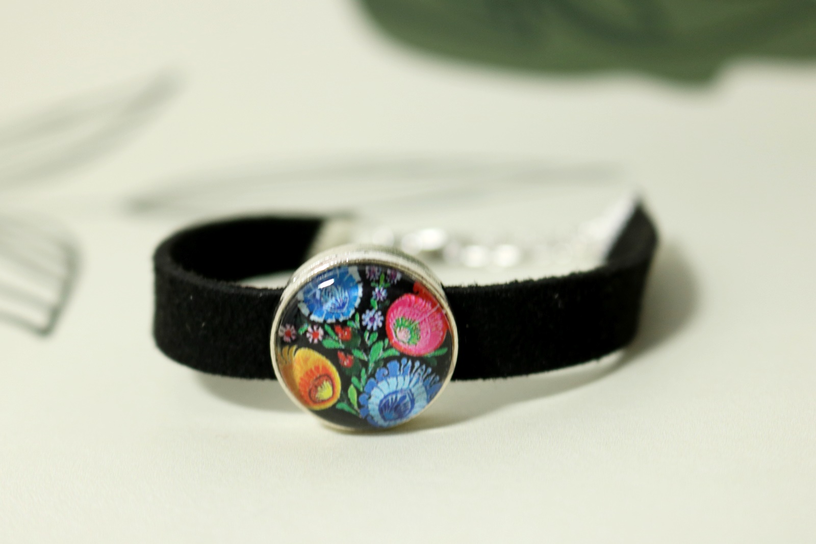 Wykonana z zamszowego, płaskiego rzemienia, na którym nawleczona jest baza z grafiką. Bransoletka zapinana jest na karabińczyk, a elementy metalowe wykonane są ze stopu metali. Choć ma długość 17 cm, to bez problemu założysz ją także na trochę szerszym nadgarstku. Każdą bransoletkę zakończyłam 8 cm łańcuszkiem przedłużającym.