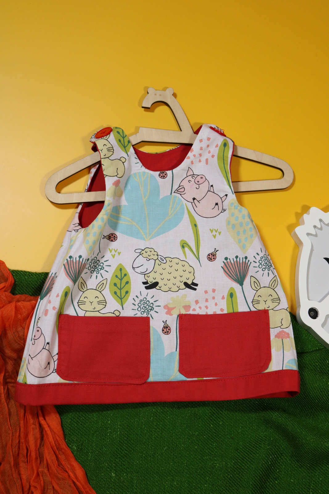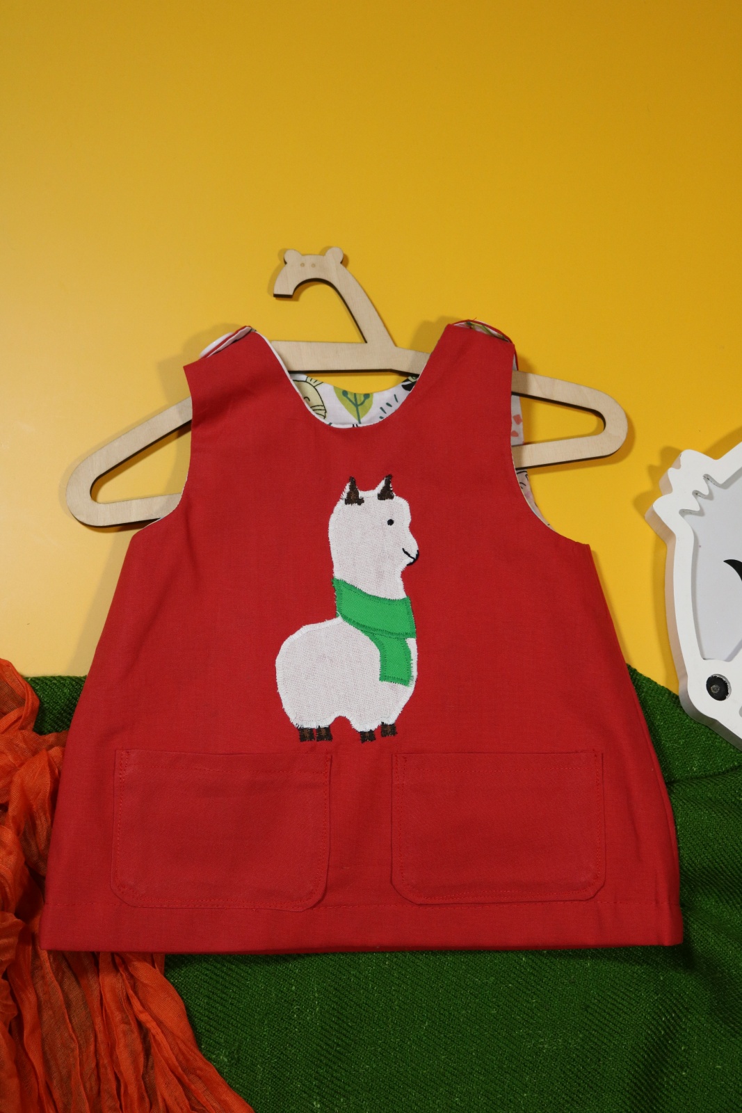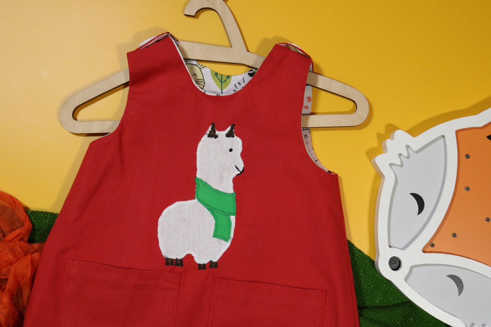 Sukienka wykonana w całości z bawełny (zdekatyzowanej przed uszyciem – sukienka nie skurczy się po praniu). Zapinana na guziki z obu stron, na każdej z nich naszyte także dwie kieszonki. Na pierwszej stronie naszyta aplikacja z alpaką.