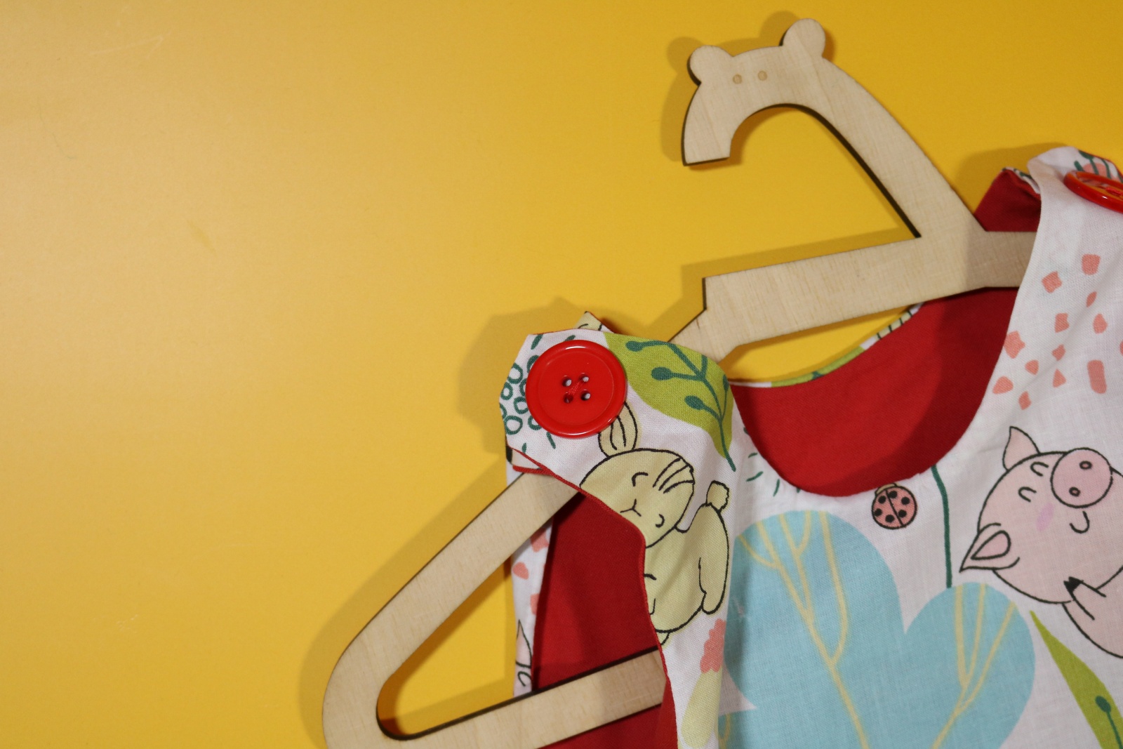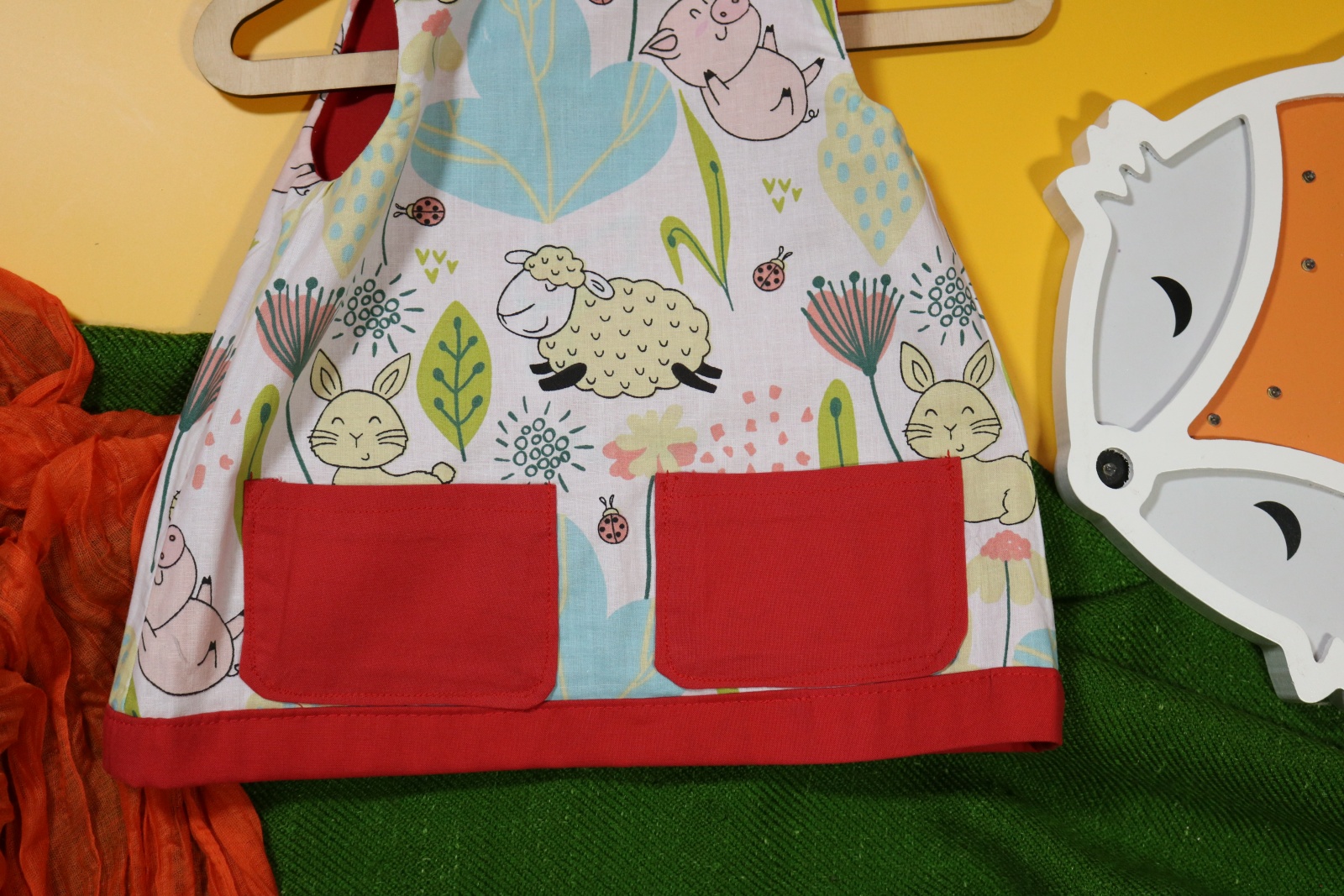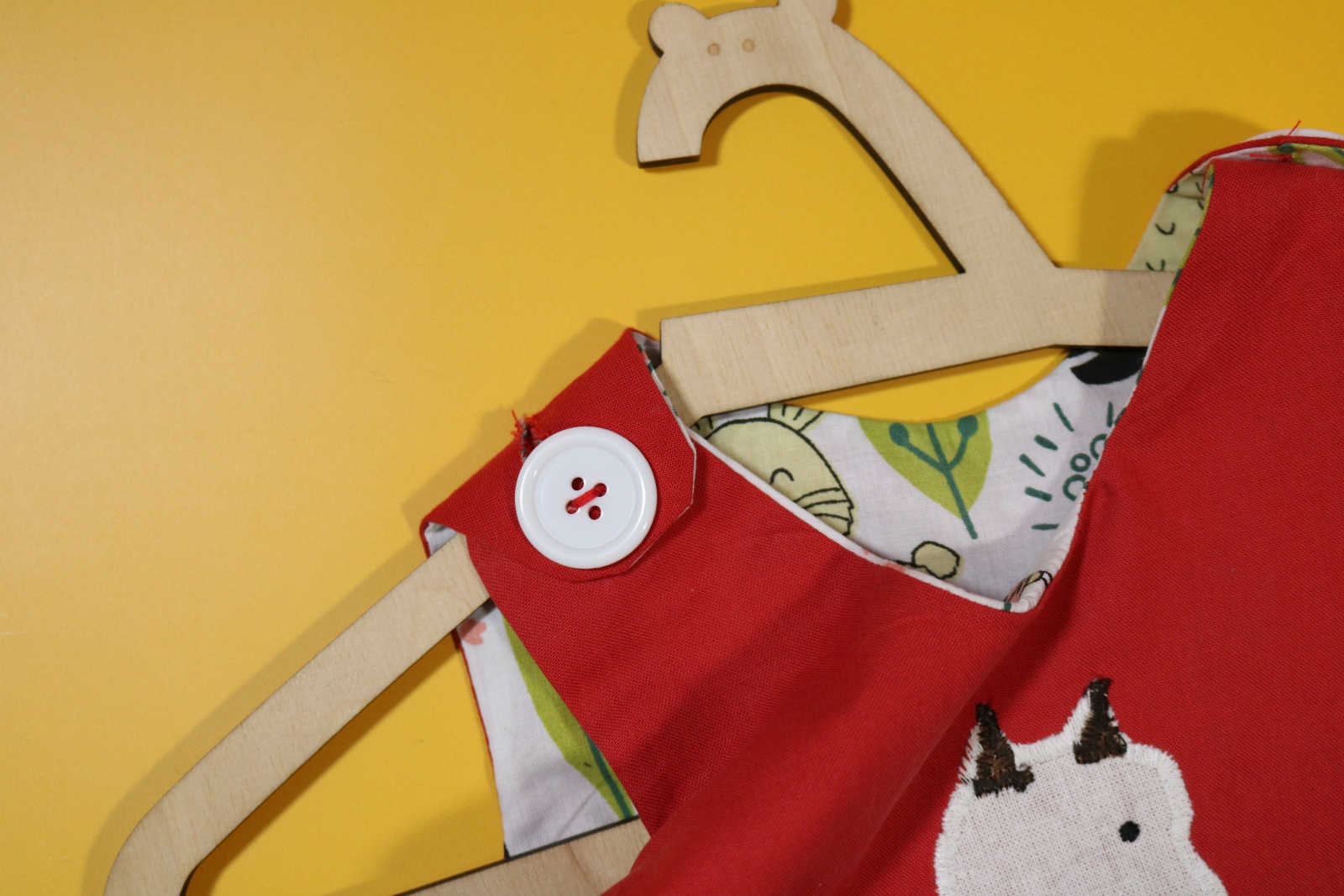 Sukienka wykonana w całości z bawełny (zdekatyzowanej przed uszyciem – sukienka nie skurczy się po praniu). Zapinana na guziki z obu stron, na każdej z nich naszyte także dwie kieszonki. Na pierwszej stronie naszyta aplikacja z alpaką.