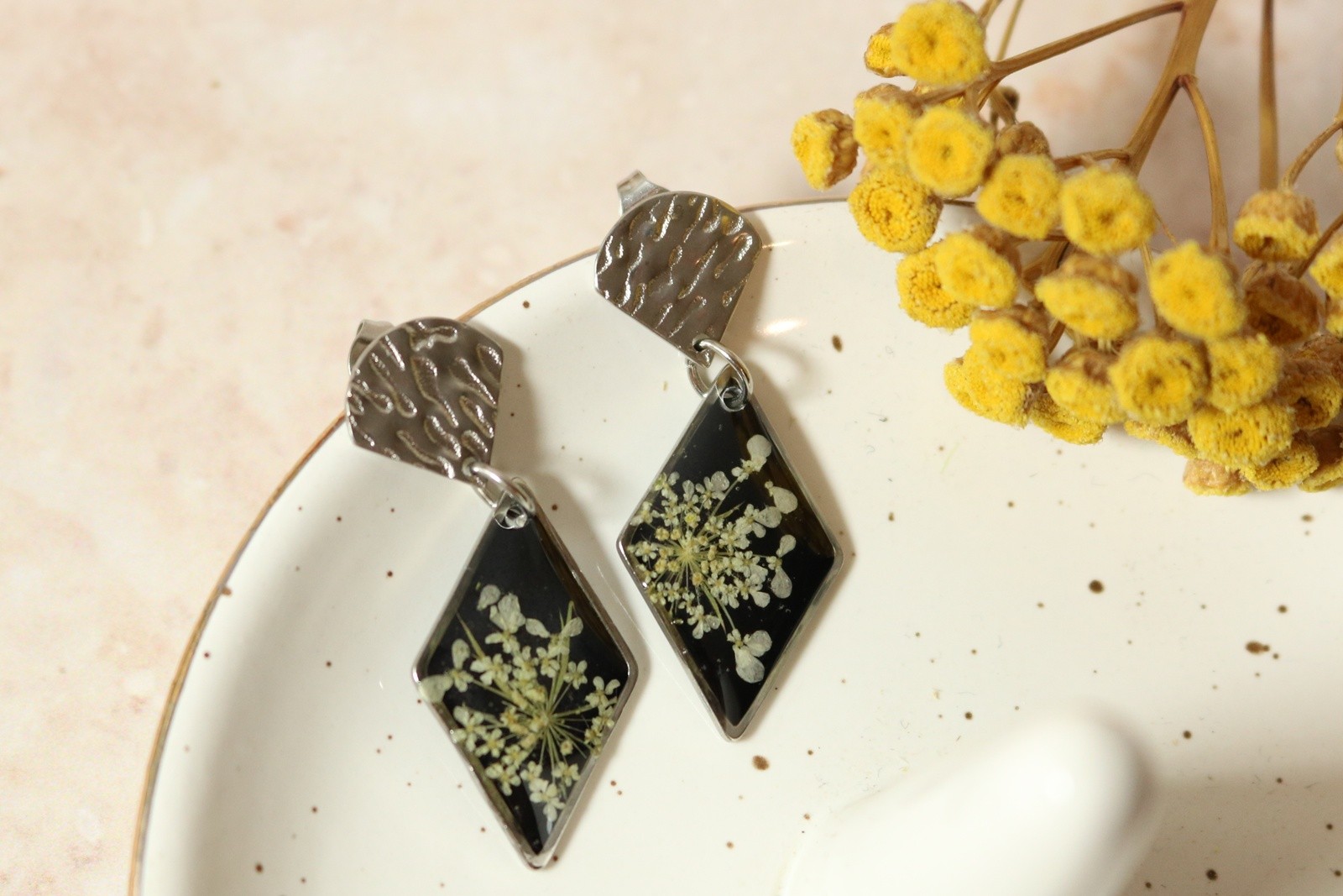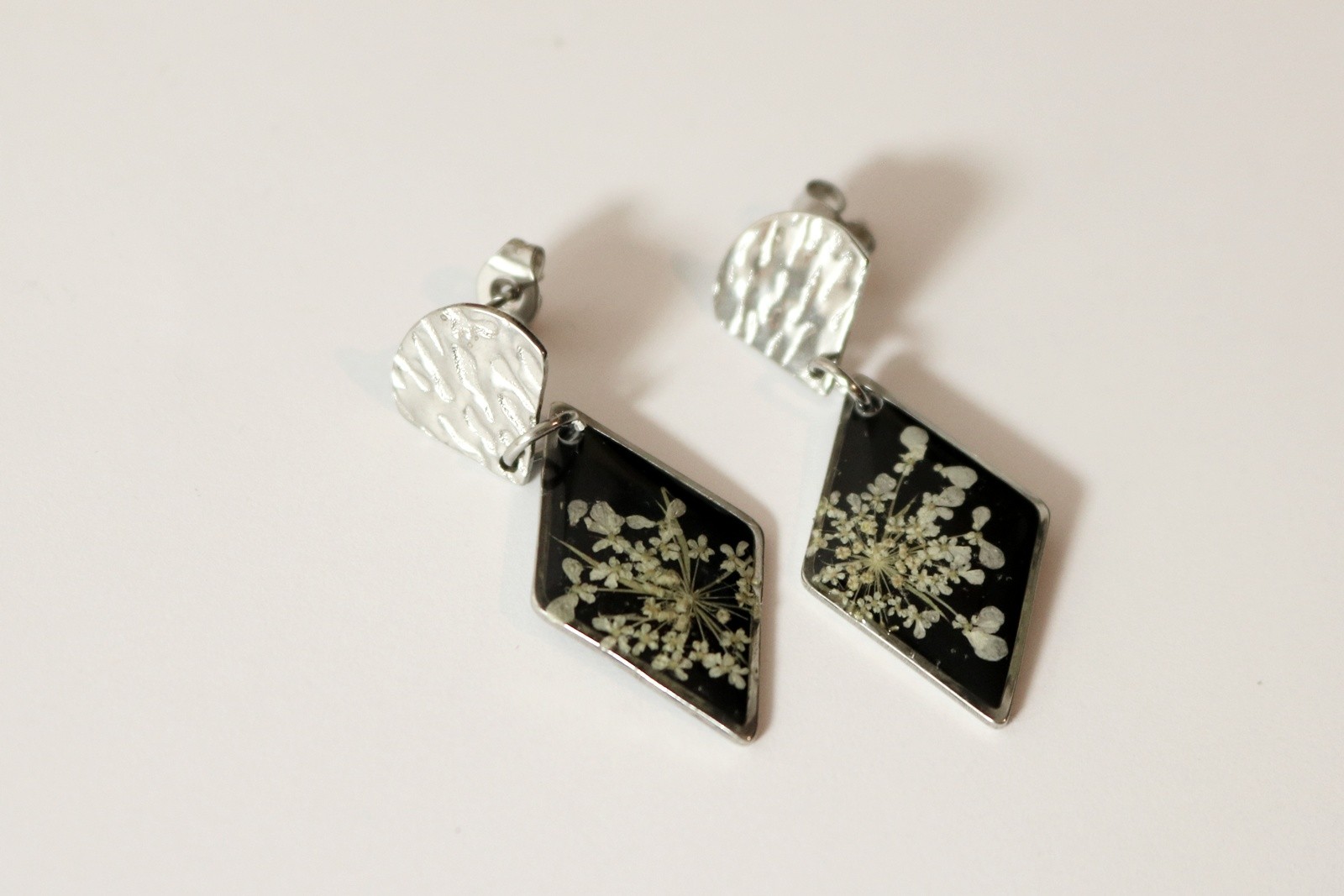Kwiaty dzikiej marchwi umieściłam na tle w kolorze czarnym. Całość pokryta przezroczystą żywicą.