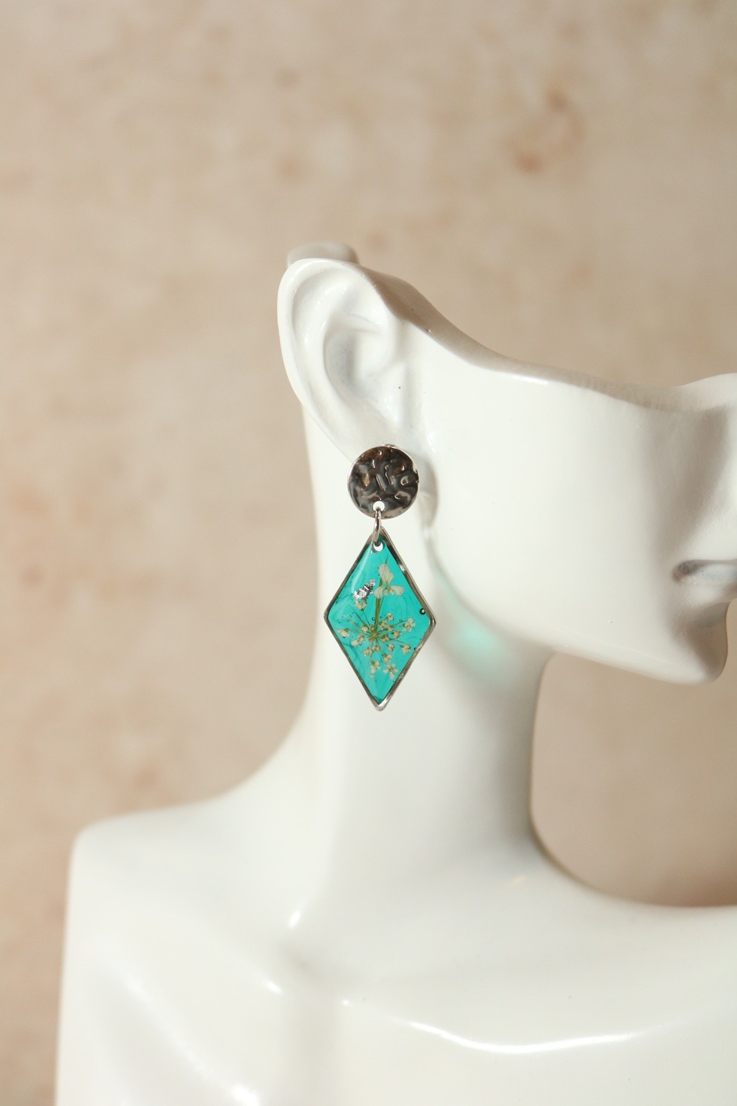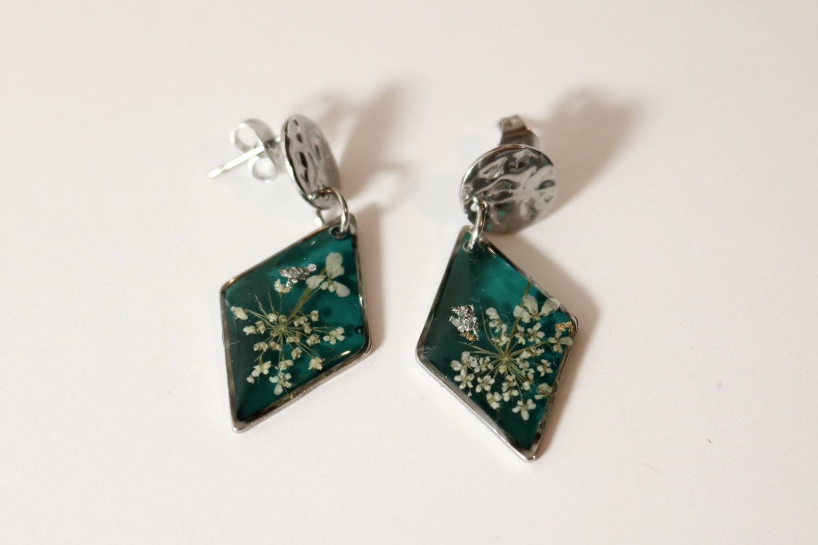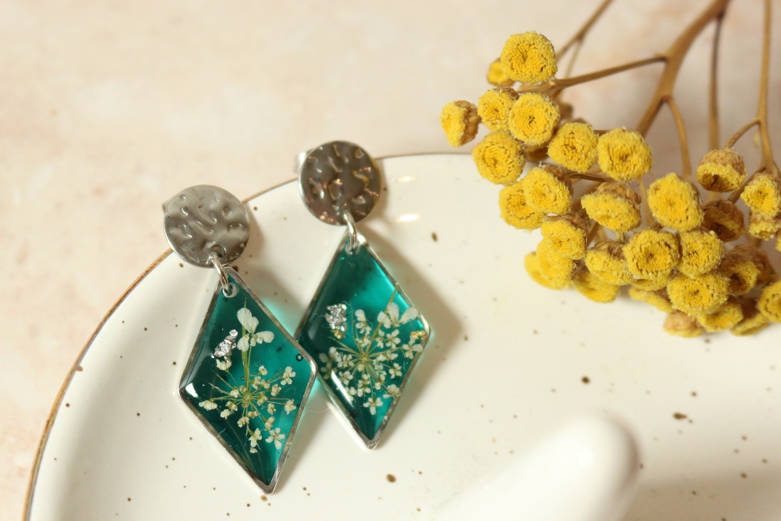 Kwiaty dzikiej marchwi umieściłam na tle w kolorze zielonym. Całość pokryta przezroczystą żywicą.