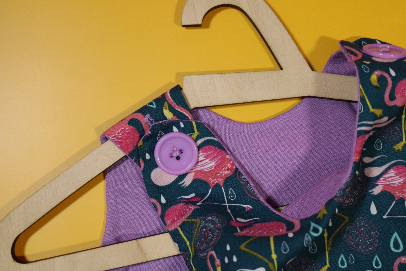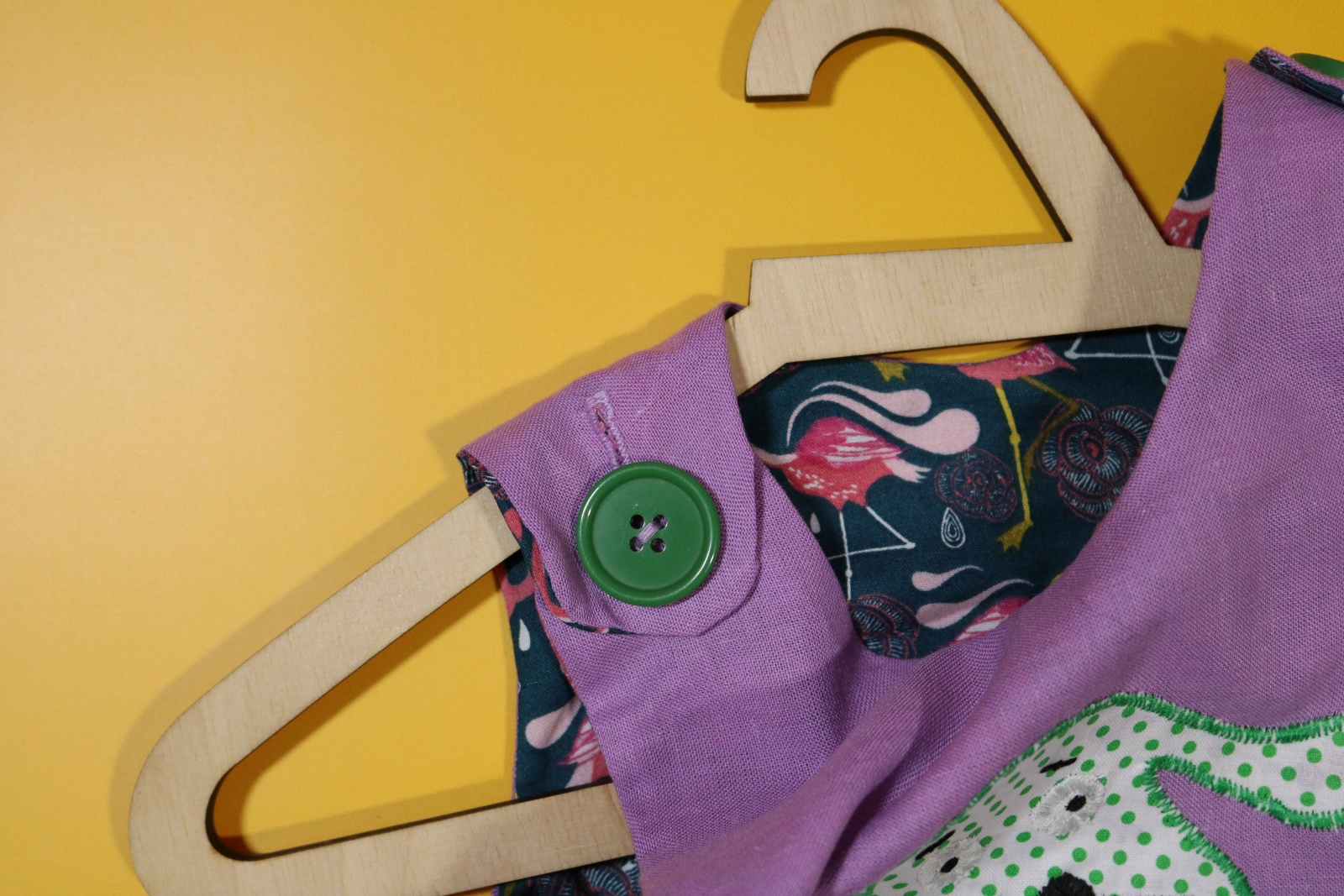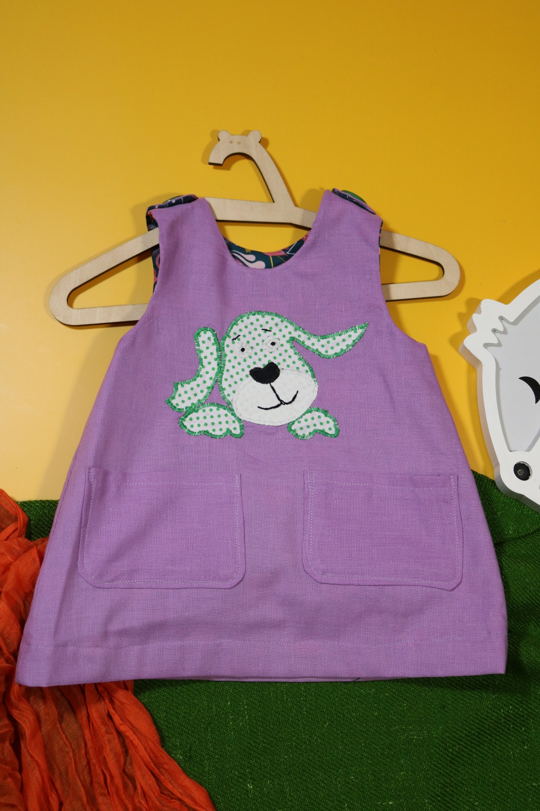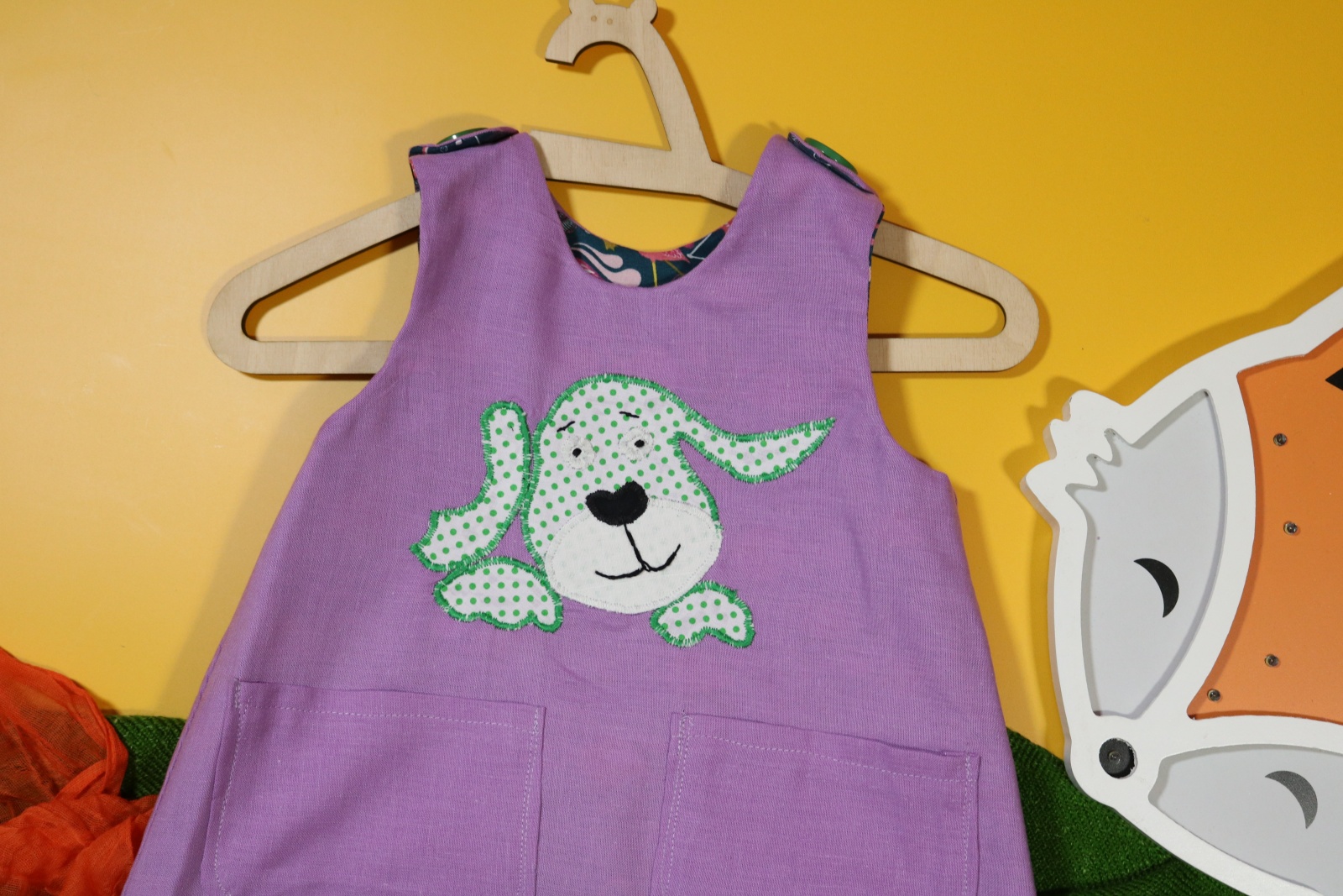 Sukienka wykonana w całości z bawełny (zdekatyzowanej przed uszyciem – sukienka nie skurczy się po praniu). Zapinana na guziki z obu stron, na każdej z nich naszyte także dwie kieszonki. Na pierwszej stronie naszyta aplikacja z pieskiem.