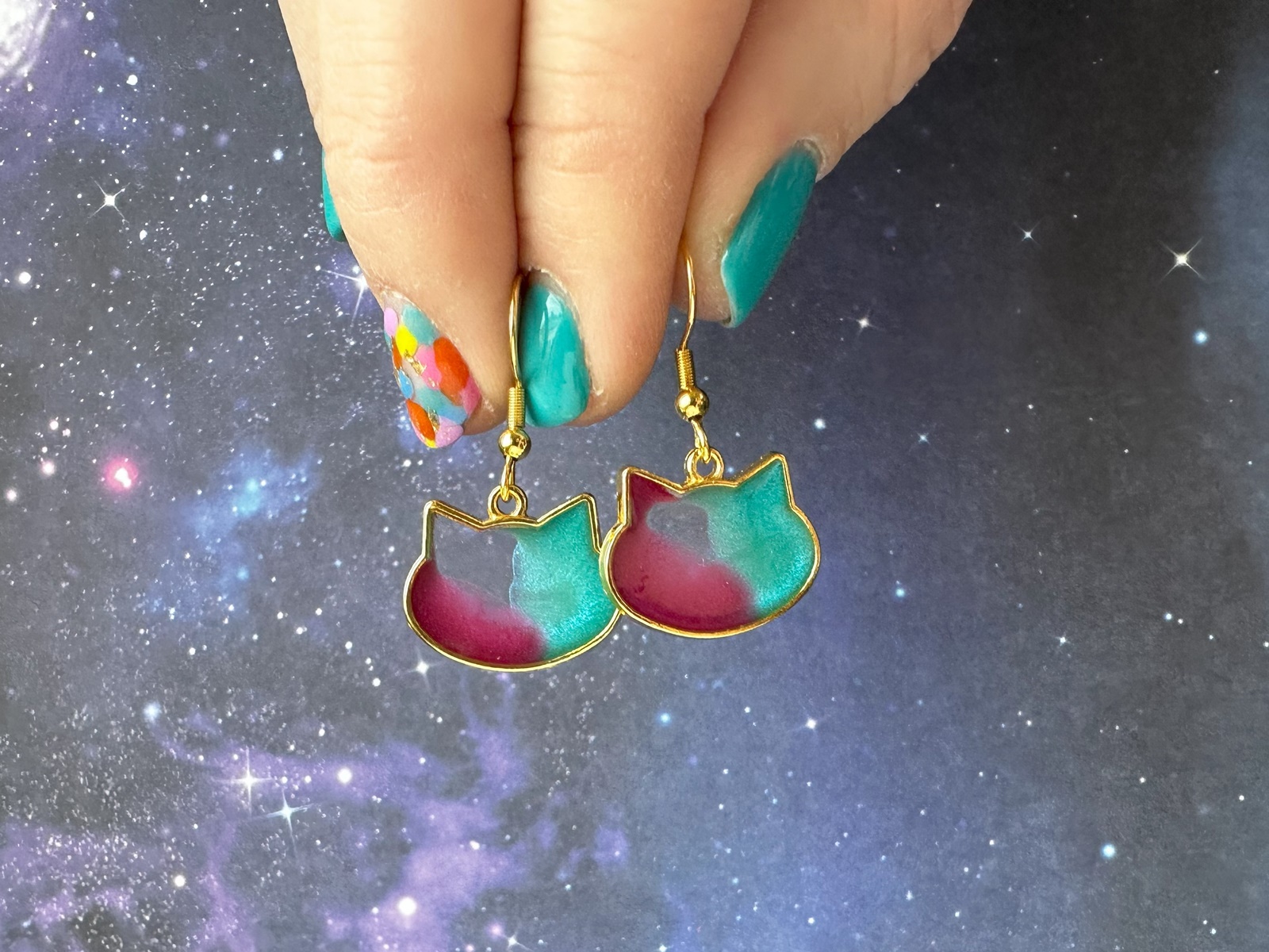 Galaktyczne kolczyki w kształcie głowy kota. Wykonane z żywicy, zabarwionej perłowymi pigmentami. Na wierzchu warstwa przezroczystej żywicy, która nadaje głębie kolczykom.