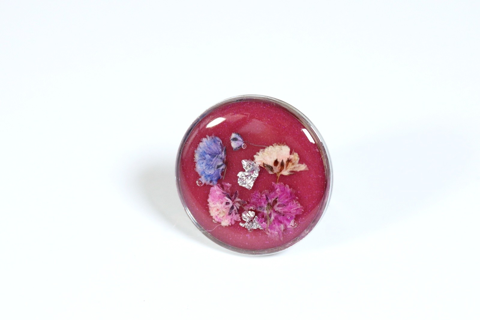 Kwiat gipsówki umieściłam na tle w kolorze perłowym amarantowym. Całość oczka pokryta krystaliczną żywicą.
