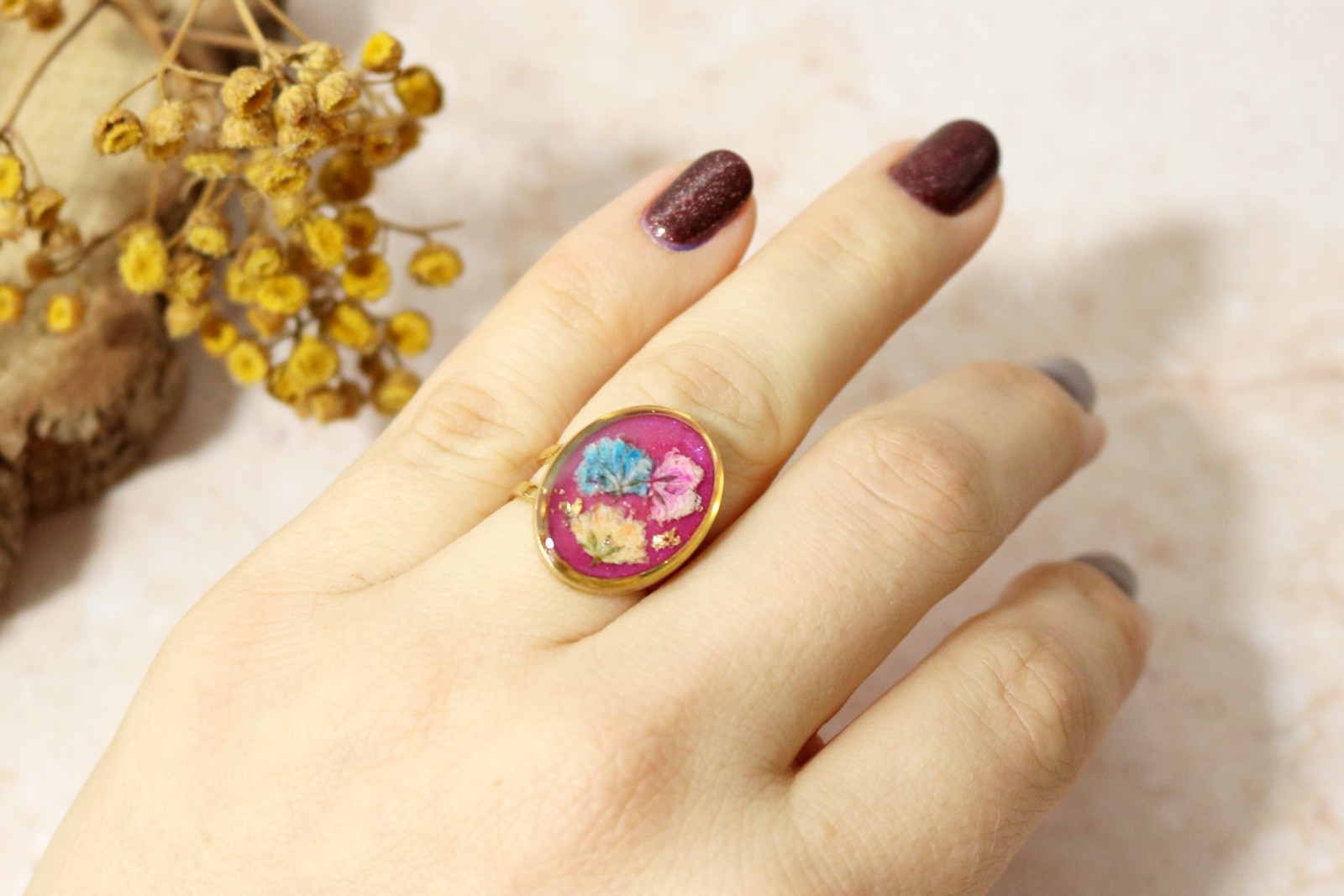 Kwiaty gipsówki umieściłam na tle w kolorze perłowym amarantowym. Całość oczka pokryta krystaliczną żywicą.