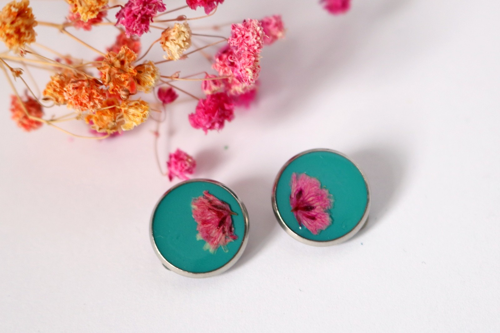 Od teraz także uwiecznione piękno kwiatów, które zalałam w żywicy – również w klipsach. Na spodzie zabarwiona na turkusowo żywica, na której umieściłam kwiaty barwionej, różowej gipsówki, a następnie zalałam to krystaliczną żywicą.