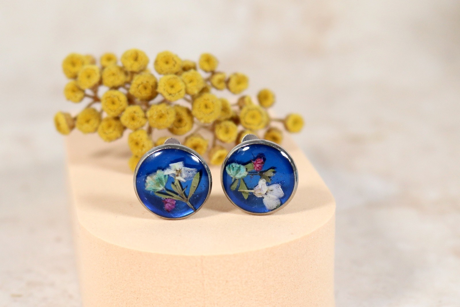 Od teraz także uwiecznione piękno kwiatów, które zalałam w żywicy – również w klipsach. Na spodzie zabarwiona żywica na kobaltowo, na której umieściłam kwiaty gipsówki, a następnie zalałam to krystaliczną żywicą.