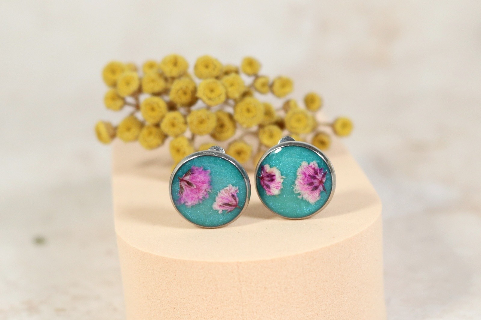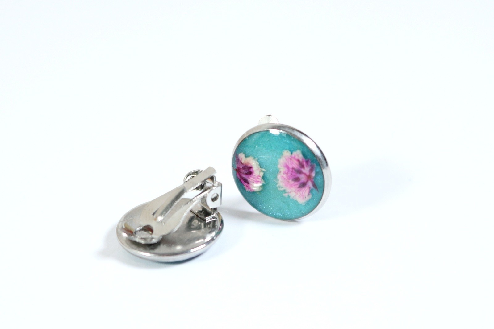 Od teraz także uwiecznione piękno kwiatów, które zalałam w żywicy – również w klipsach. Na spodzie zabarwiona żywica na perłowo turkusowo, na której umieściłam kwiaty gipsówki, a następnie zalałam to krystaliczną żywicą.