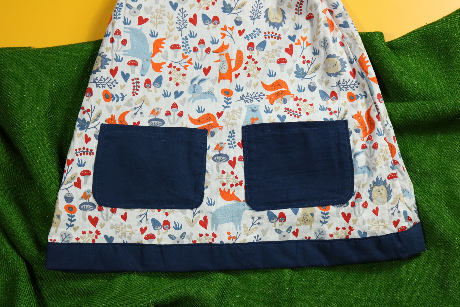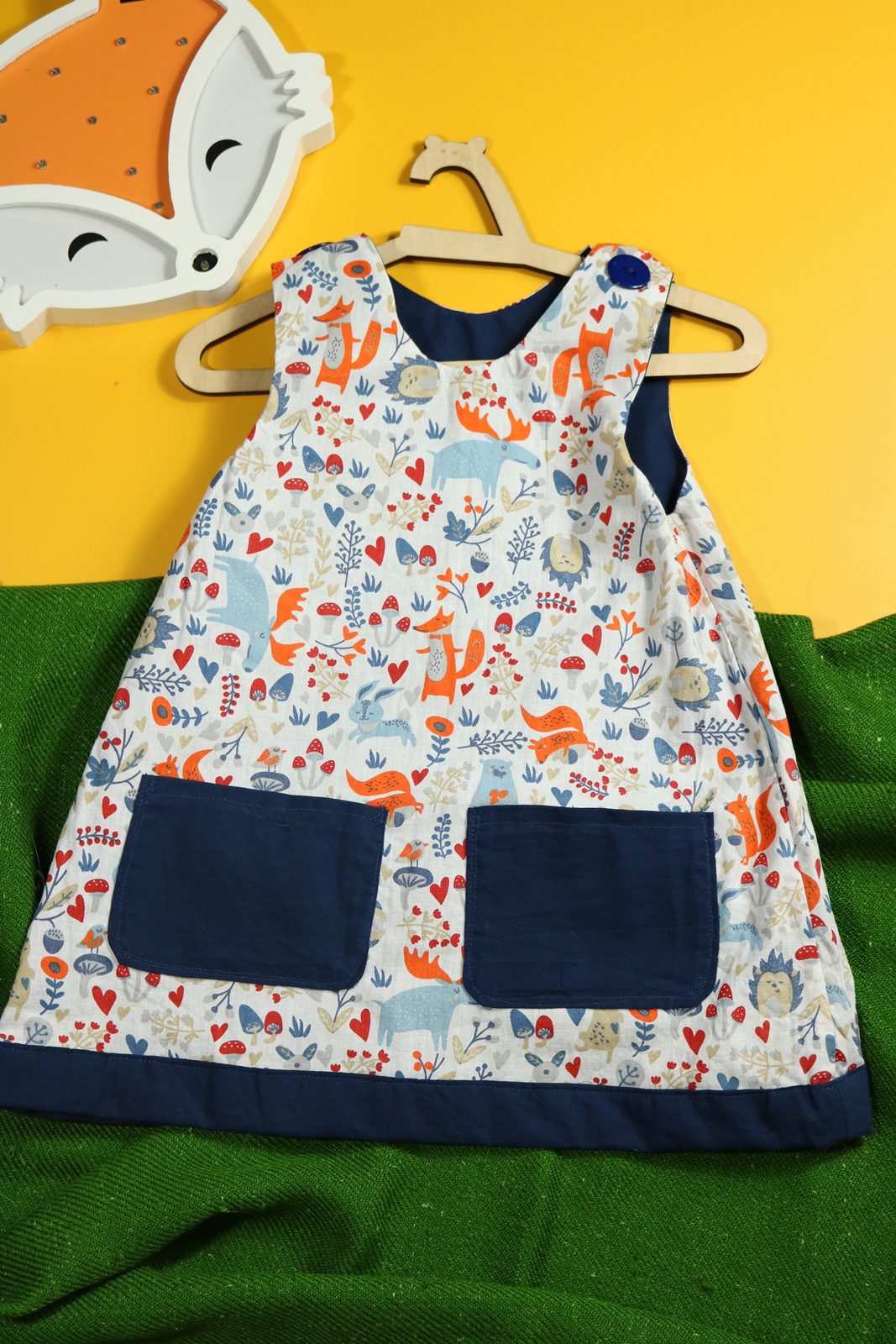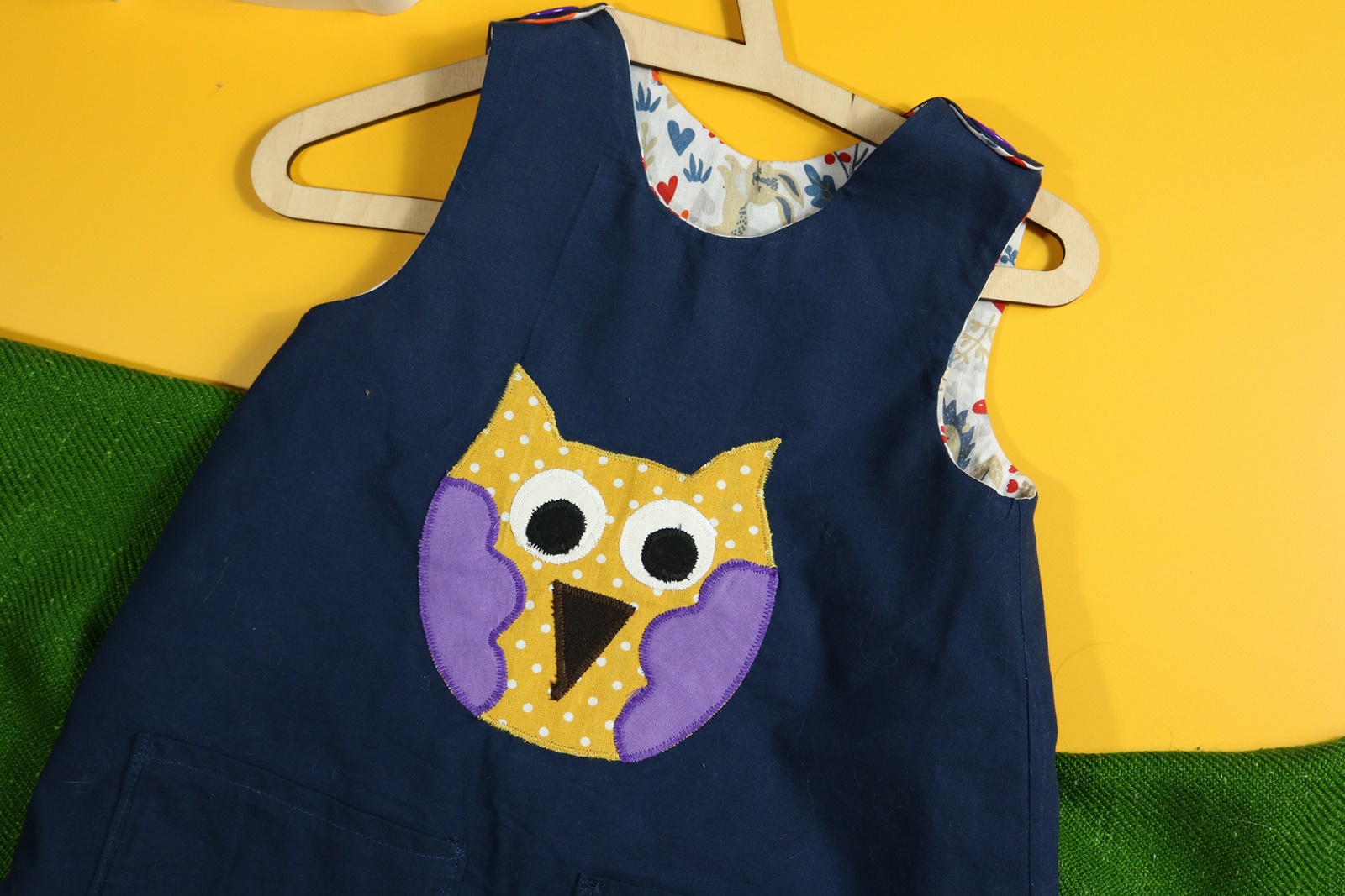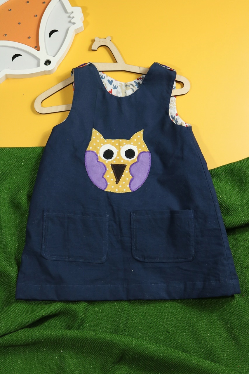 Sukienka wykonana w całości z bawełny (zdekatyzowanej przed uszyciem – sukienka nie skurczy się po praniu). Zapinana na guziki z obu stron, na każdej z nich naszyte także dwie kieszonki. Na pierwszej stronie naszyta aplikacja z sową.