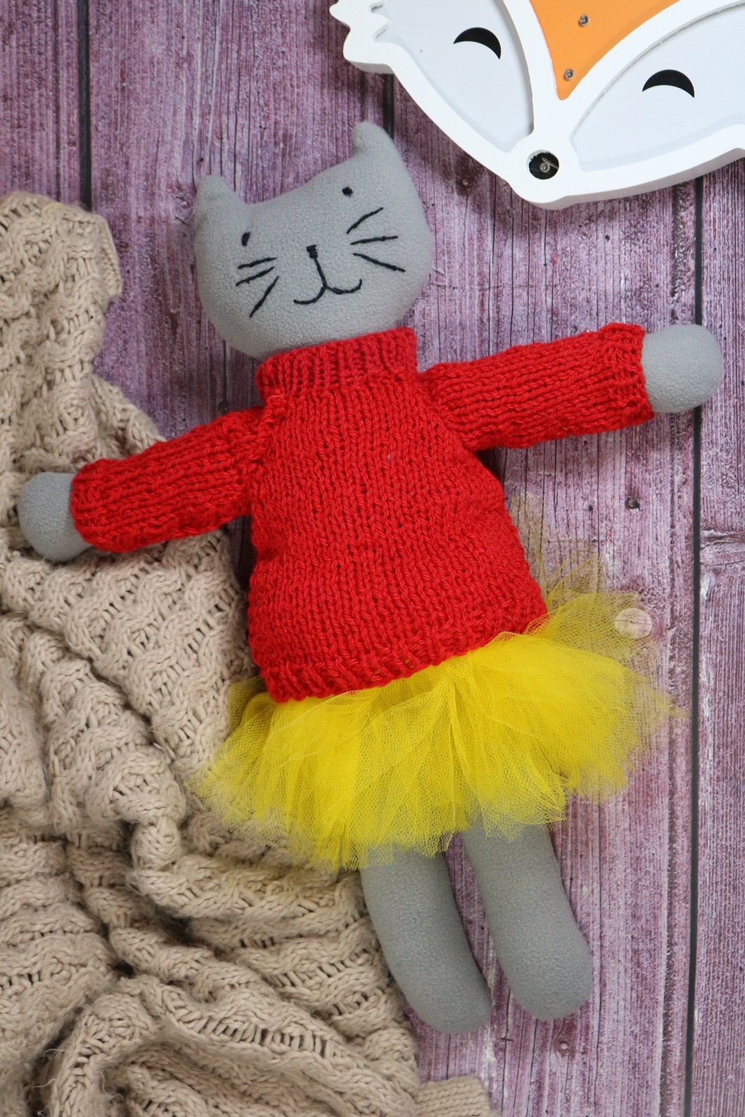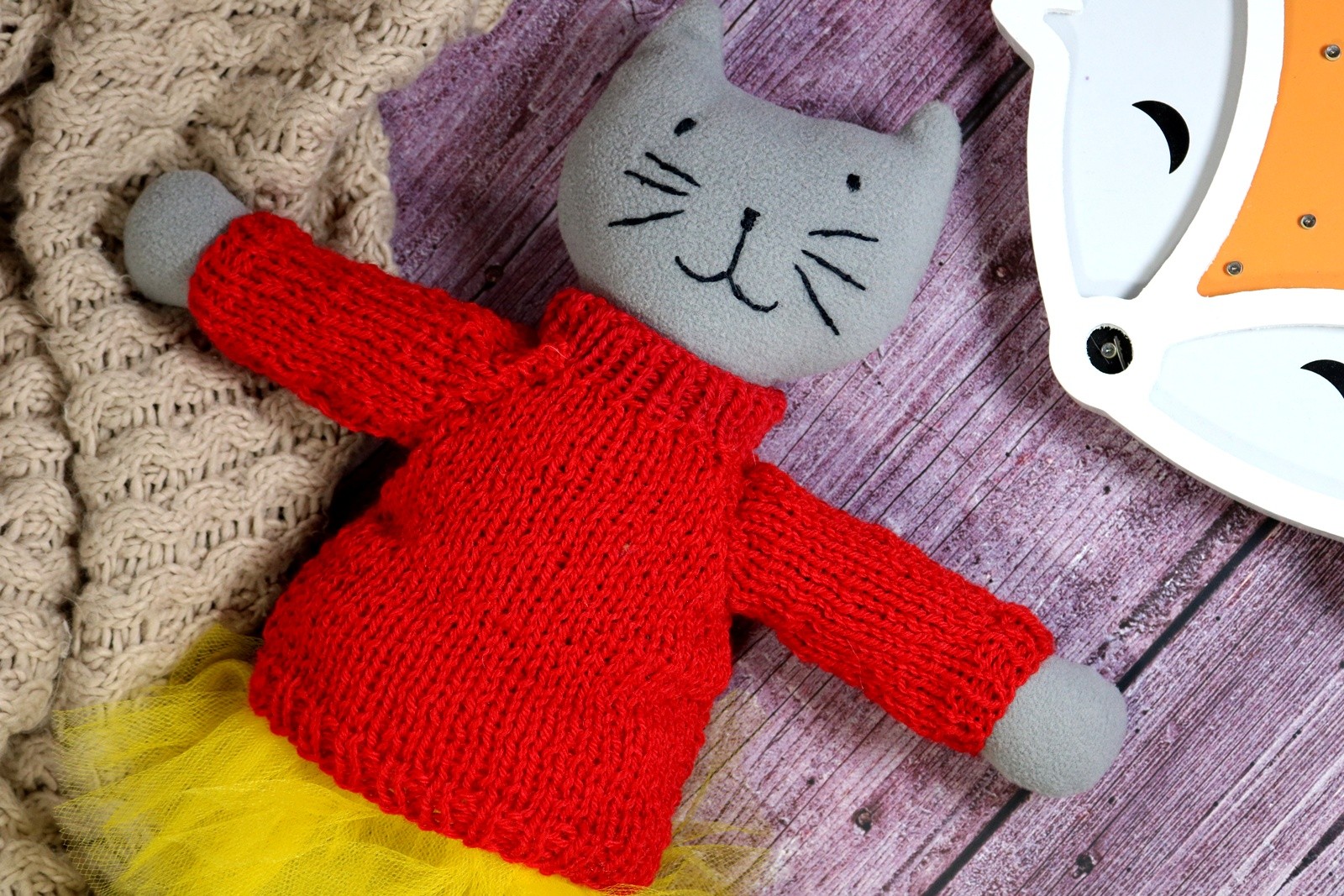 Maskotka wykonana z miękkiego polaru, sweter udziergany na drutach, a spódniczka zrobiona z tiulu. Kot nie ma żadnych luźnych elementów.