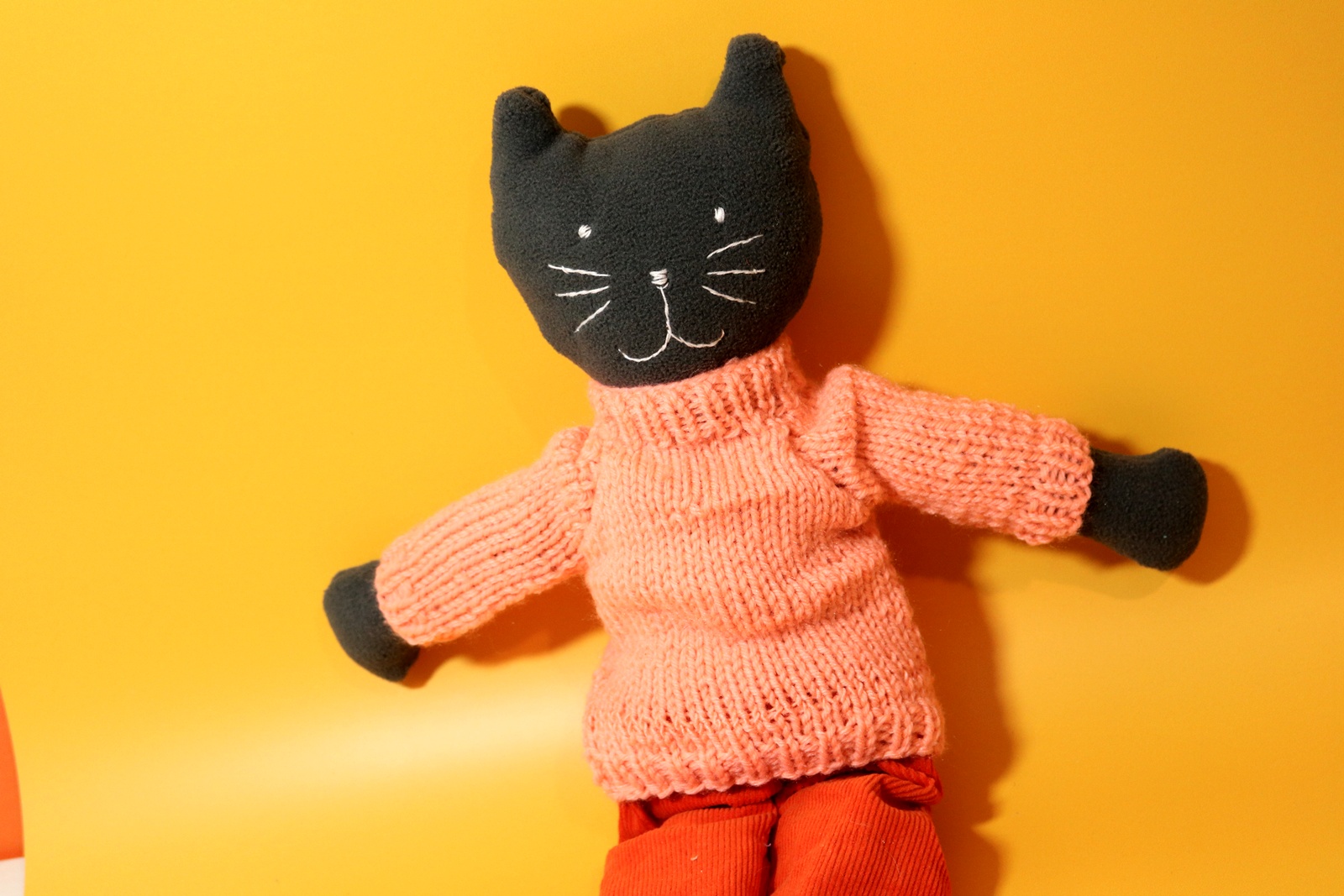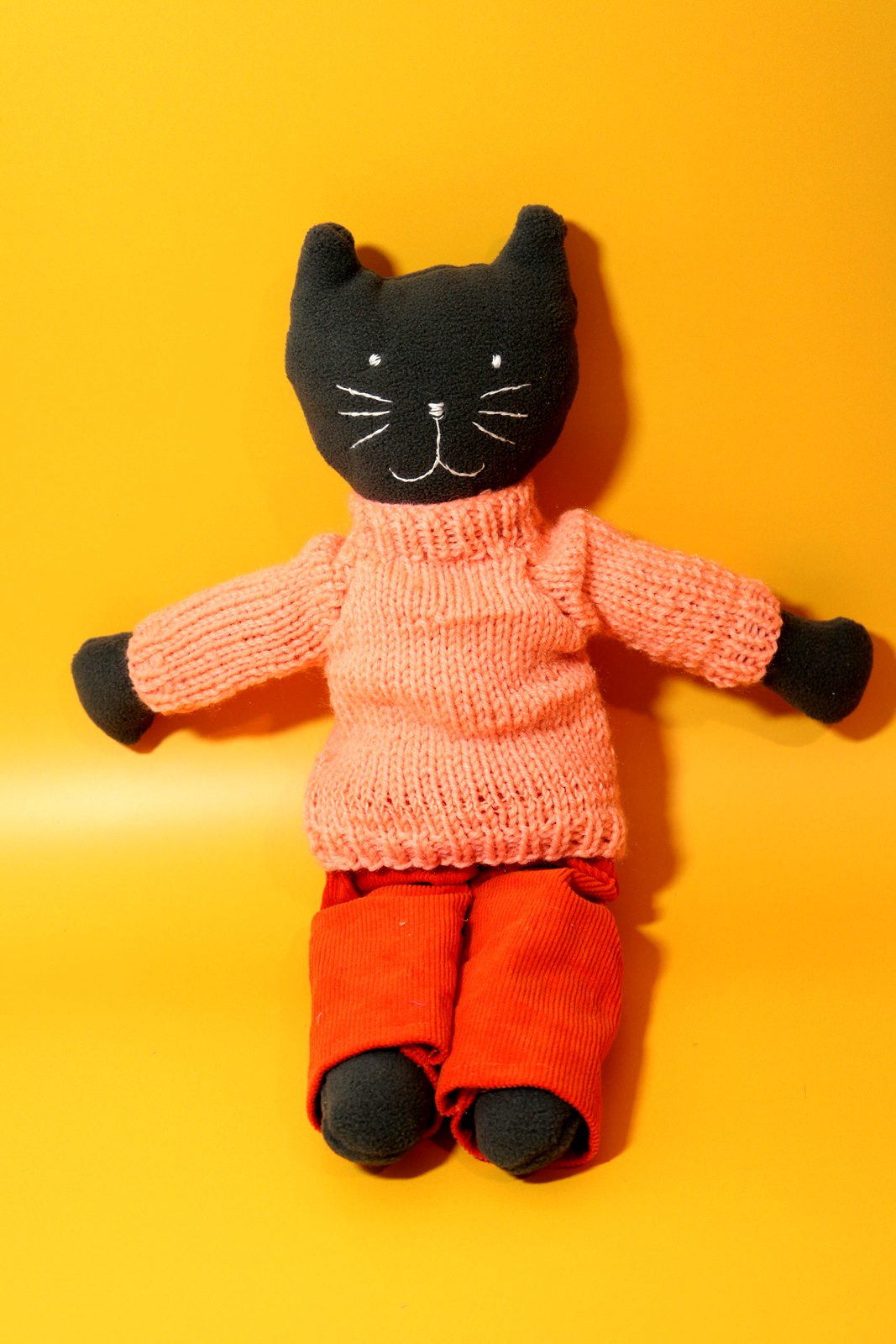 Maskotka wykonana z miękkiego polaru, sweter udziergany na drutach, a spodnie uszyte są ze sztruksu. Kot nie ma żadnych luźnych elementów.
