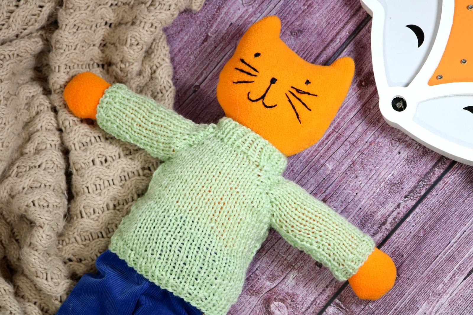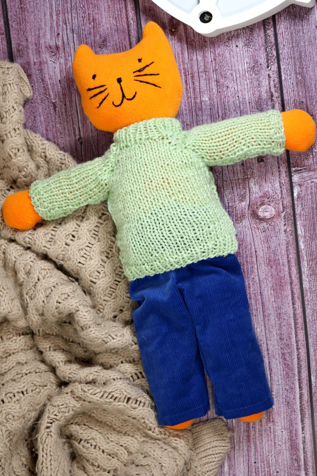 Maskotka wykonana z miękkiego polaru, sweter udziergany na drutach, a spodnie uszyte ze sztruksu. Kot nie ma żadnych luźnych elementów.