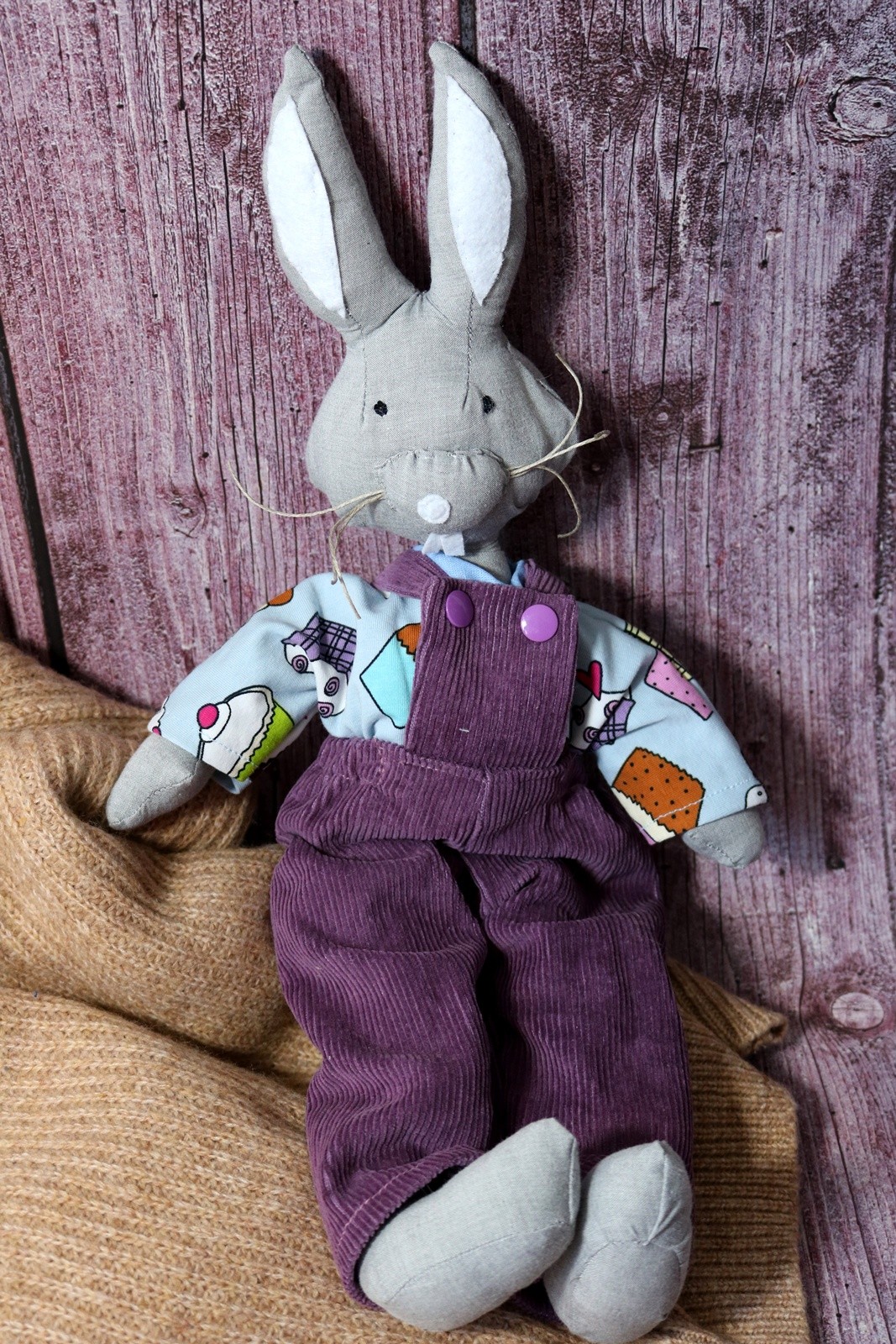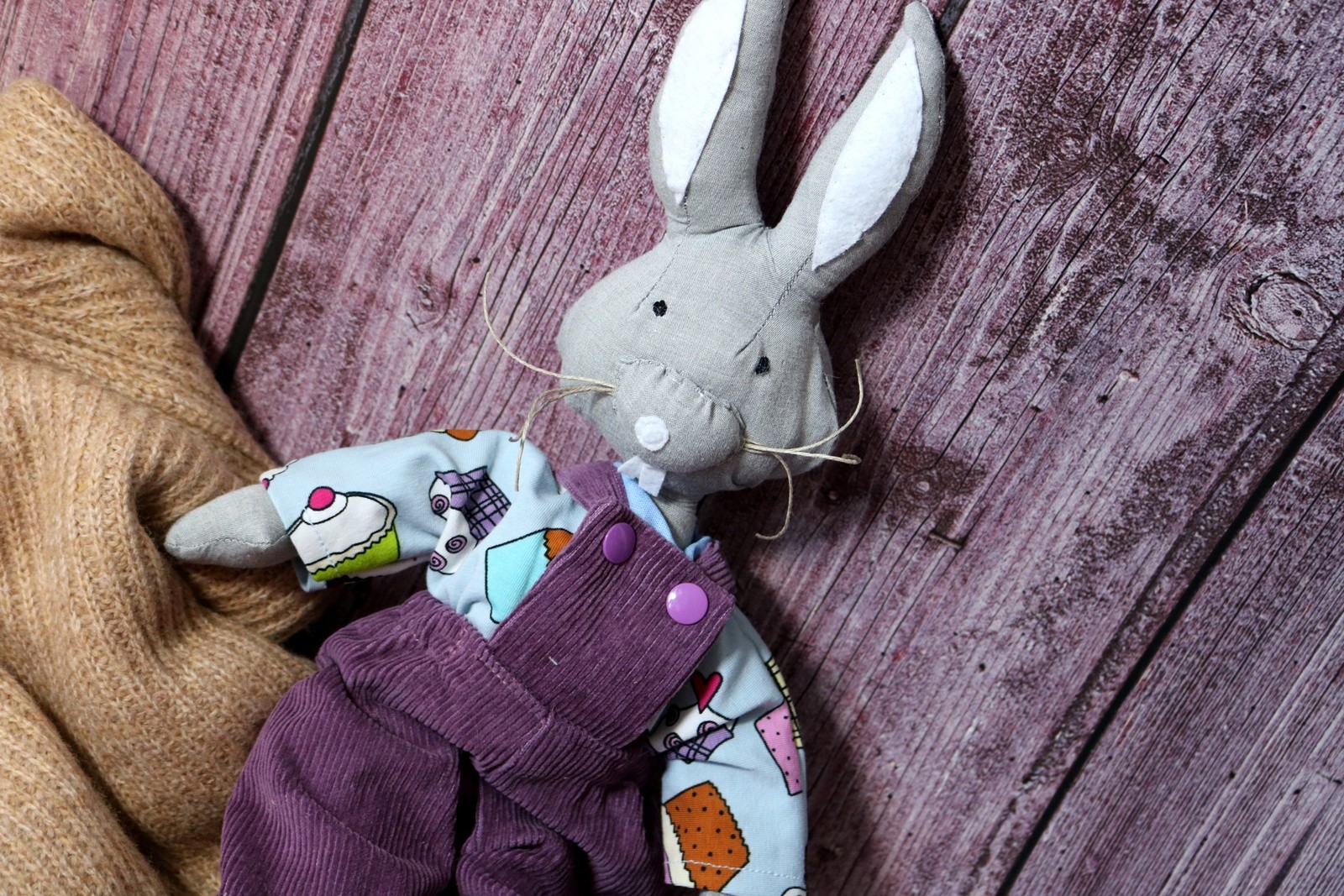 Królik Przemek jest uszyty z lnu z dodatkiem bawełny. Wypełniony granulatem sylikonowym, antyalergicznym, którego sprężystość gwarantuje brak zbijania się w środku grudek, nawet po wypraniu.