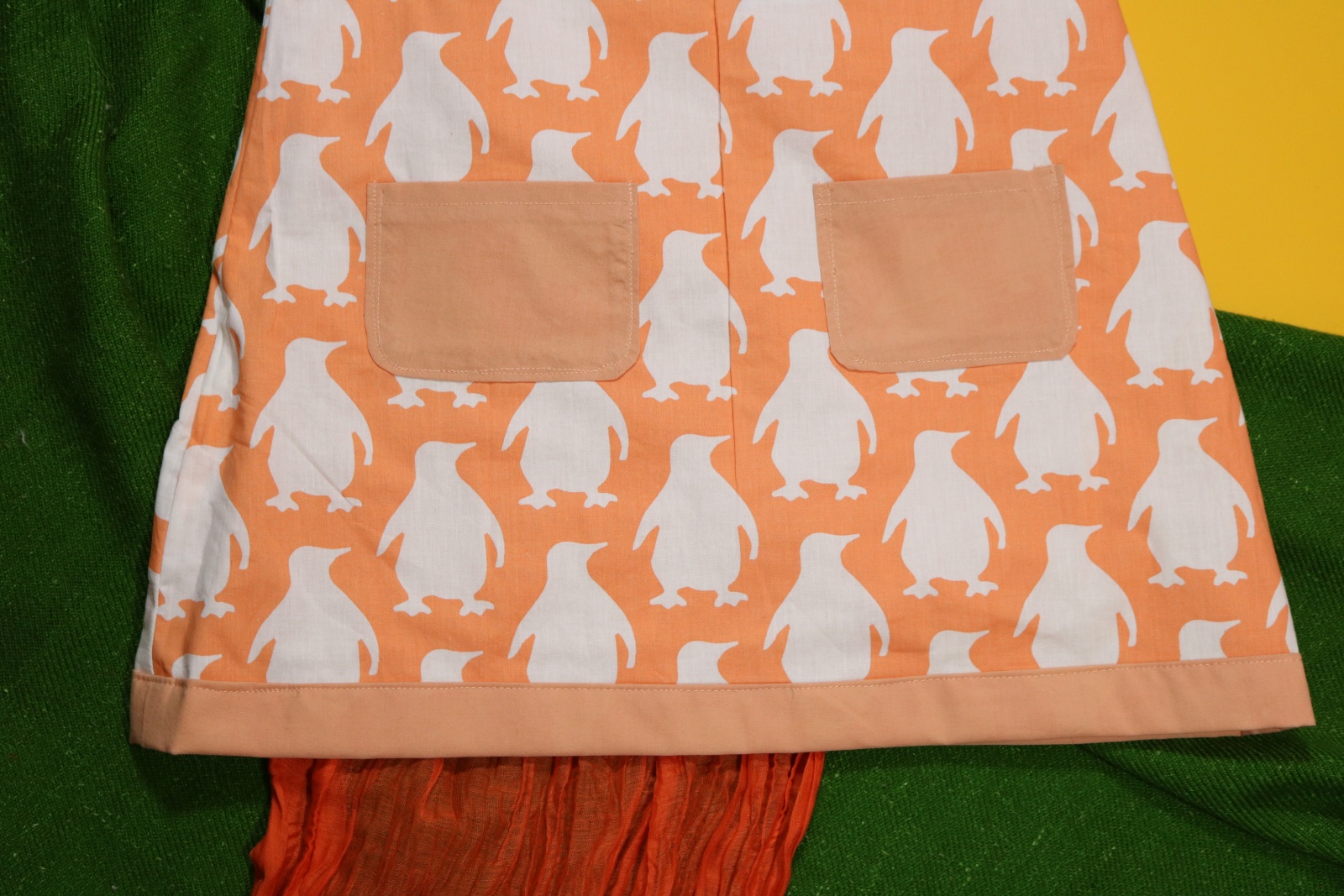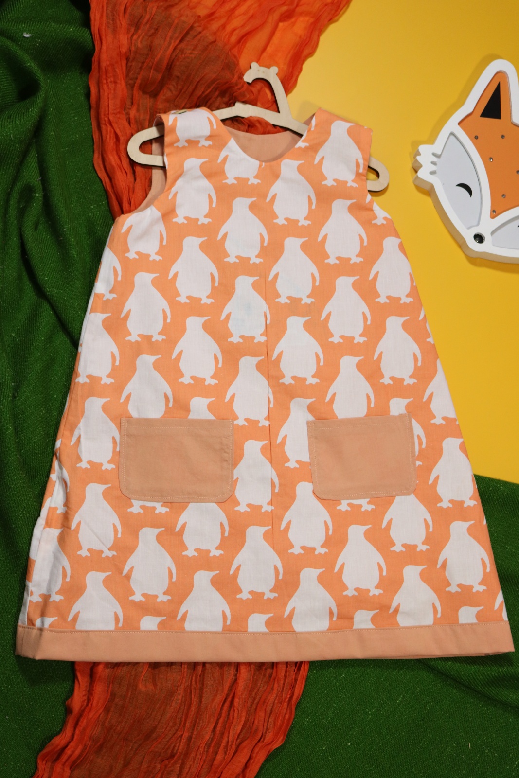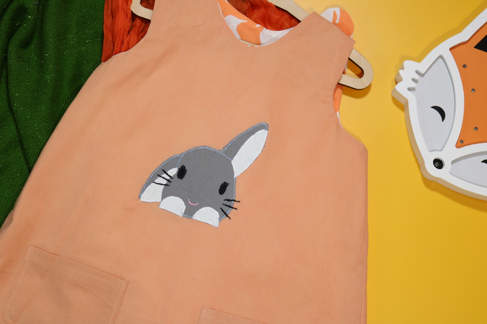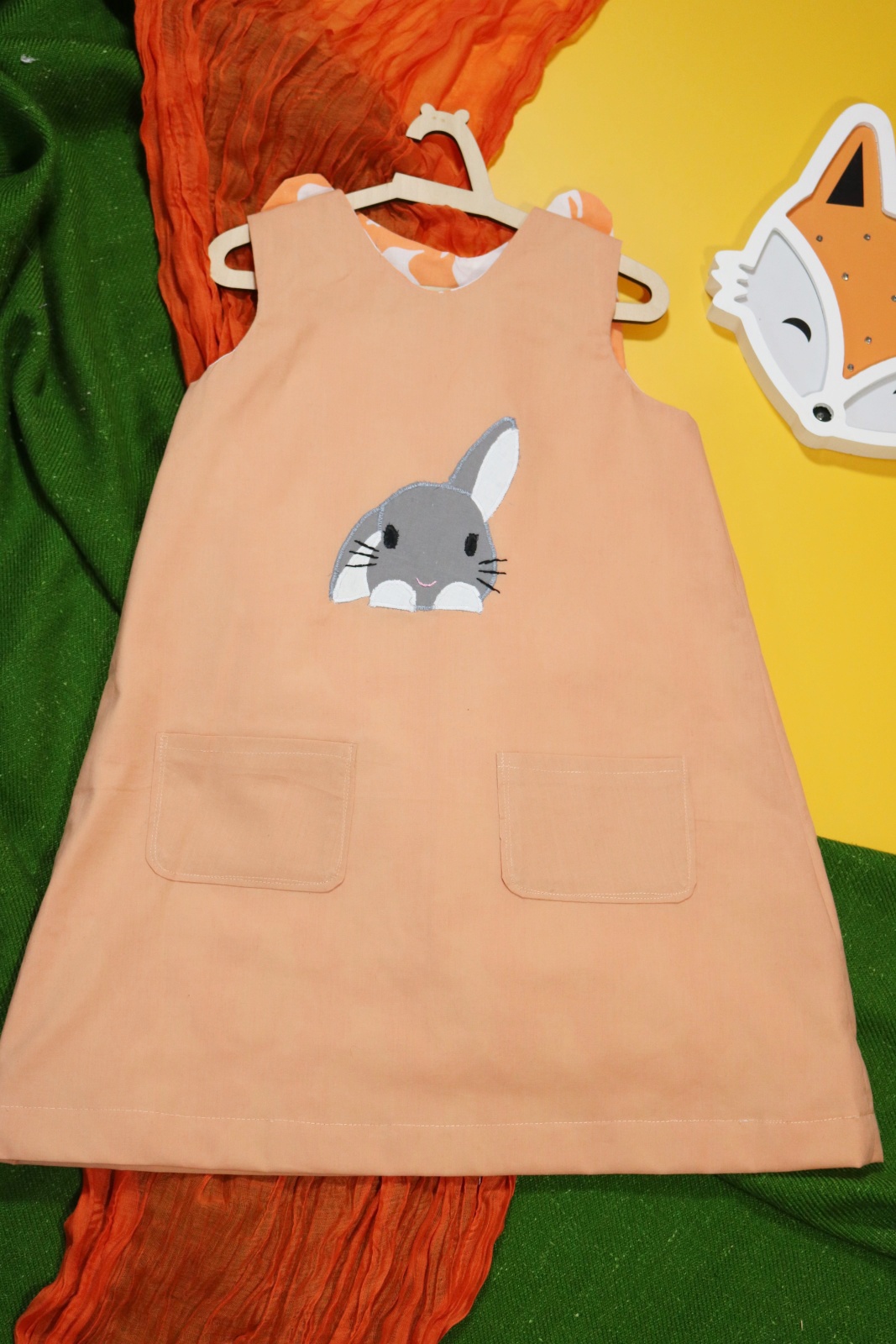Sukienka wykonana w całości z bawełny (zdekatyzowanej przed uszyciem – sukienka nie skurczy się po praniu). Zapinana na guziki z obu stron, na każdej z nich naszyte także dwie kieszonki. Na pierwszej stronie naszyta aplikacja z królikiem.