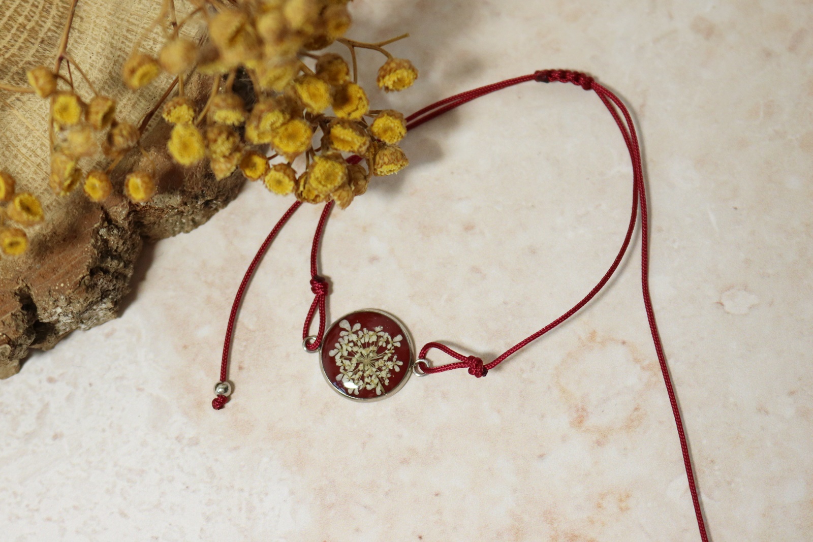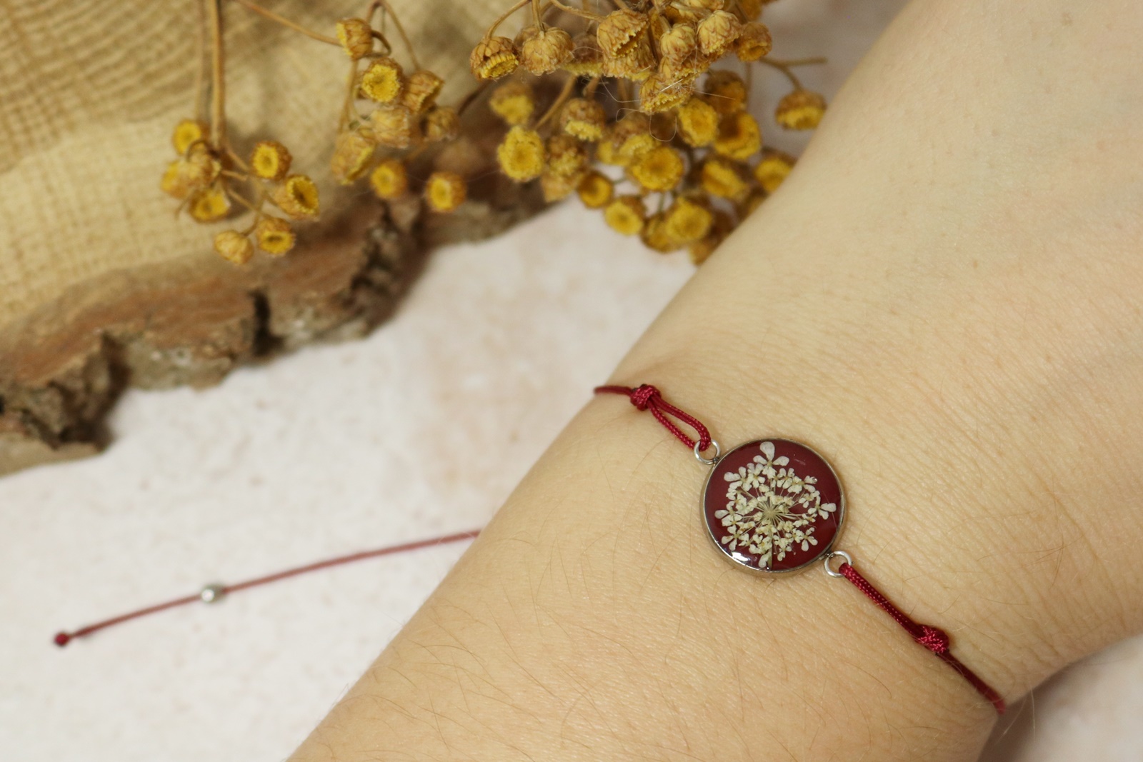Delikatna bransoletka z oczkiem ze stali chirurgicznej, w którym zatopiłam kwiat dzikiej marchwi na tle w kolorze bordowym. Oczko pokryte krystalicznie przezroczystą żywicą.