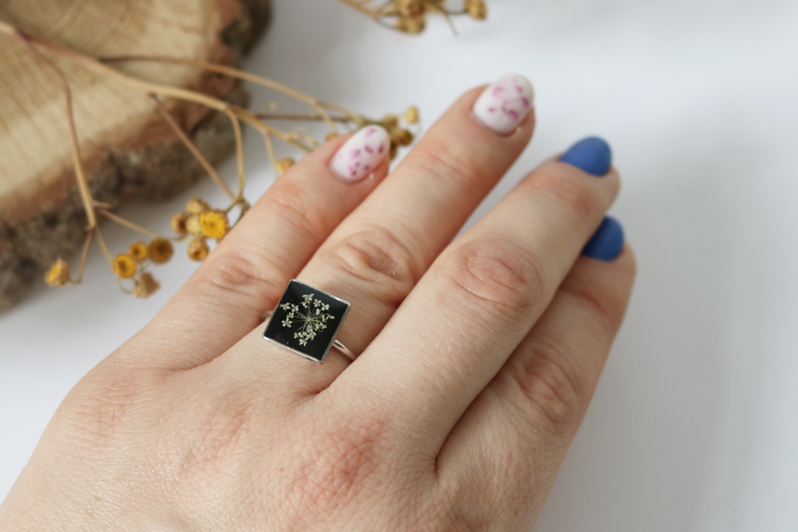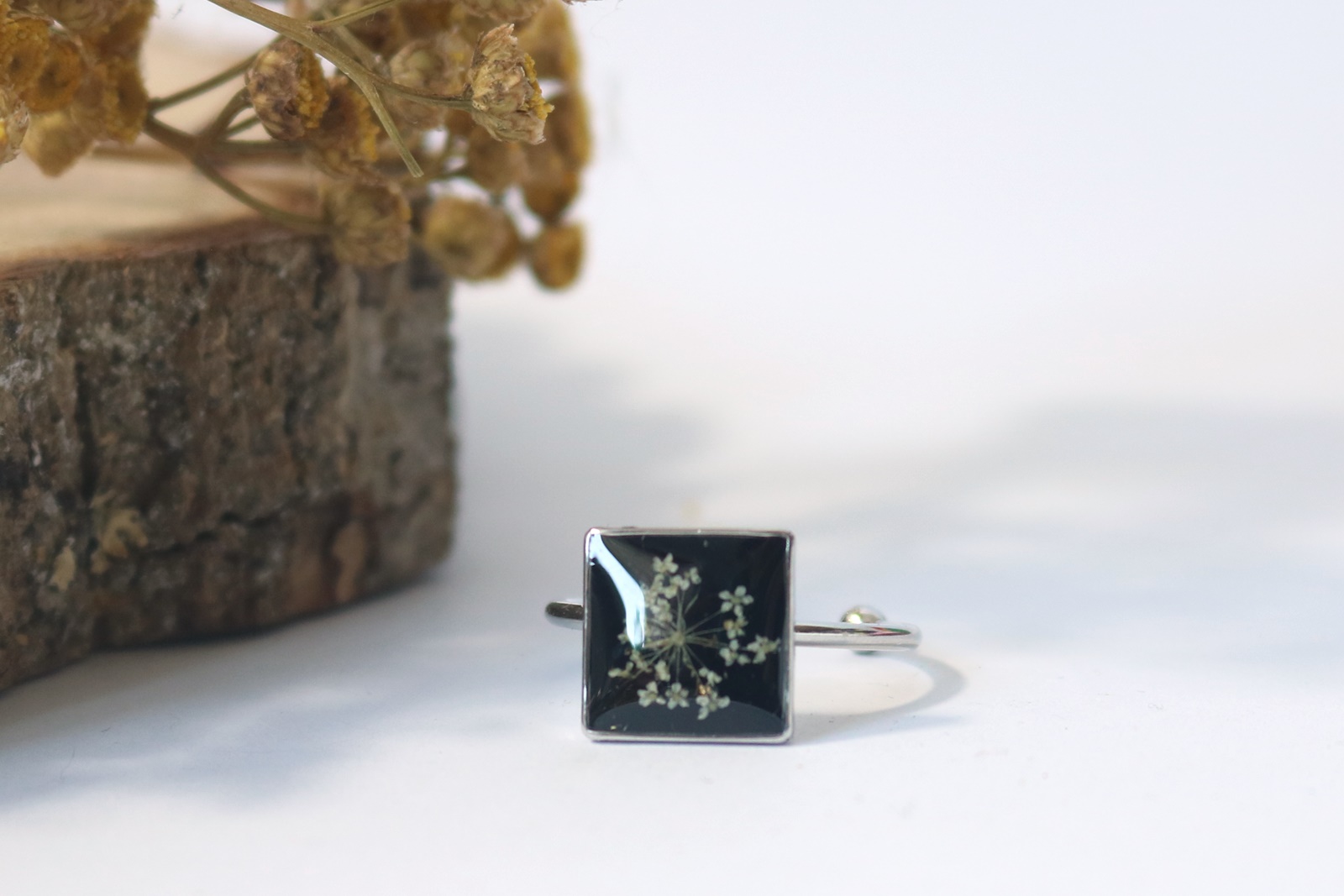 Kwiat dzikiej marchwi zatopiłam w żywicy zabarwionej na kolor czarny. Z wierzchu krystaliczna żywica nadaje trójwymiarowości.