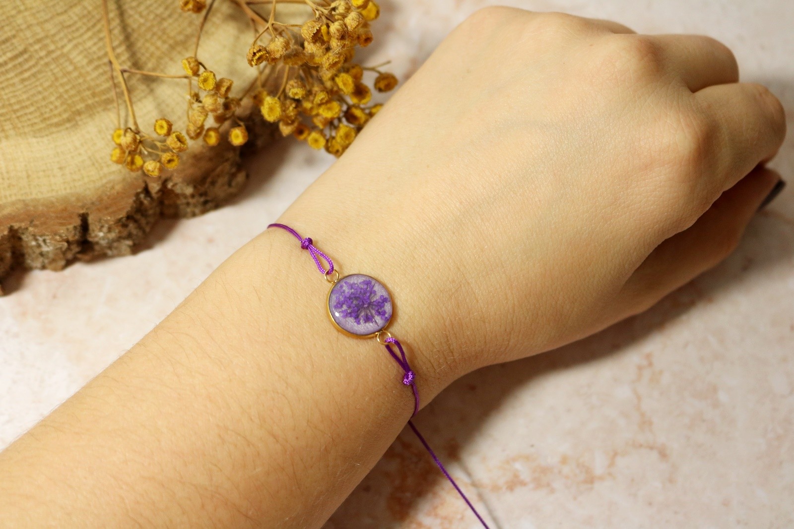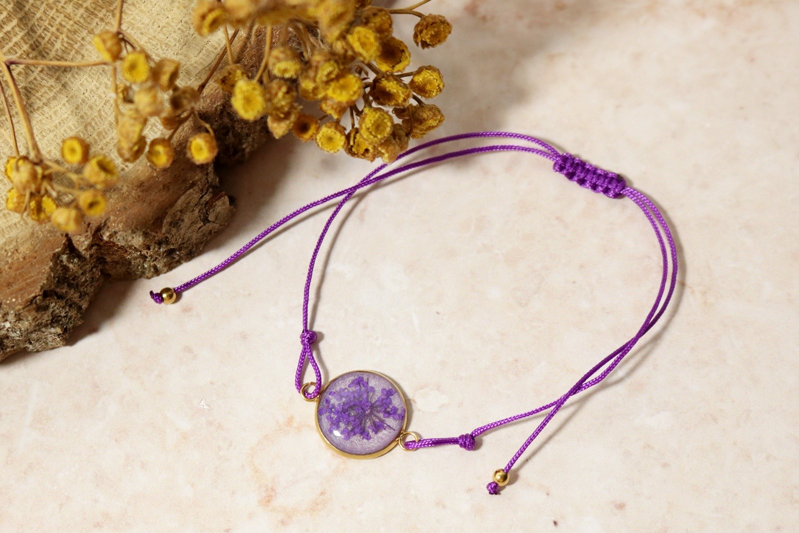 Delikatna bransoletka z oczkiem ze stali chirurgicznej, w którym zatopiłam kwiat dzikiej marchwi na tle wrzosowym perłowym. Oczko pokryte krystalicznie przezroczystą żywicą.