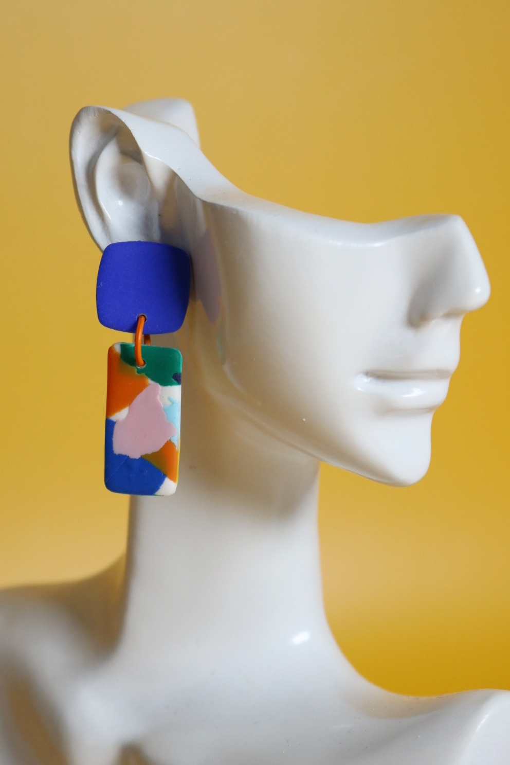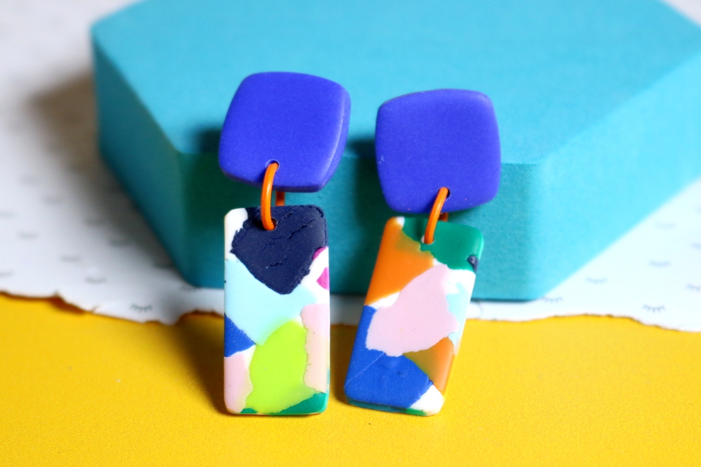 Kolczyki wykonane są z masy polimerowej – wyciętej w drobne kształty, z wzorami w kontrastowych kolorach.