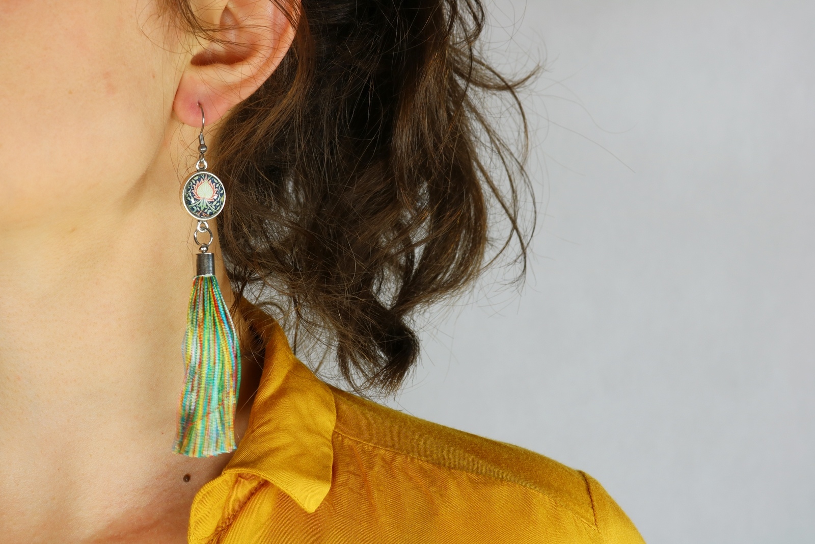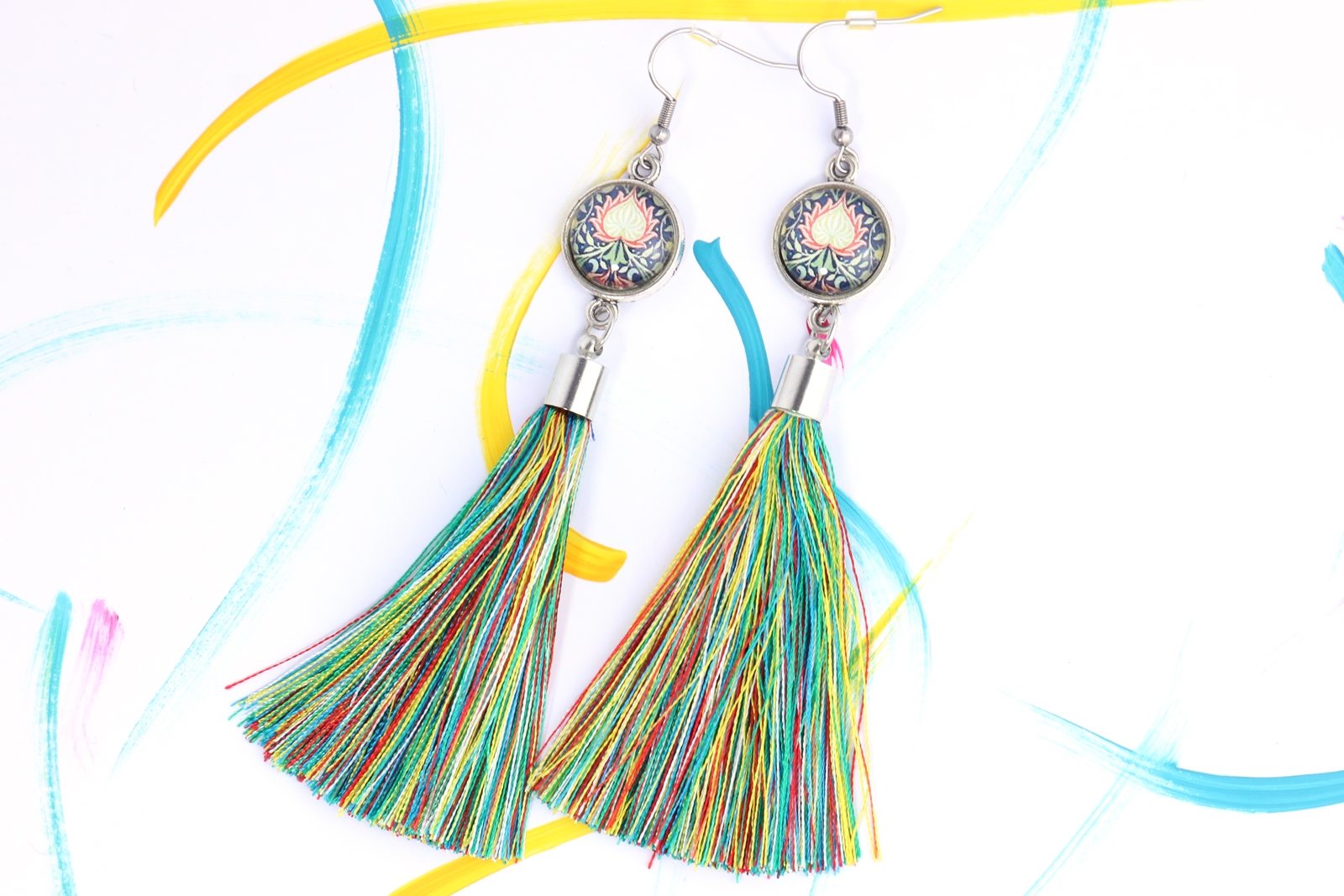 Zawieszone na biglach w kolorze srebrnym, ze stali chirurgicznej (nie uczula – idealna dla osób uczulonych na sztuczną biżuterię, czy też srebro), w środku oczko z grafiką, a na dole chwost z wiskozy.
