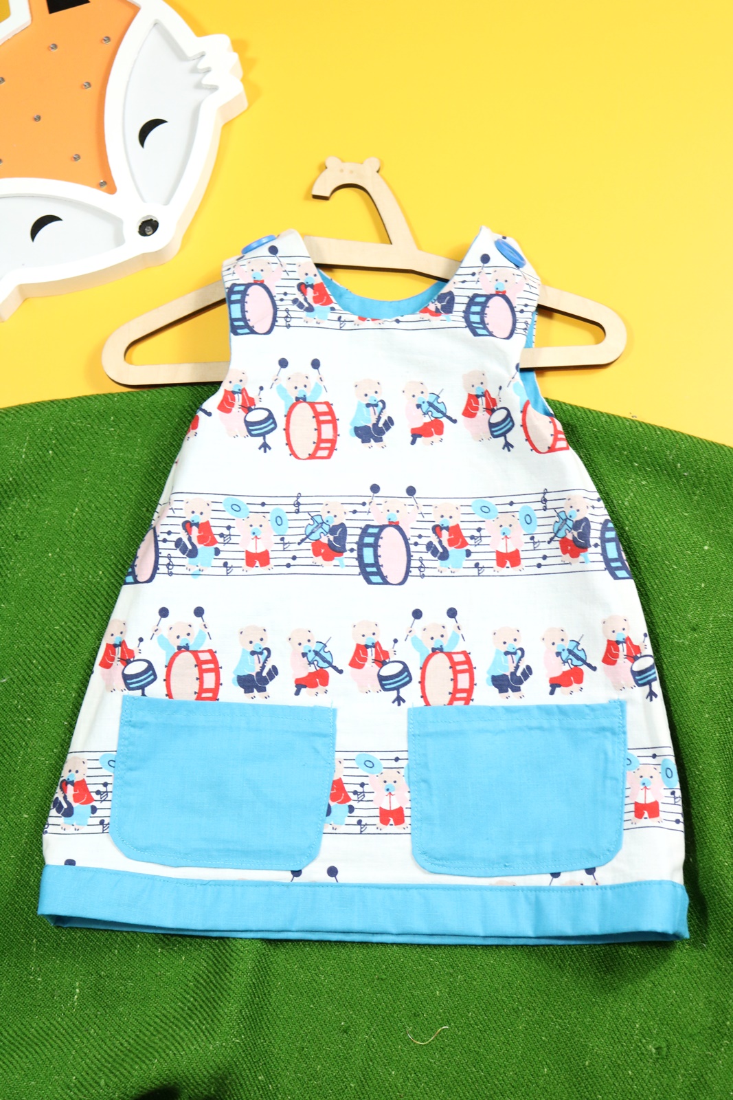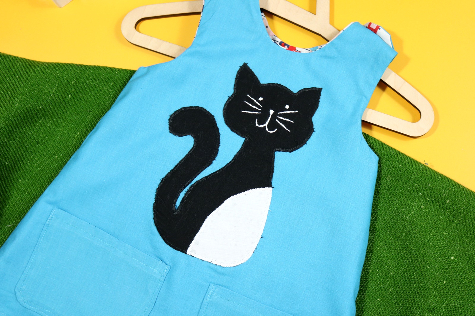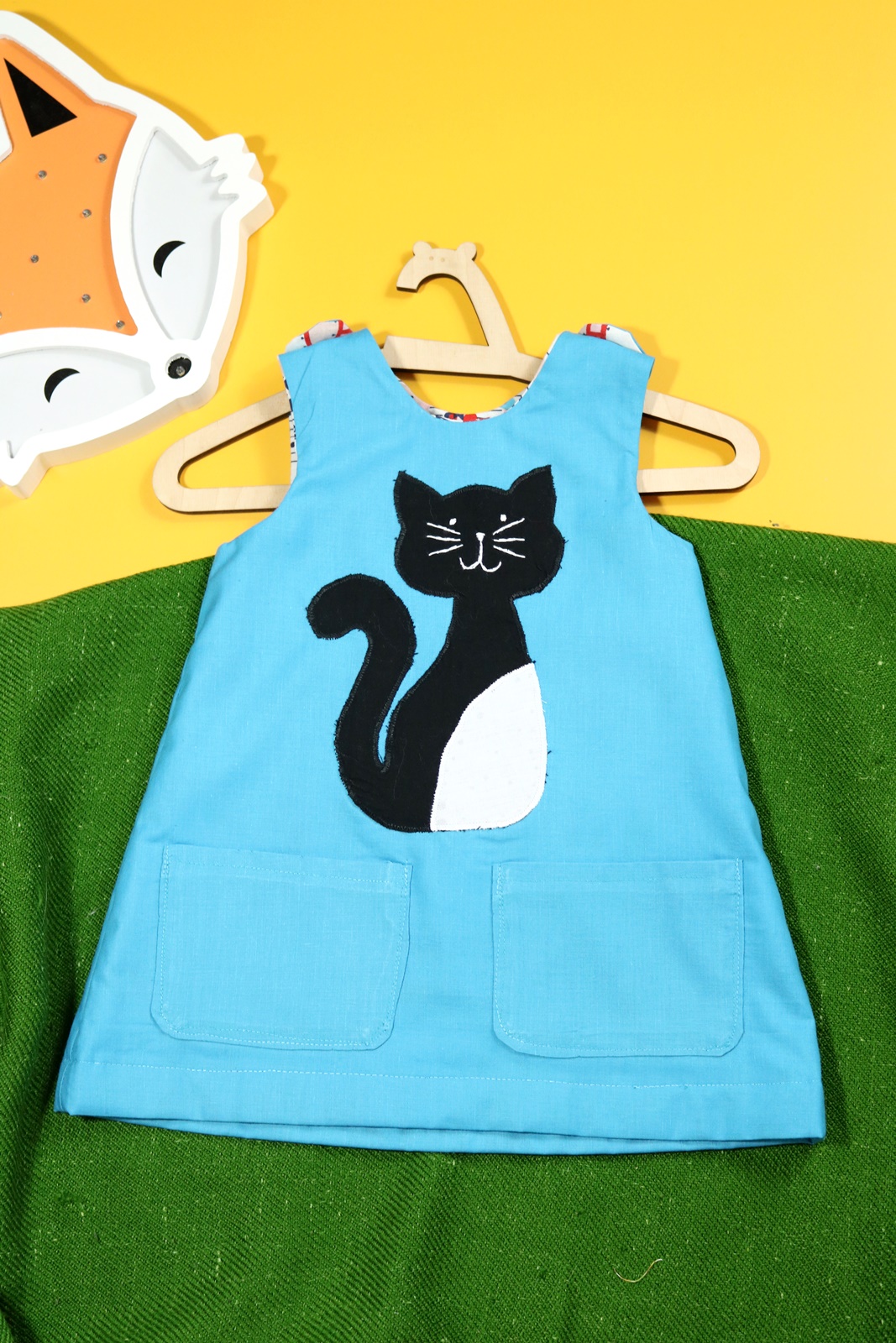 Sukienka wykonana w całości z bawełny (zdekatyzowanej przed uszyciem – sukienka nie skurczy się po praniu). Zapinana na guziki z obu stron, na każdej z nich naszyte także dwie kieszonki. Na pierwszej stronie naszyta aplikacja z kotkiem.