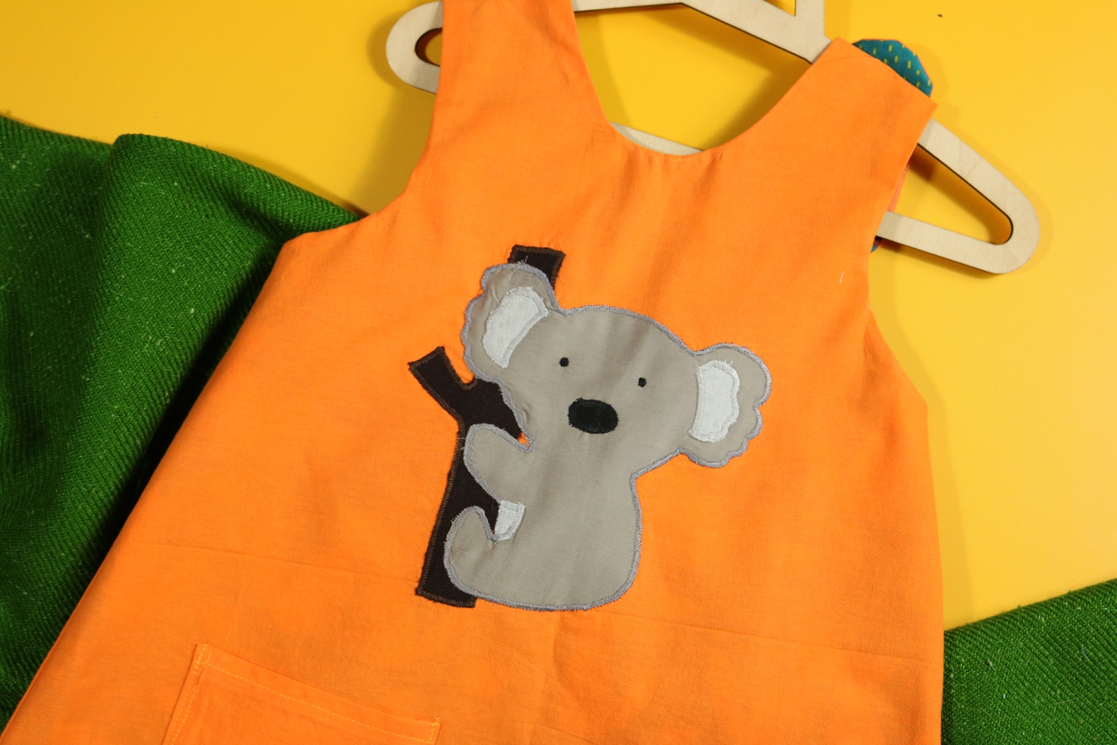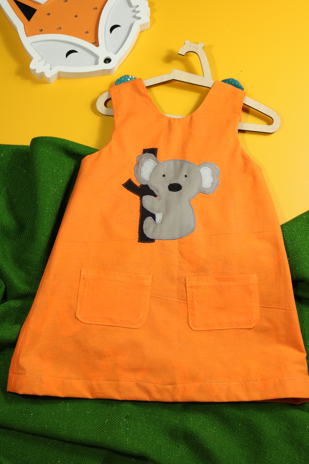 Sukienka wykonana z bawełny (zdekatyzowanej przed uszyciem – sukienka nie skurczy się po praniu). Zapinana na guziki z obu stron, na każdej z nich naszyte także dwie kieszonki. Na pierwszej stronie naszyta aplikacja z koalą.