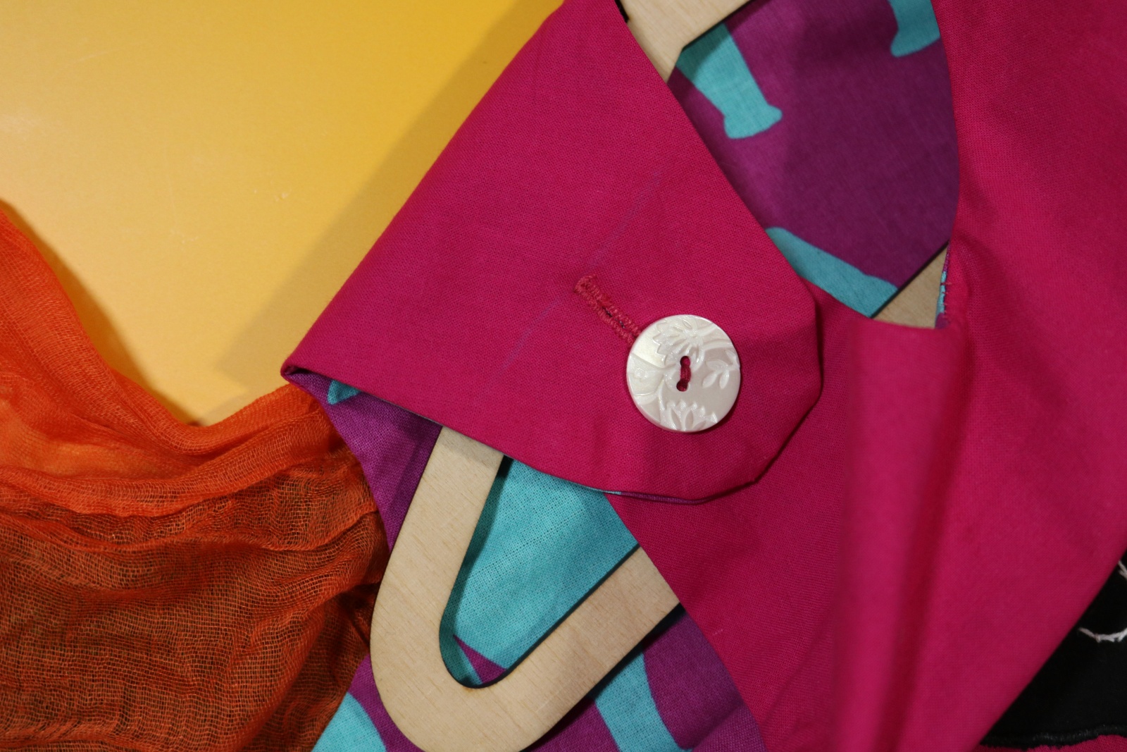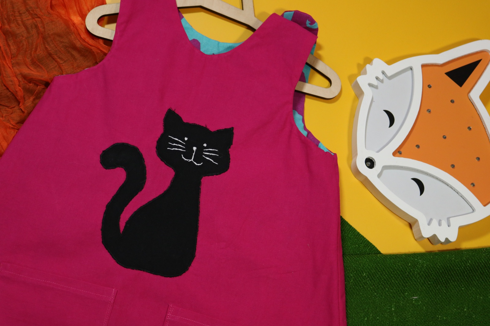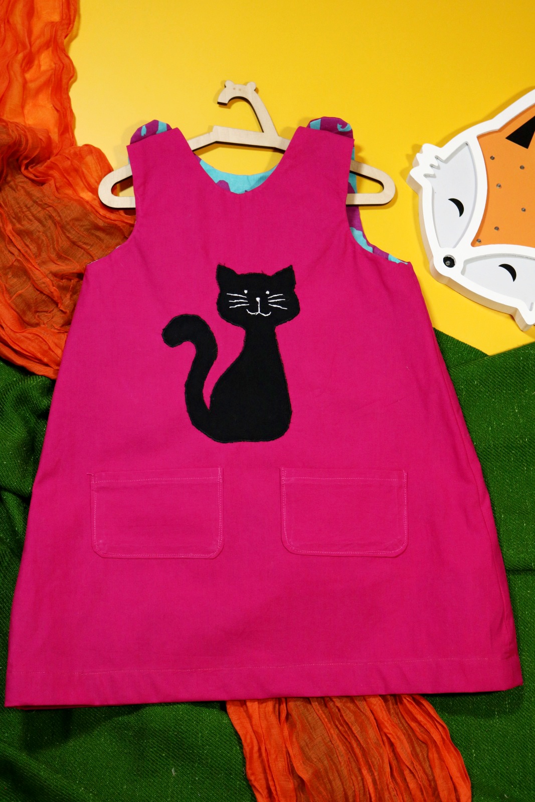 Sukienka wykonana w całości z bawełny (zdekatyzowanej przed uszyciem – sukienka nie skurczy się po praniu). Zapinana na guziki z obu stron, na każdej z nich naszyte także dwie kieszonki. Na pierwszej stronie naszyta aplikacja z kotkiem.