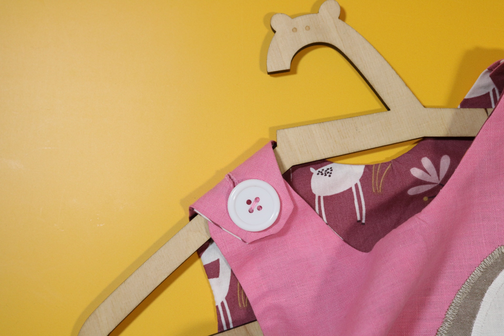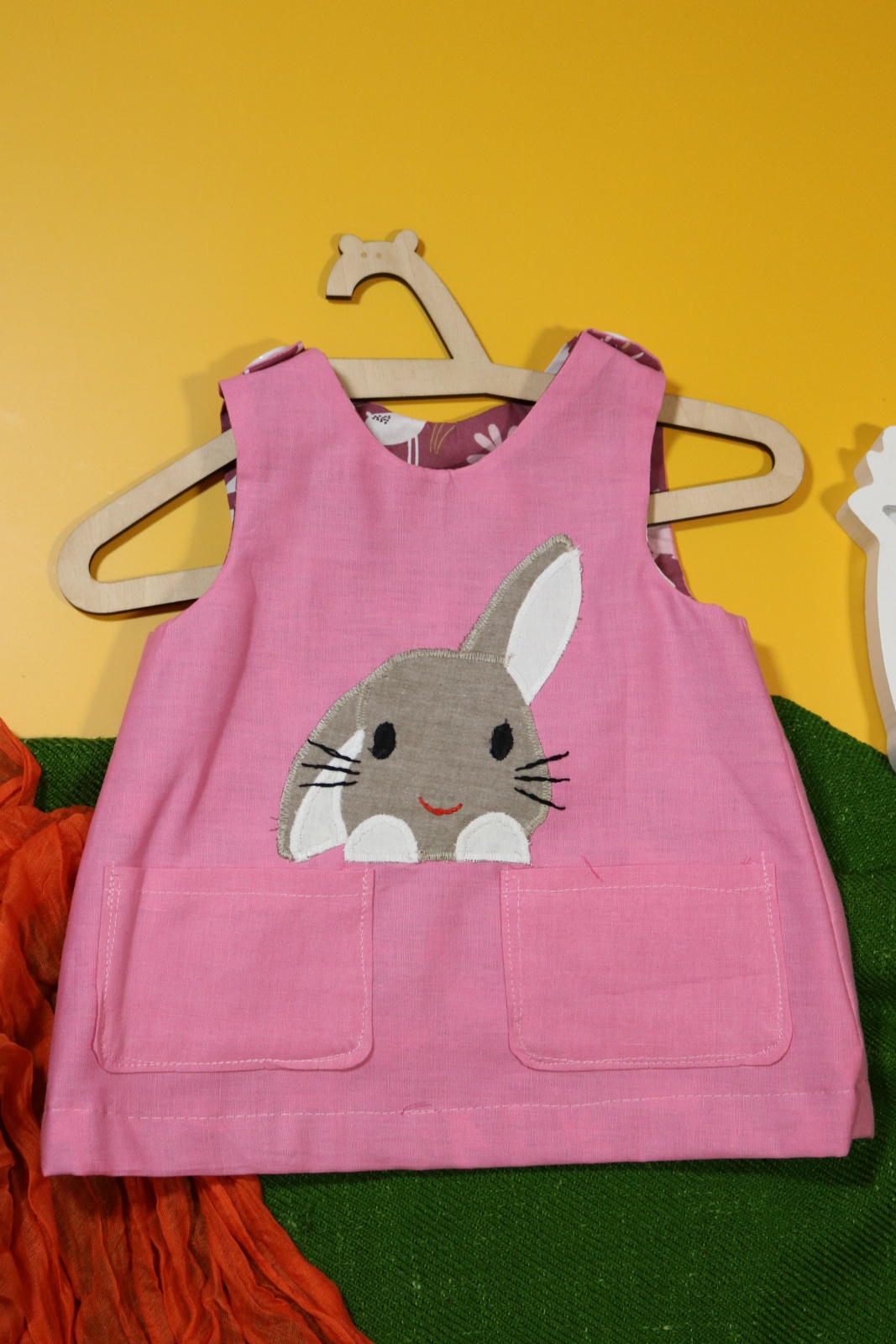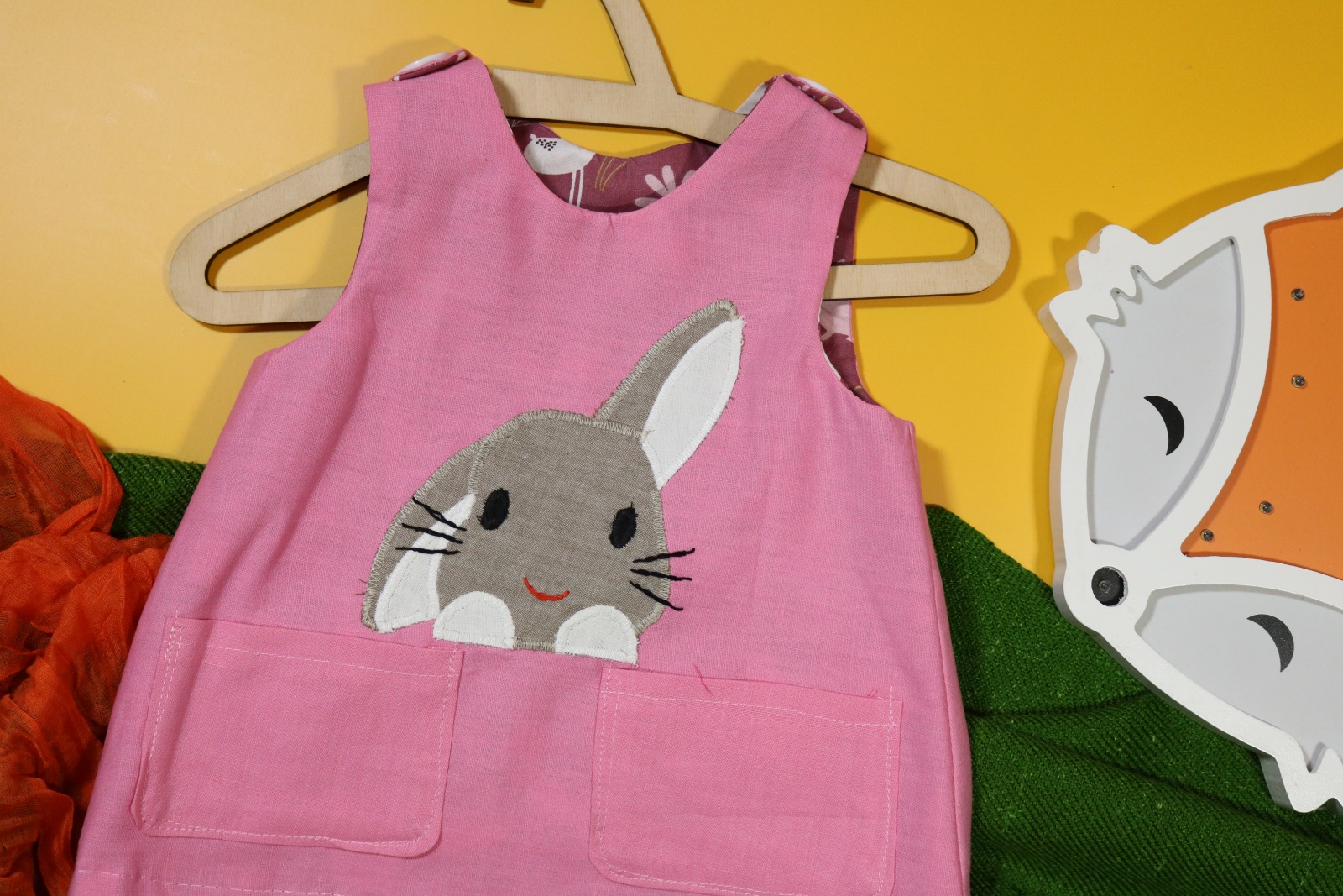 Sukienka wykonana w całości z bawełny (zdekatyzowanej przed uszyciem – sukienka nie skurczy się po praniu). Zapinana na guziki z obu stron, na każdej z nich naszyte także dwie kieszonki. Na pierwszej stronie naszyta aplikacja z królikiem.
