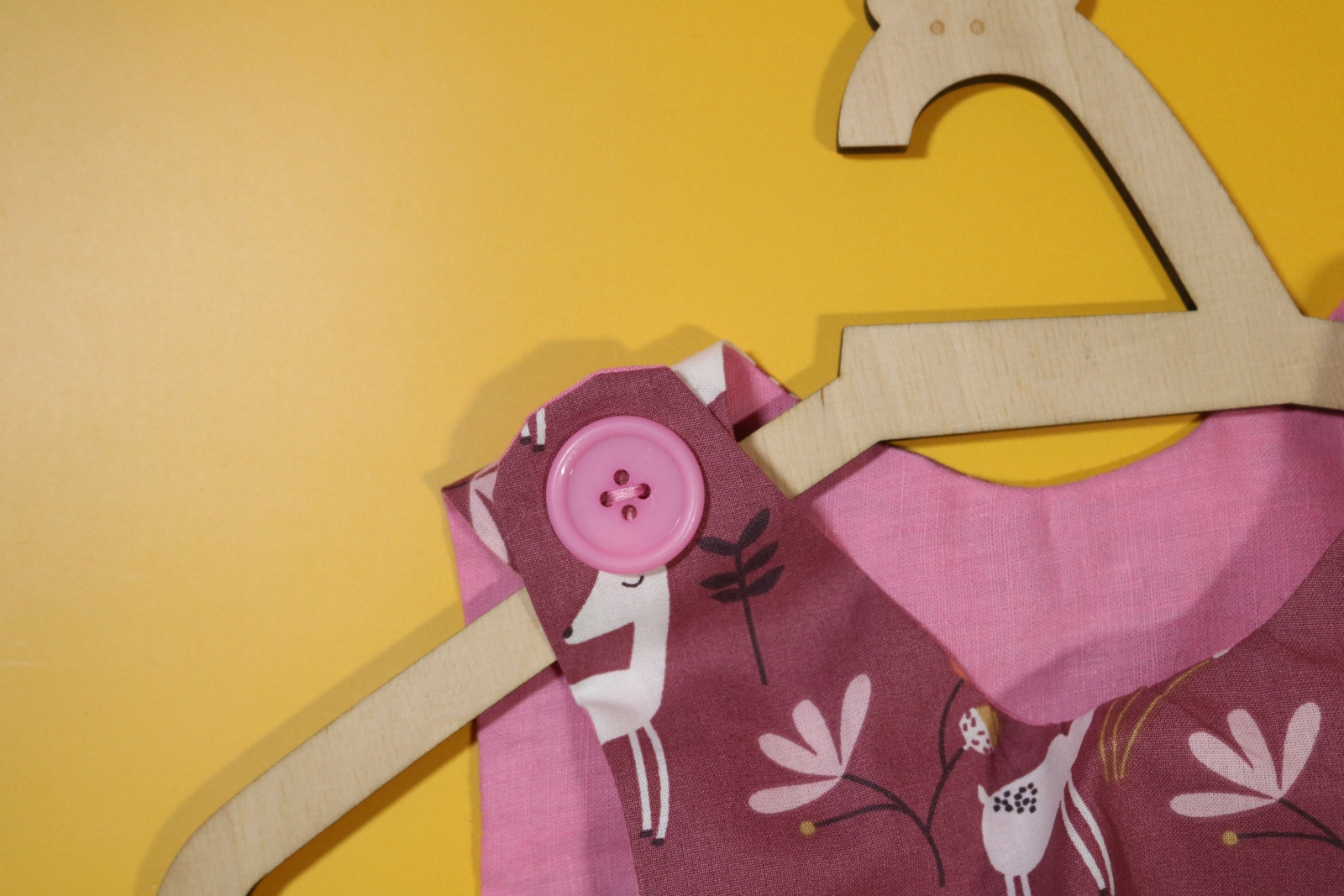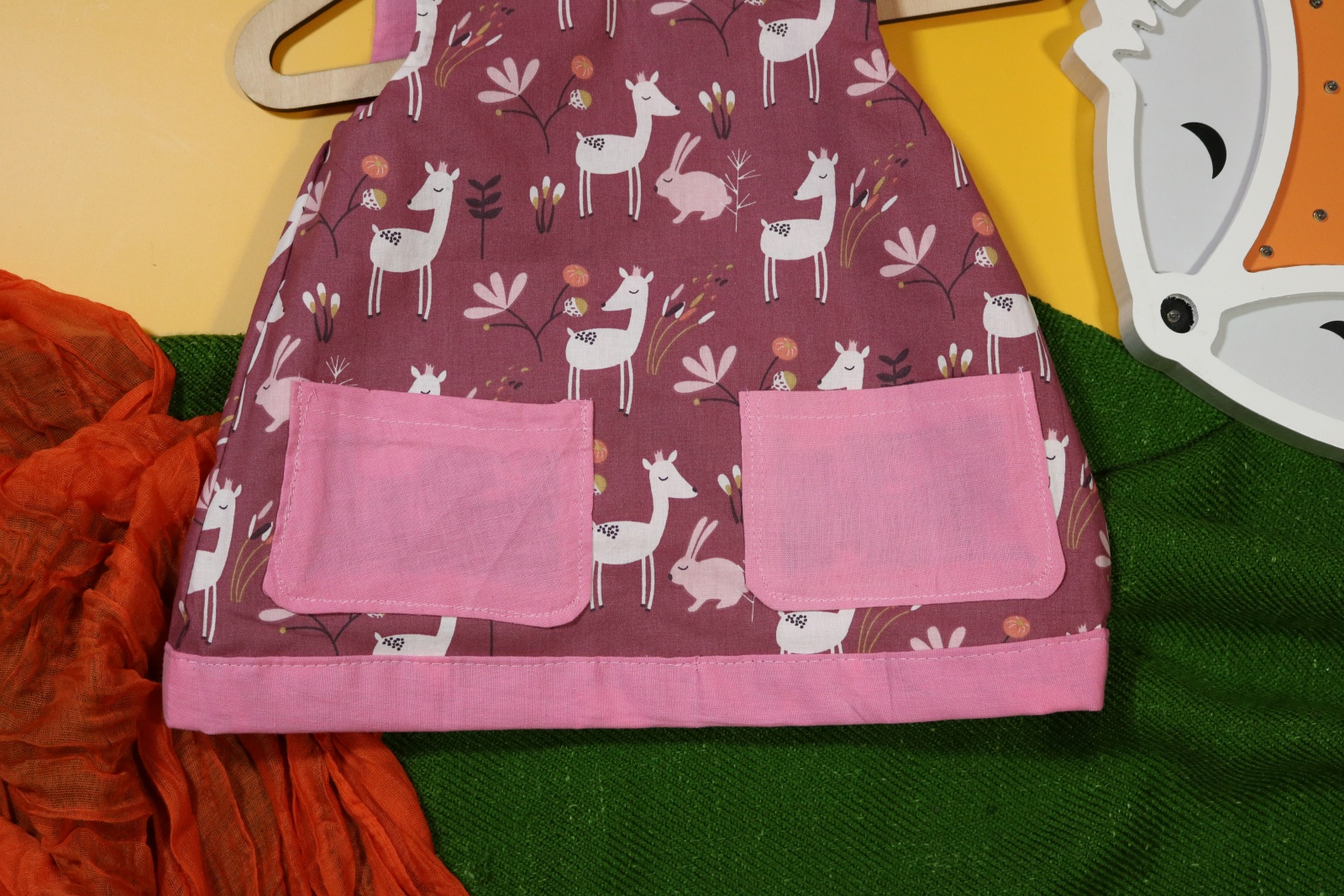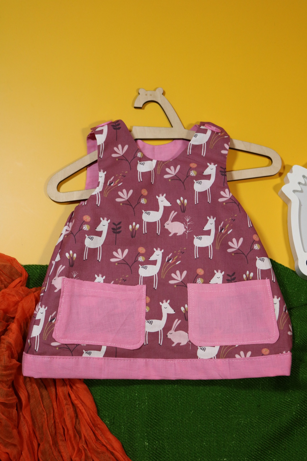 Sukienka wykonana w całości z bawełny (zdekatyzowanej przed uszyciem – sukienka nie skurczy się po praniu). Zapinana na guziki z obu stron, na każdej z nich naszyte także dwie kieszonki. Na pierwszej stronie naszyta aplikacja z królikiem.