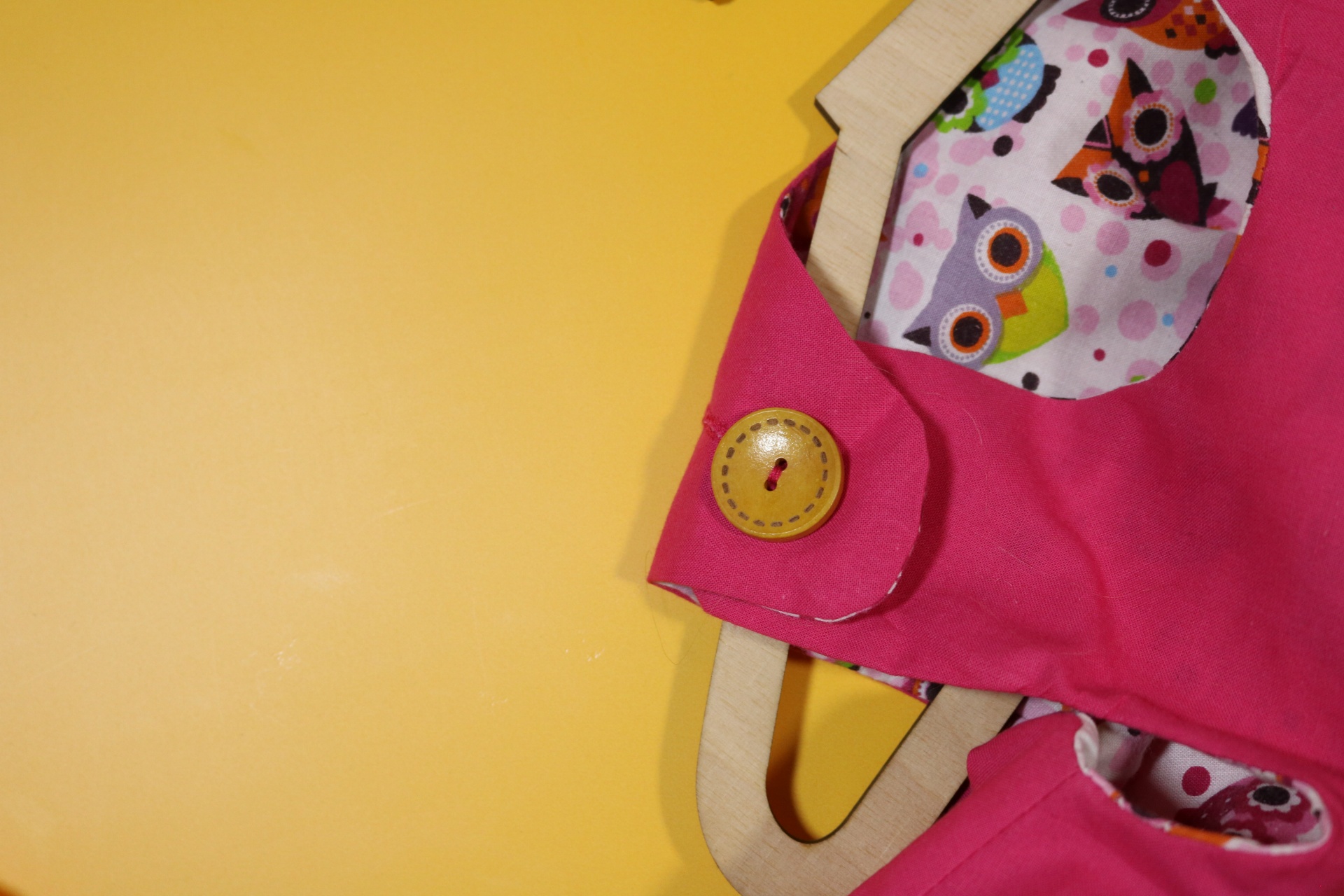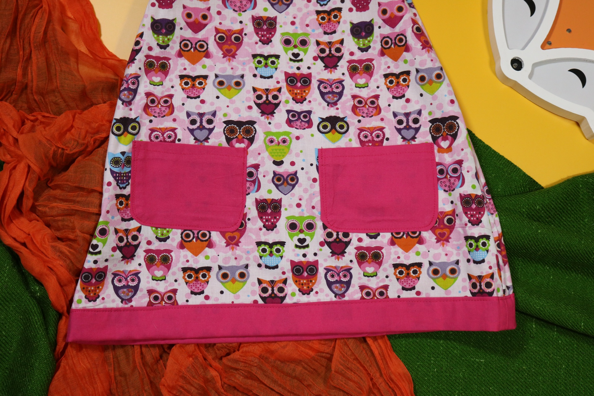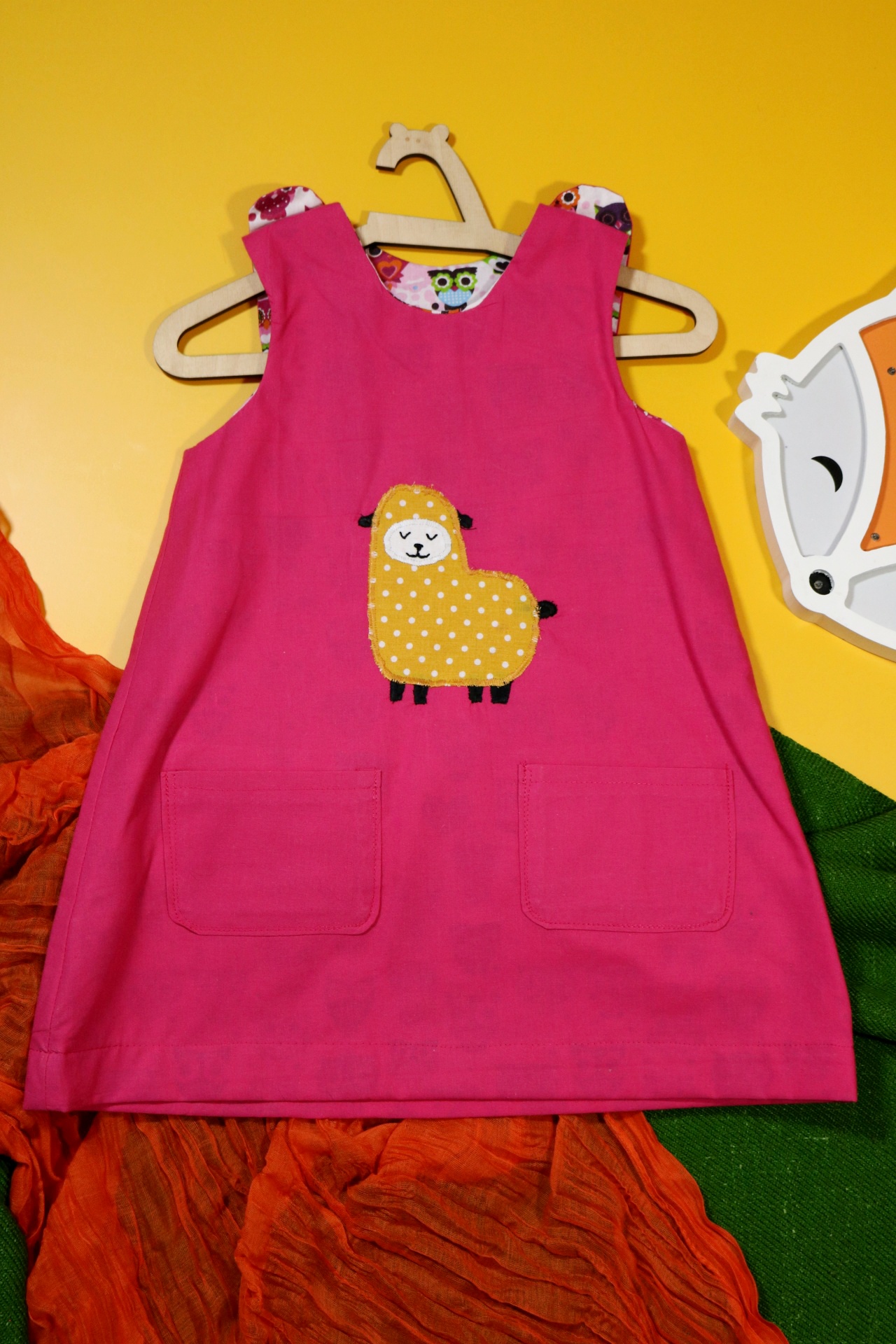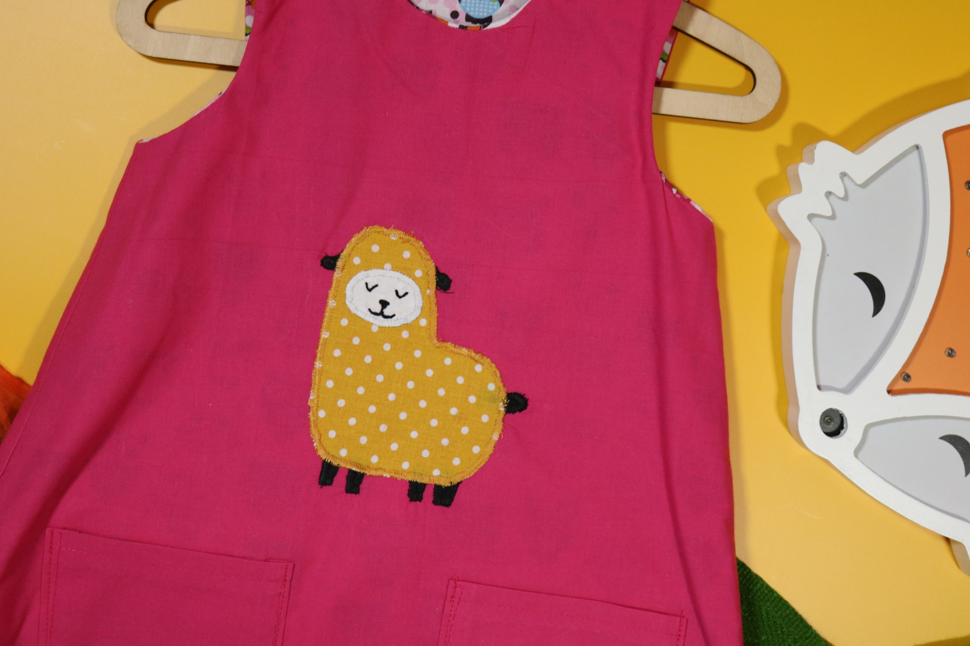 Sukienka wykonana w całości z bawełny (zdekatyzowanej przed uszyciem – sukienka nie skurczy się po praniu). Zapinana na guziki z obu stron, na każdej z nich naszyte także dwie kieszonki. Na pierwszej stronie naszyta aplikacja z owieczką.