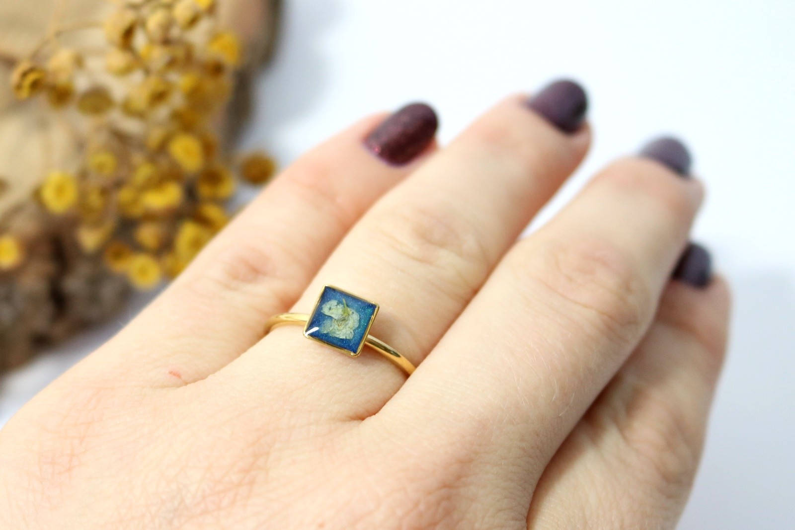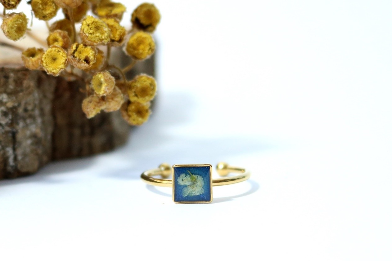 Kwiat smagliczki zatopiłam w żywicy zabarwionej na kolor perłowy granatowy. Z wierzchu krystaliczna żywica nadaje trójwymiarowości.