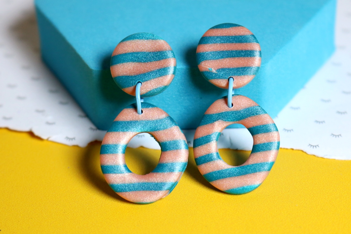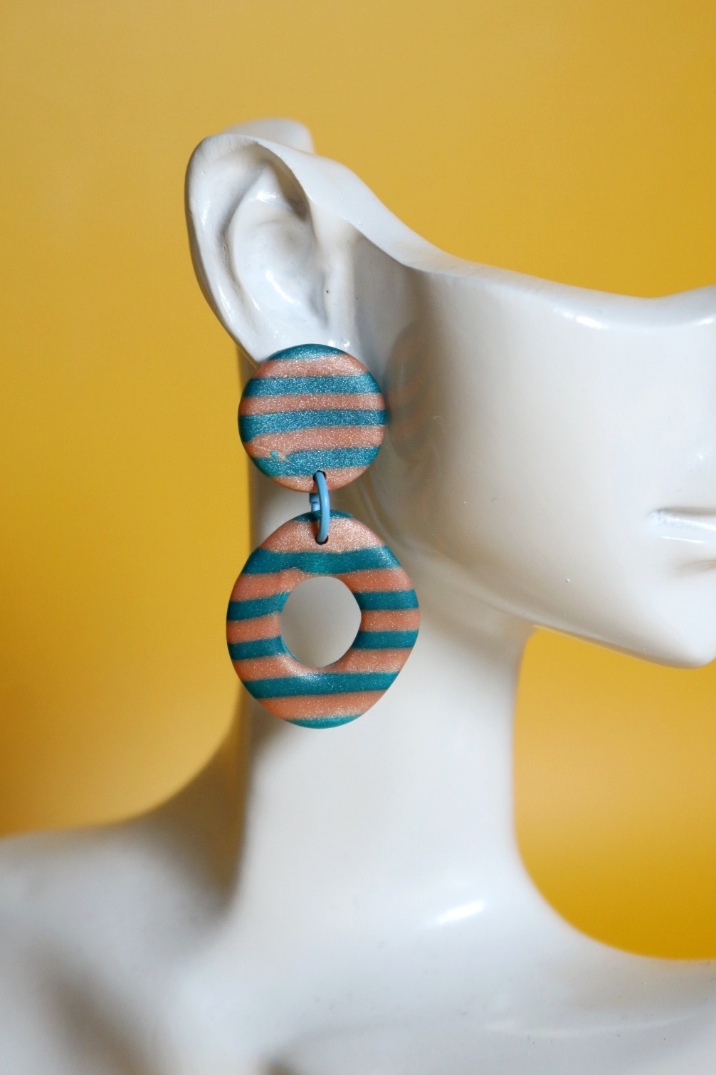 Kolczyki wykonane są z masy polimerowej – wyciętej w drobne kształty, z wzorami w kontrastowych kolorach.