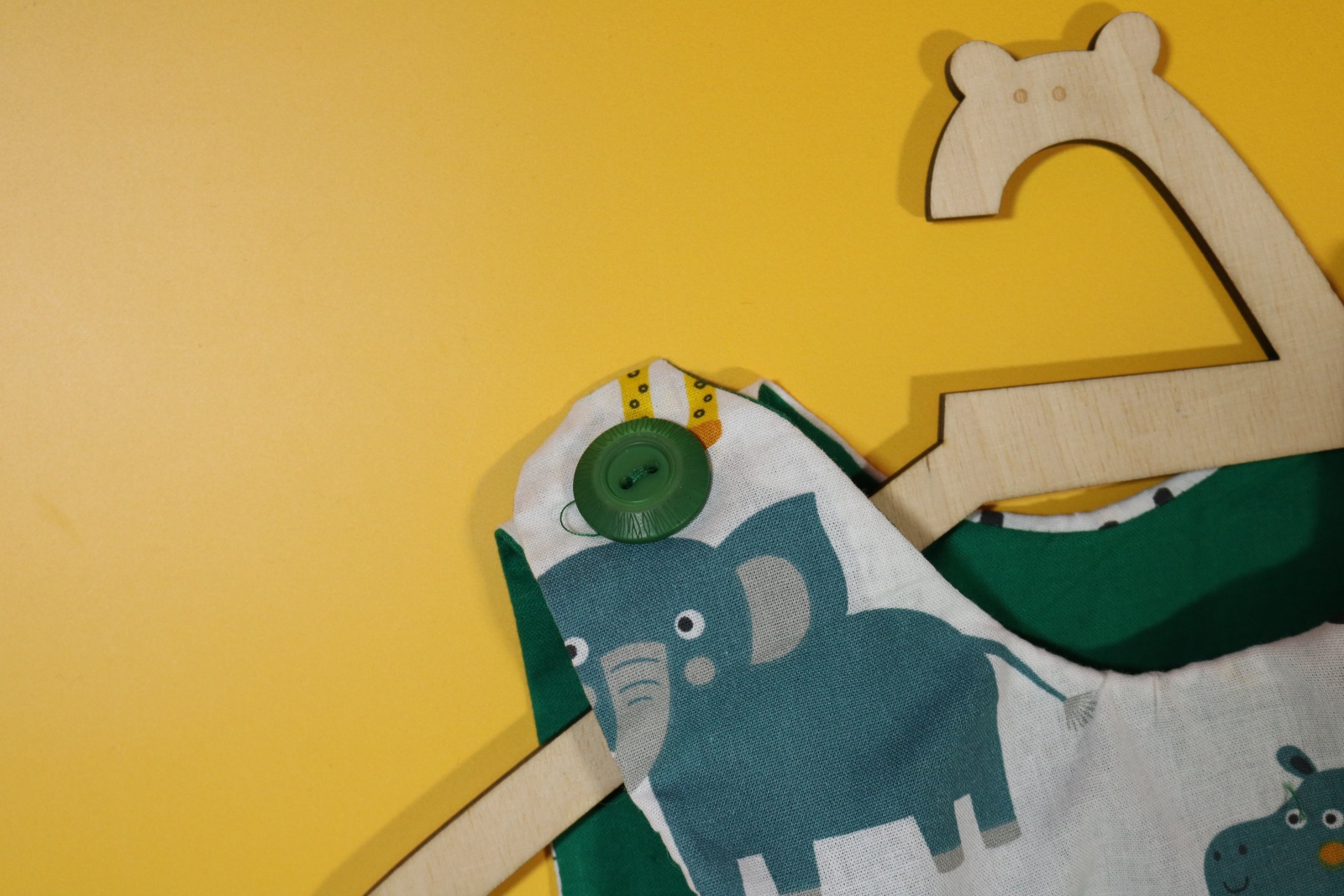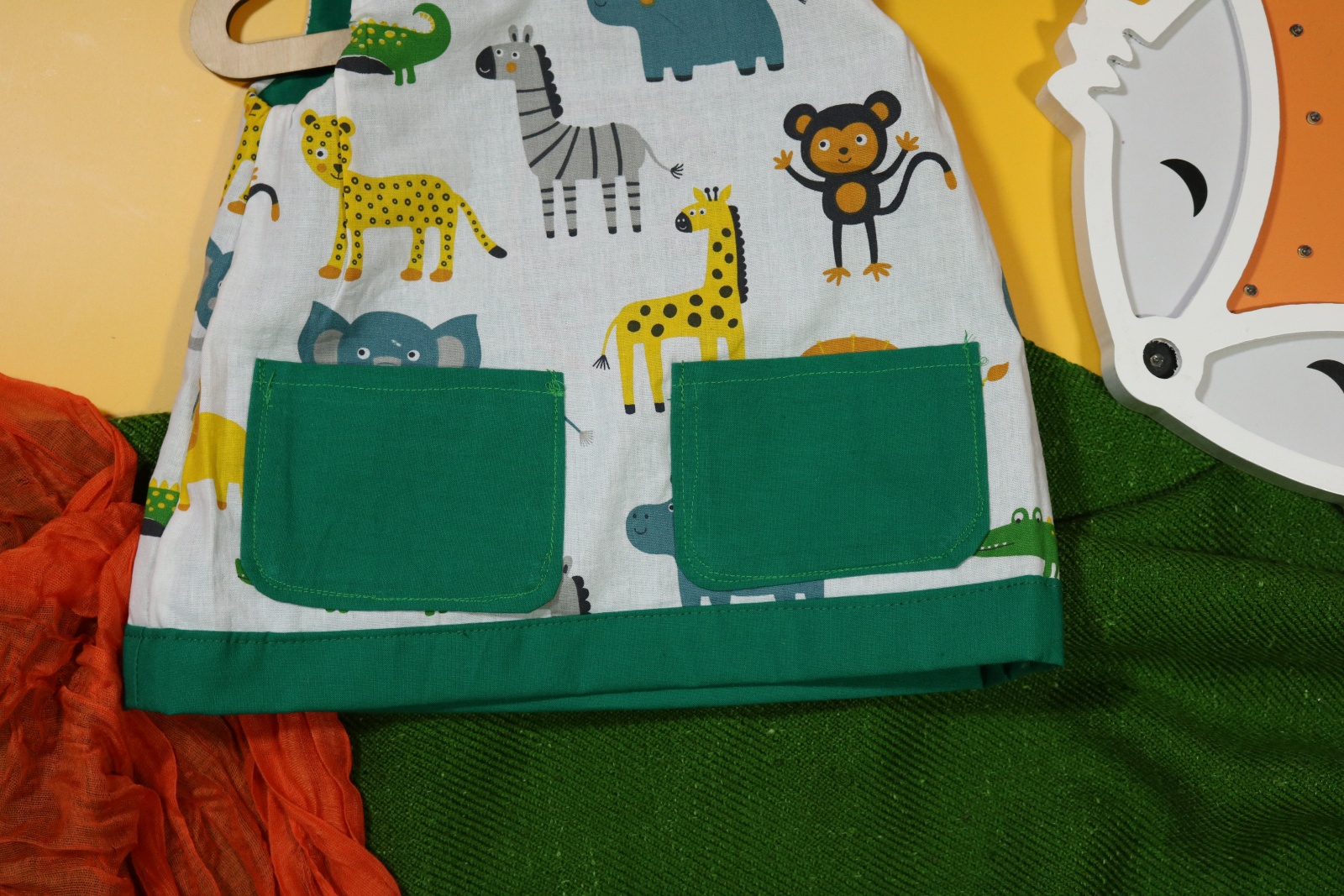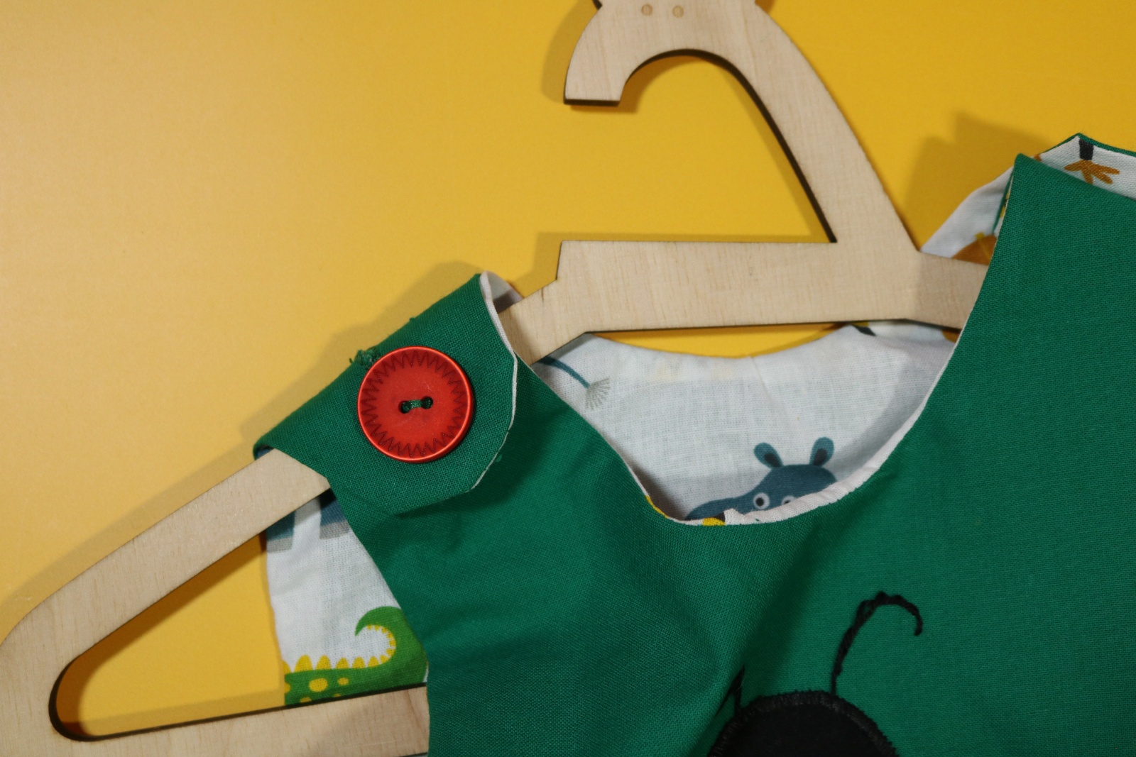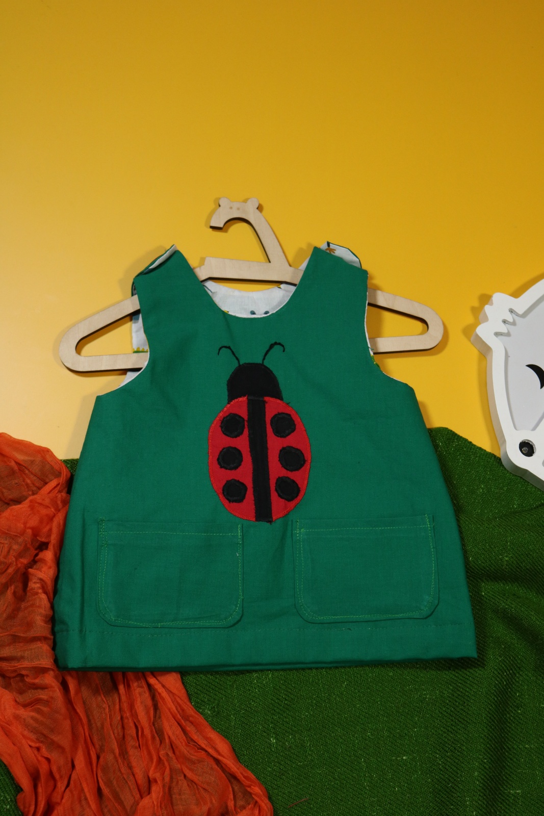 Sukienka wykonana w całości z bawełny (zdekatyzowanej przed uszyciem – sukienka nie skurczy się po praniu). Zapinana na guziki z obu stron, na każdej z nich naszyte także dwie kieszonki. Na pierwszej stronie naszyta aplikacja z biedronką.