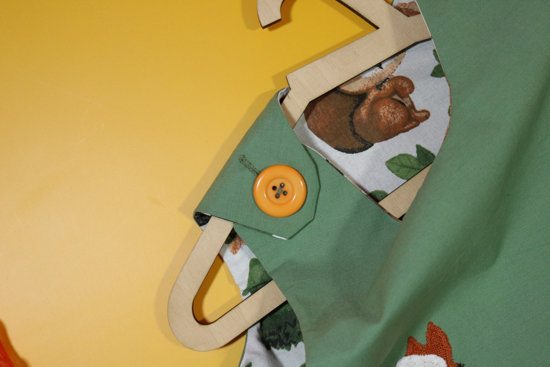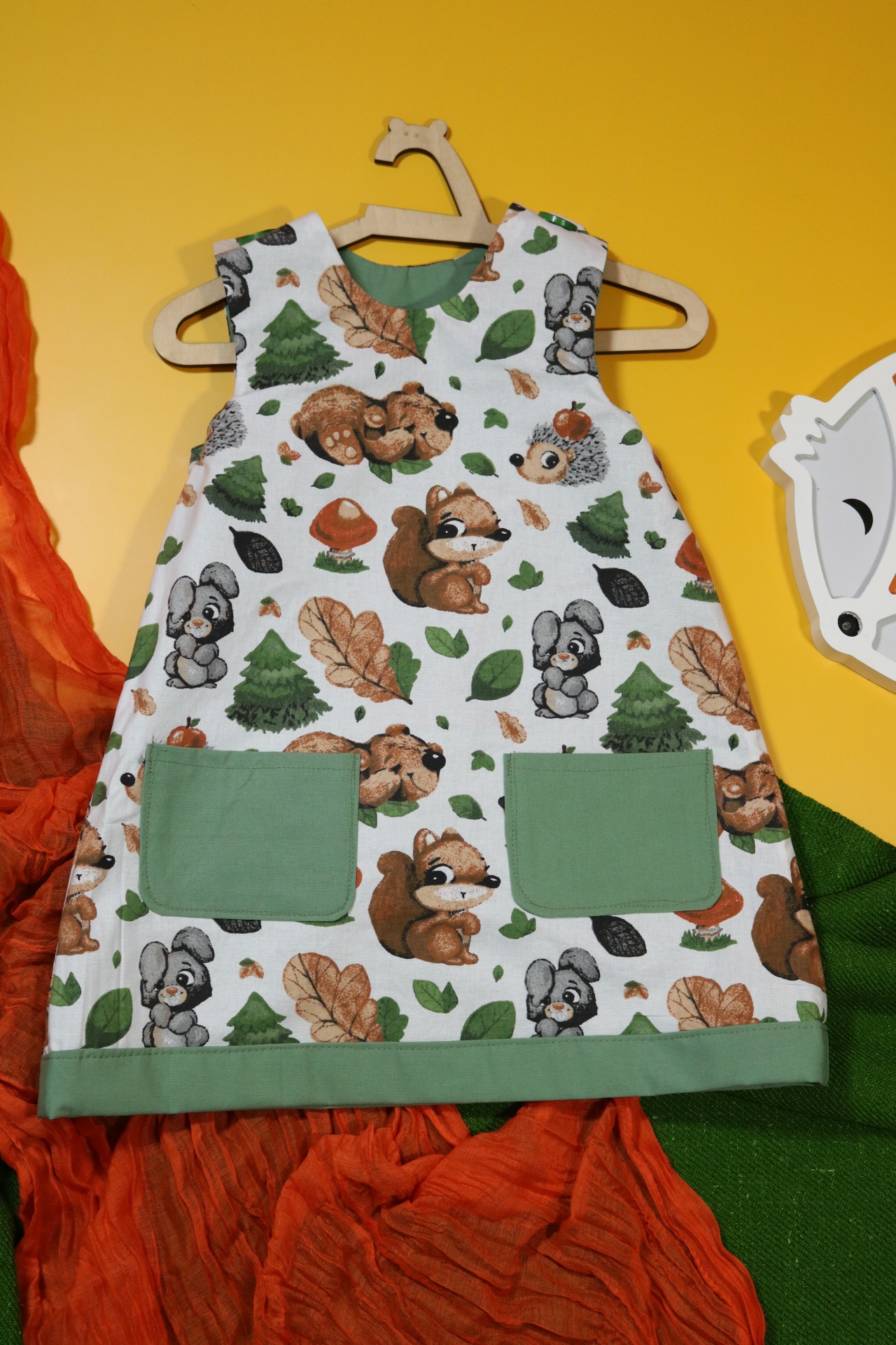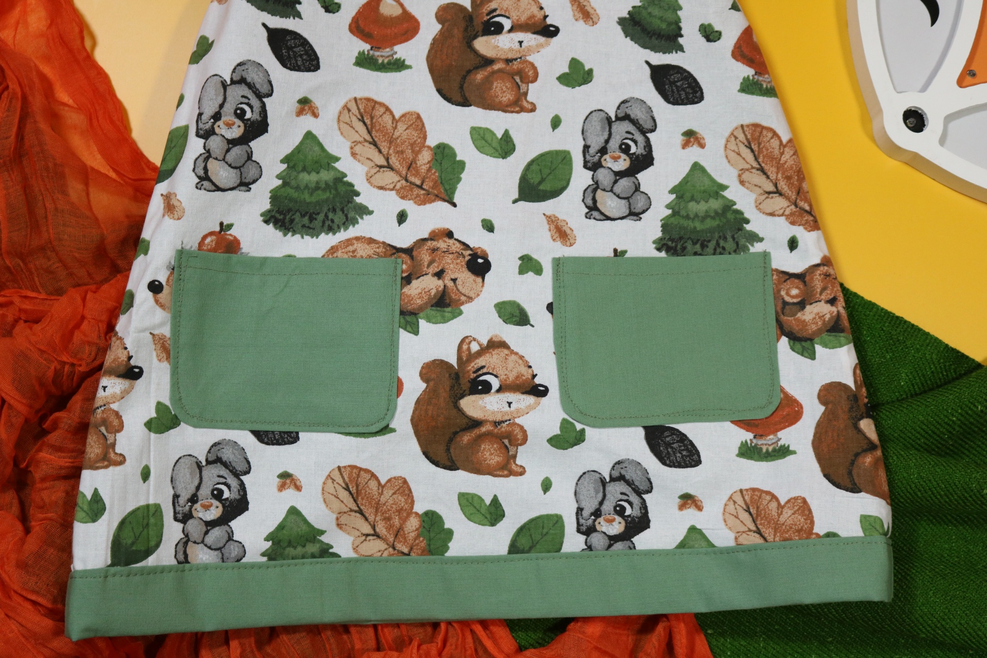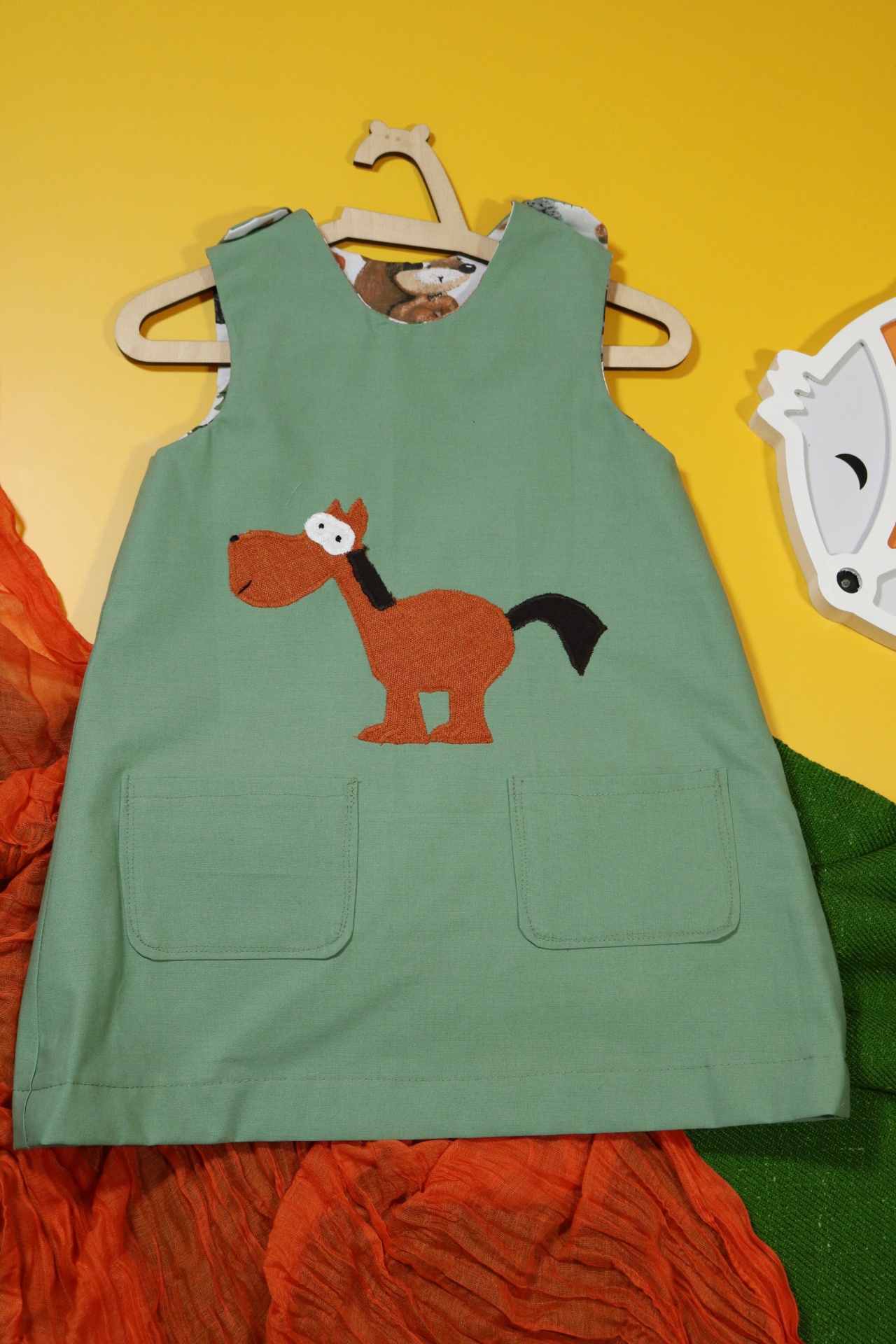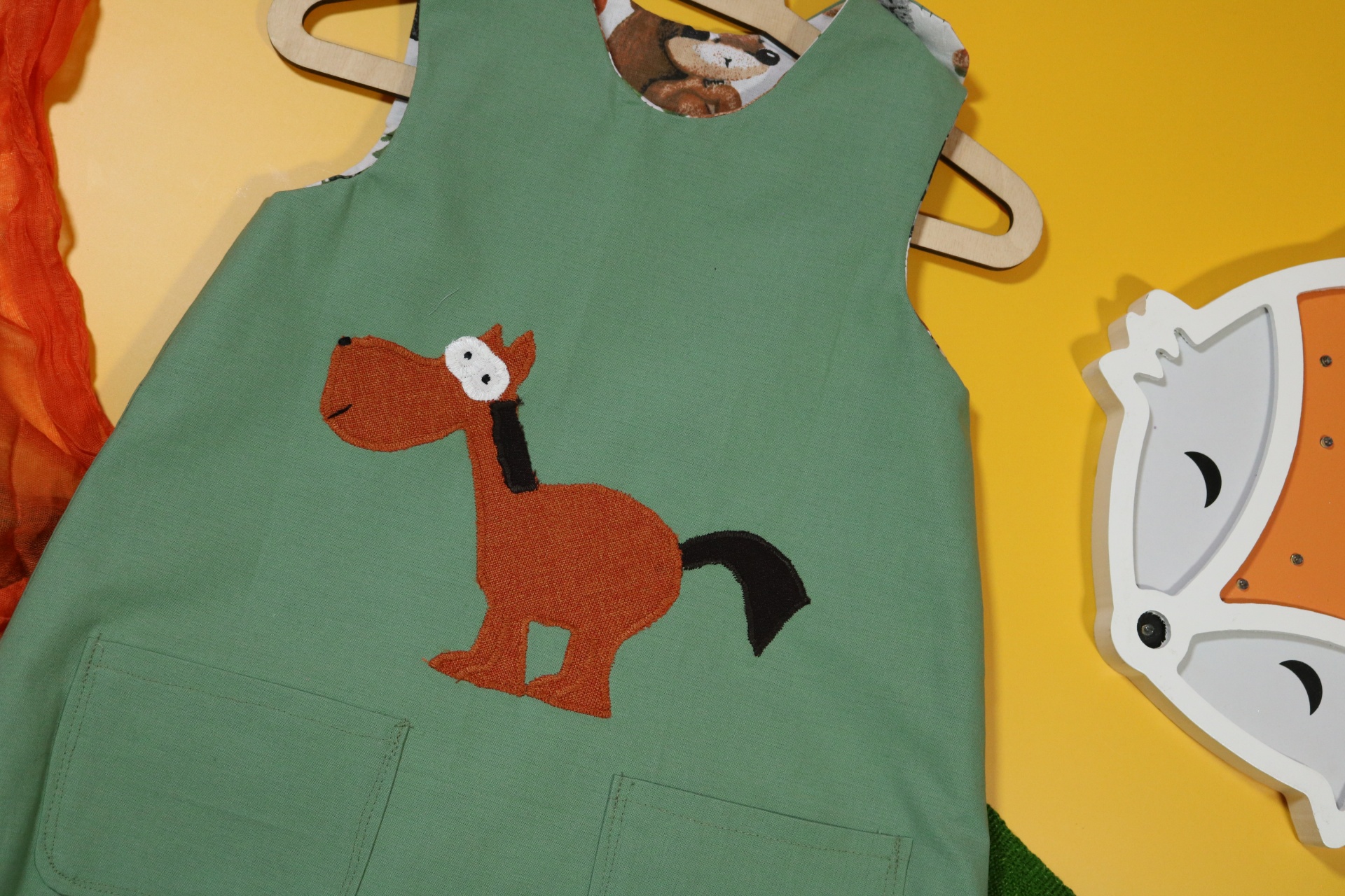 Sukienka wykonana w całości z bawełny (zdekatyzowanej przed uszyciem – sukienka nie skurczy się po praniu). Zapinana na guziki z obu stron, na każdej z nich naszyte także dwie kieszonki. Na pierwszej stronie naszyta aplikacja z koniem.