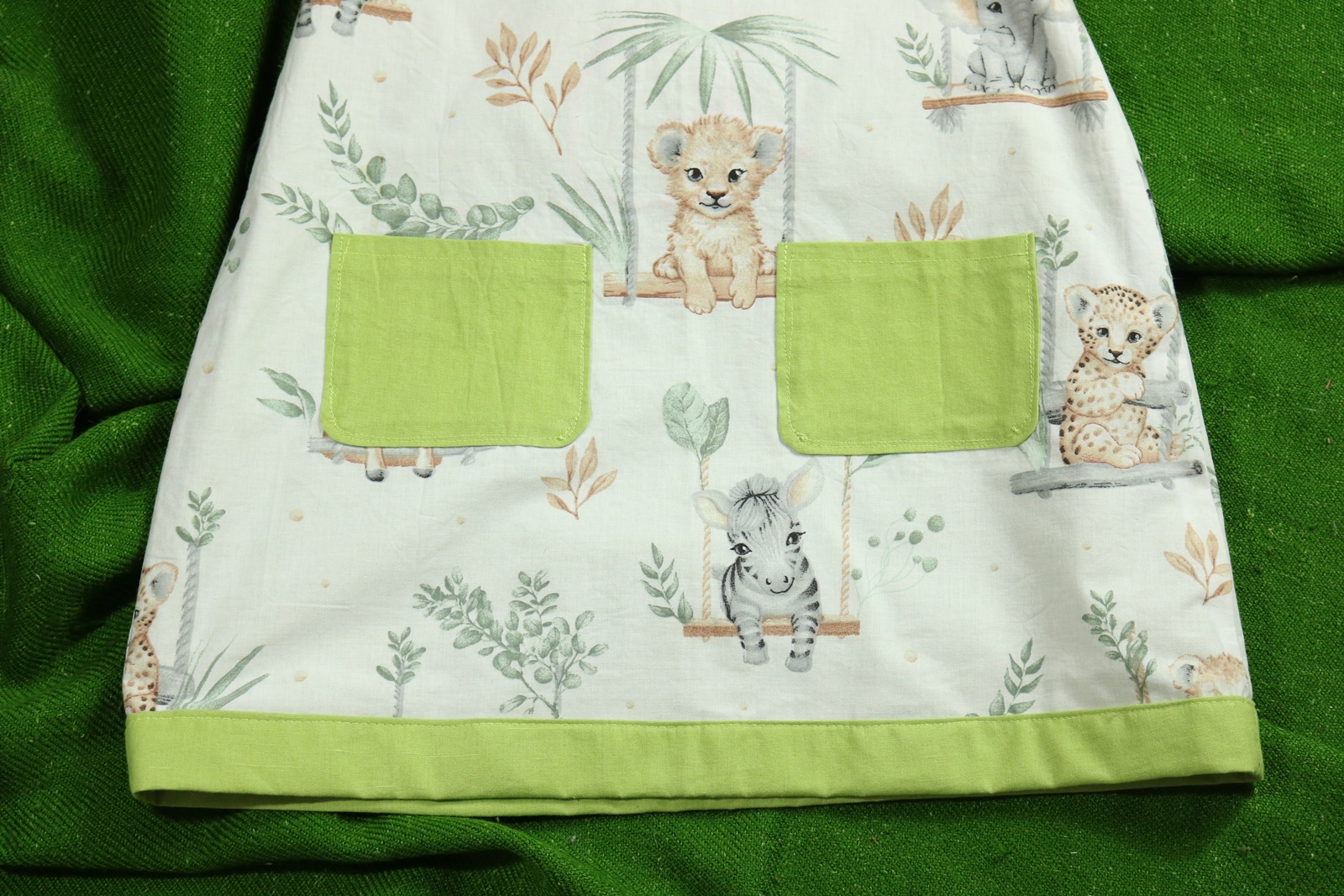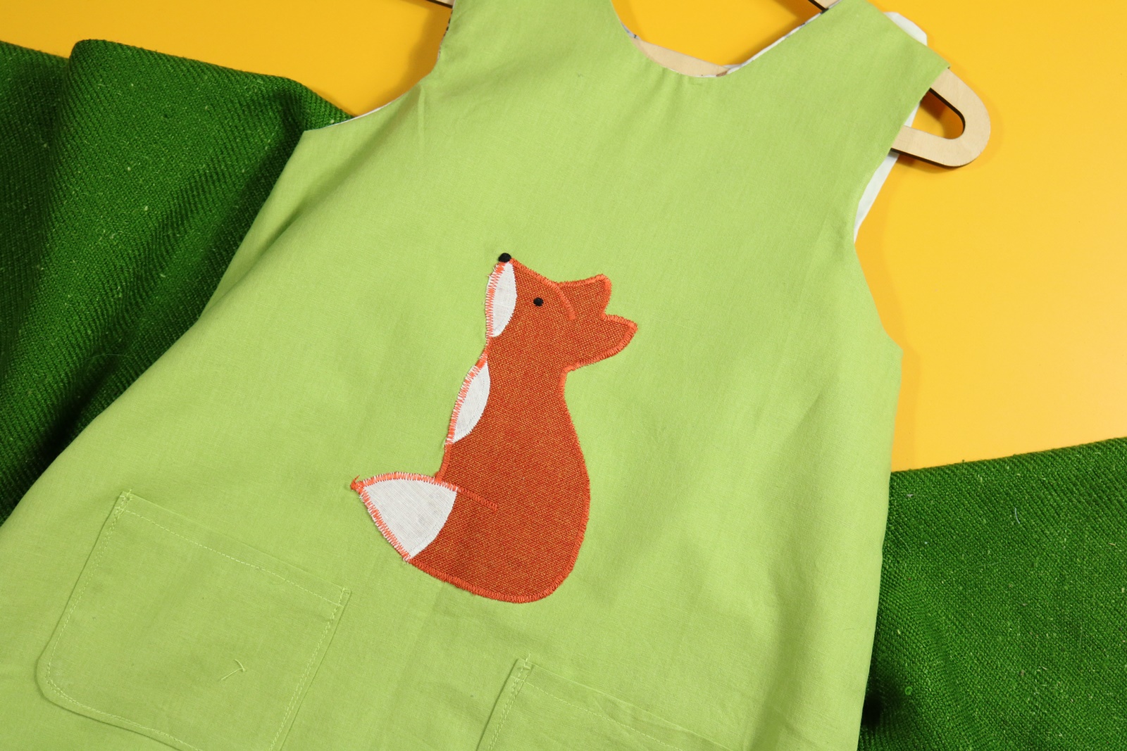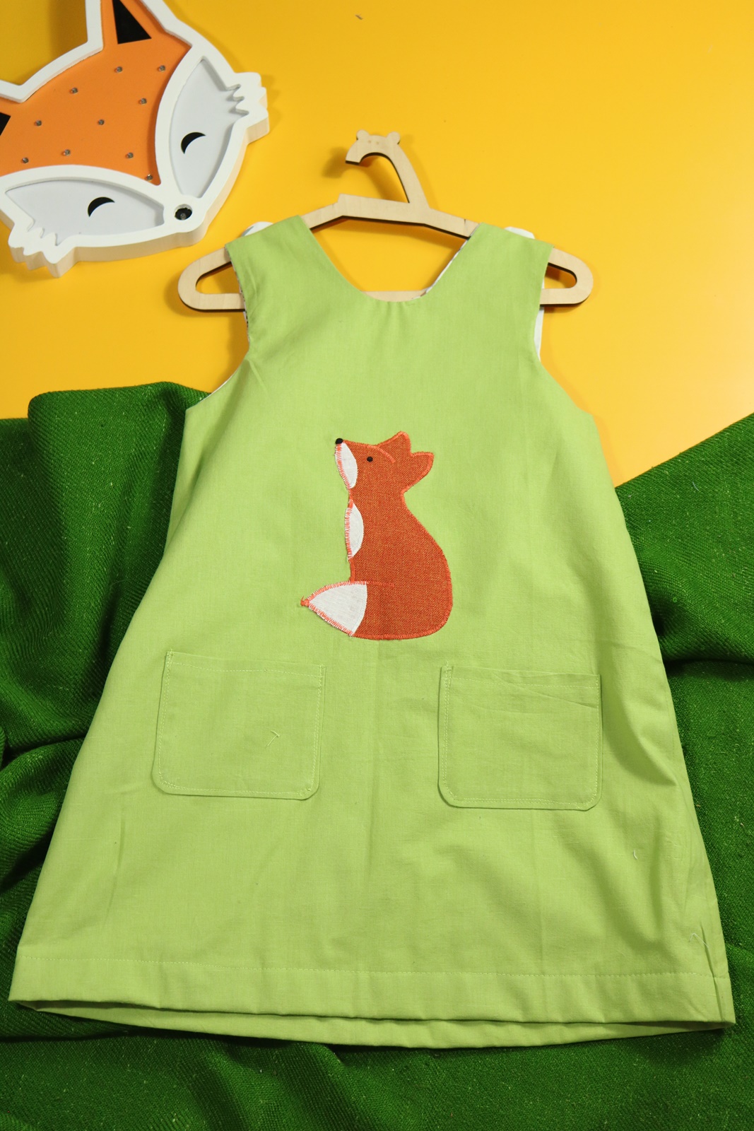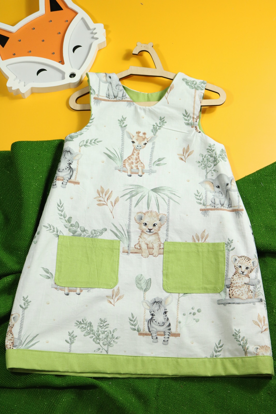 Sukienka wykonana w całości z bawełny (zdekatyzowanej przed uszyciem – sukienka nie skurczy się po praniu). Zapinana na guziki z obu stron, na każdej z nich naszyte także dwie kieszonki. Na pierwszej stronie naszyta aplikacja z lisem.