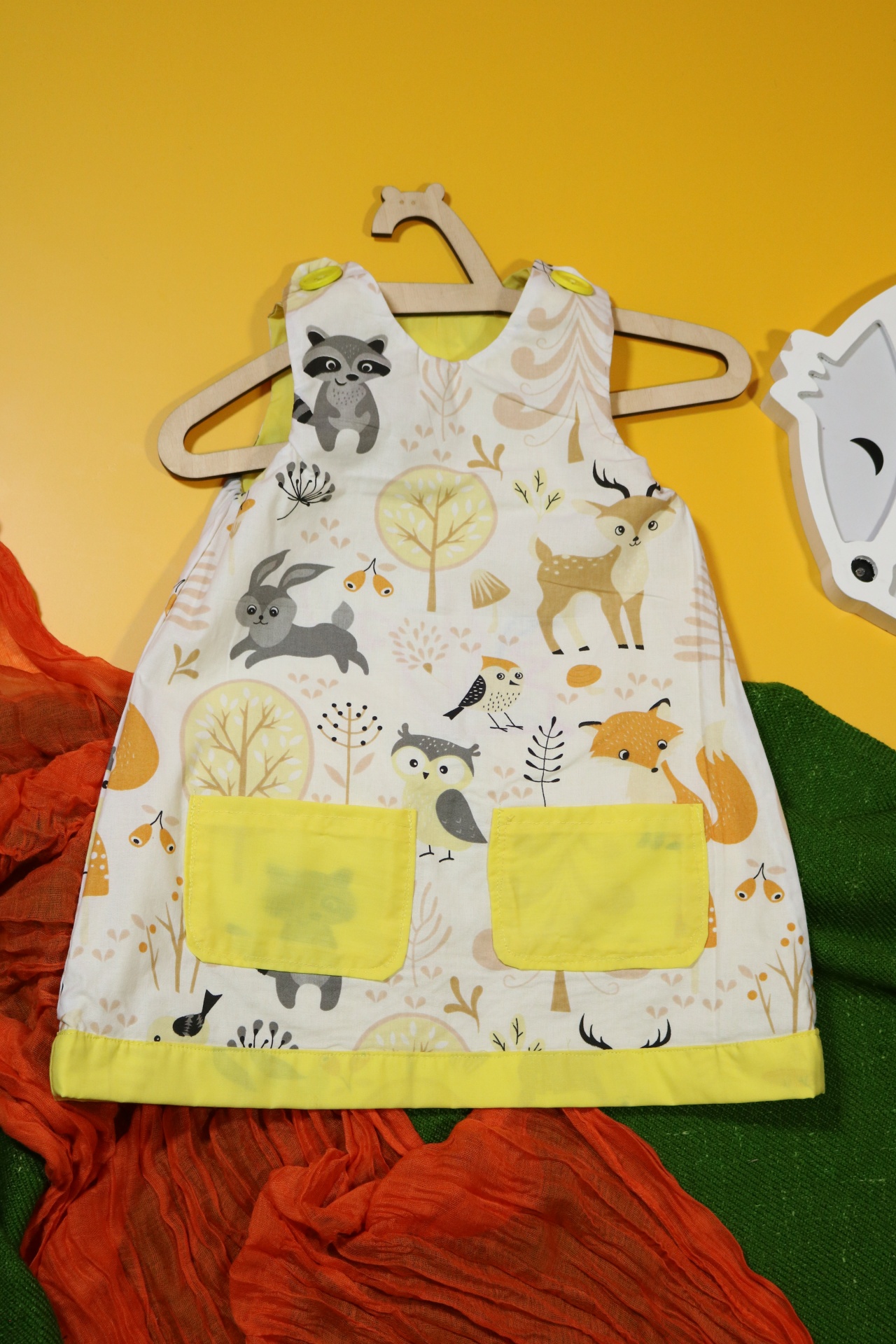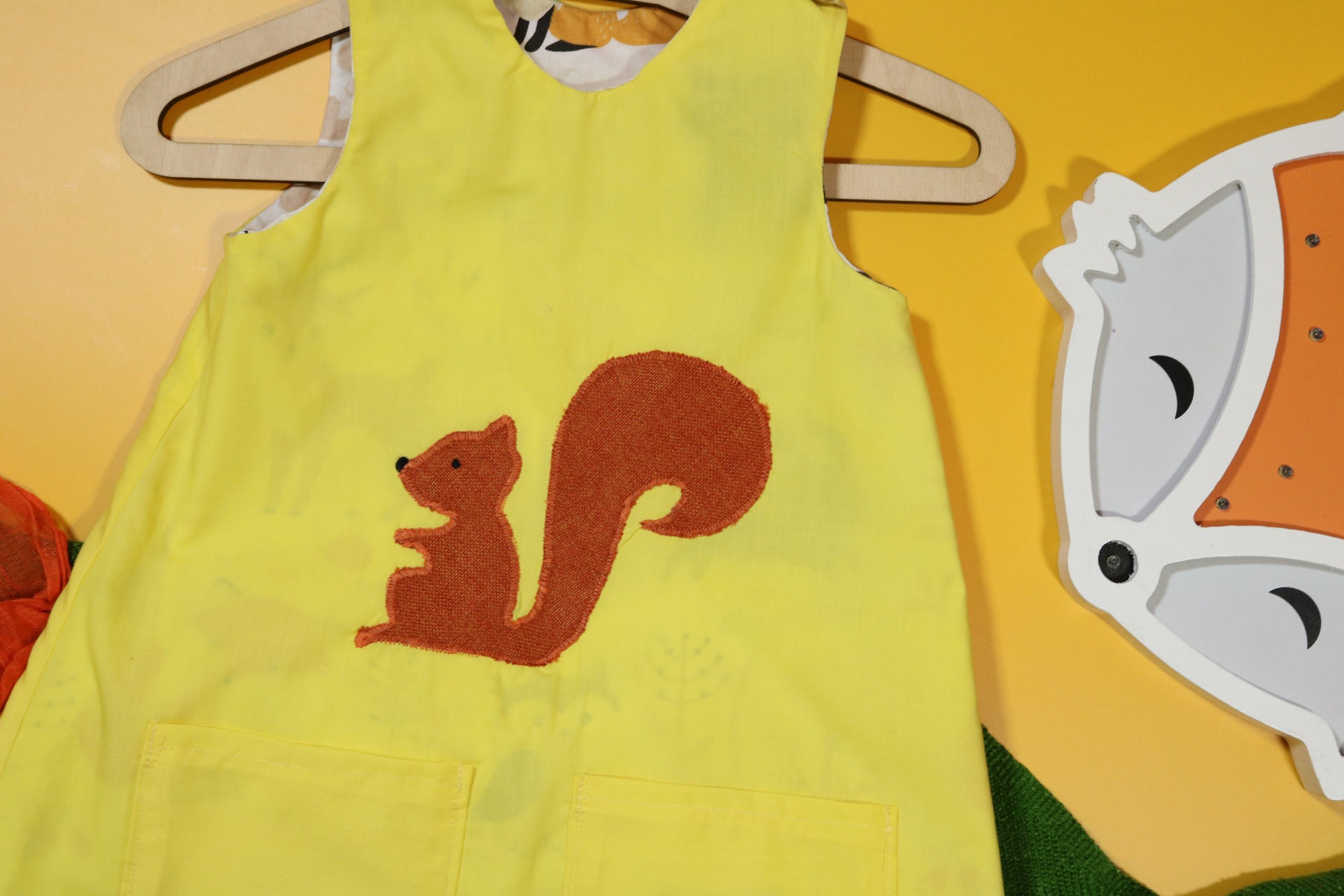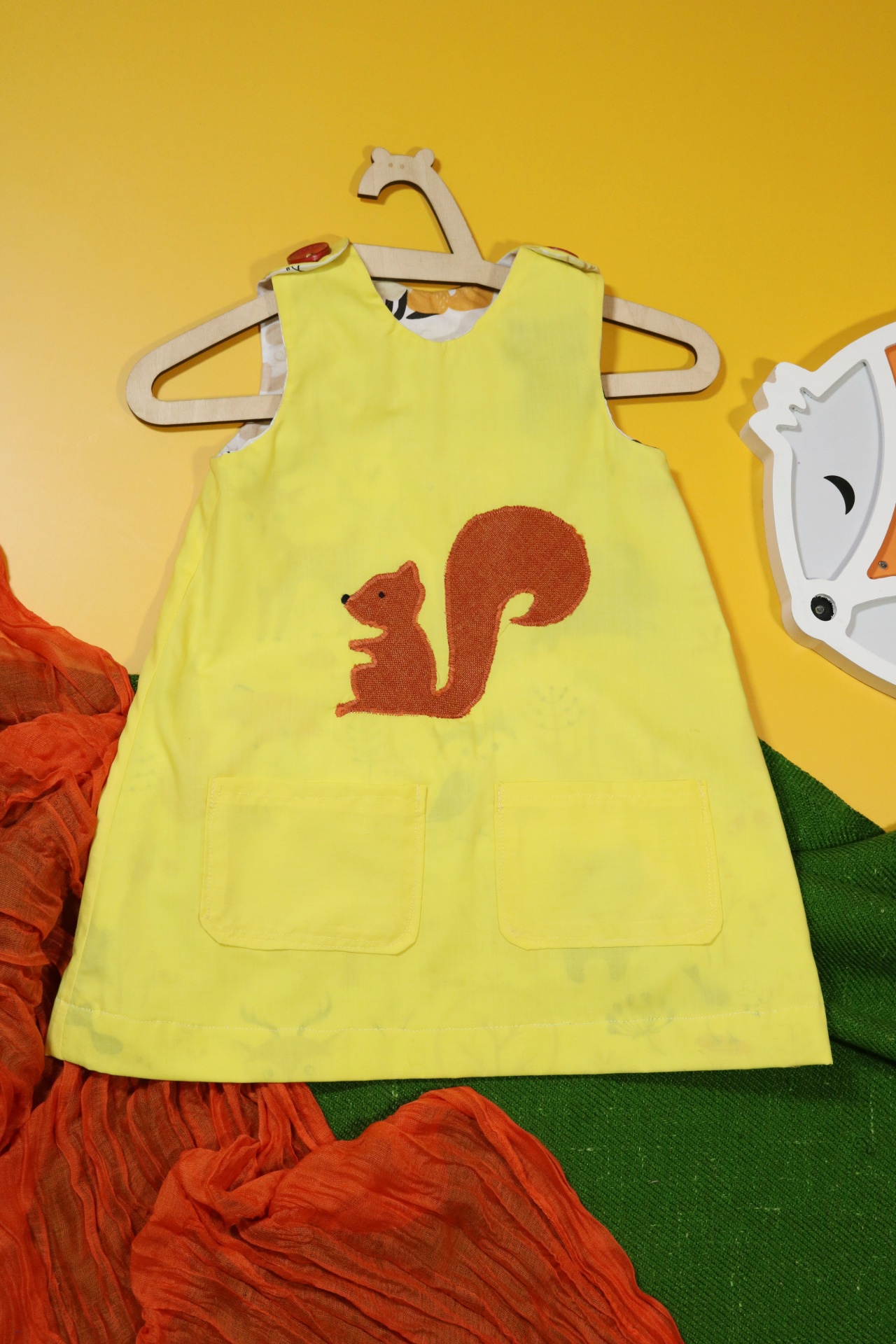 Sukienka wykonana w całości z bawełny (zdekatyzowanej przed uszyciem – sukienka nie skurczy się po praniu). Zapinana na guziki z obu stron, na każdej z nich naszyte także dwie kieszonki. Na pierwszej stronie naszyta aplikacja z wiewiórką.