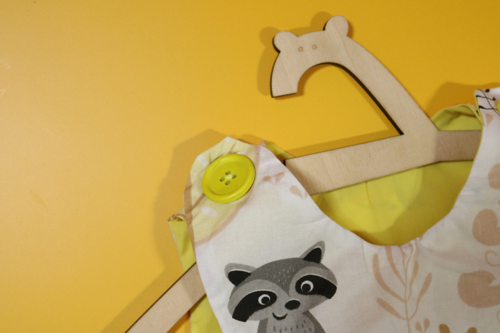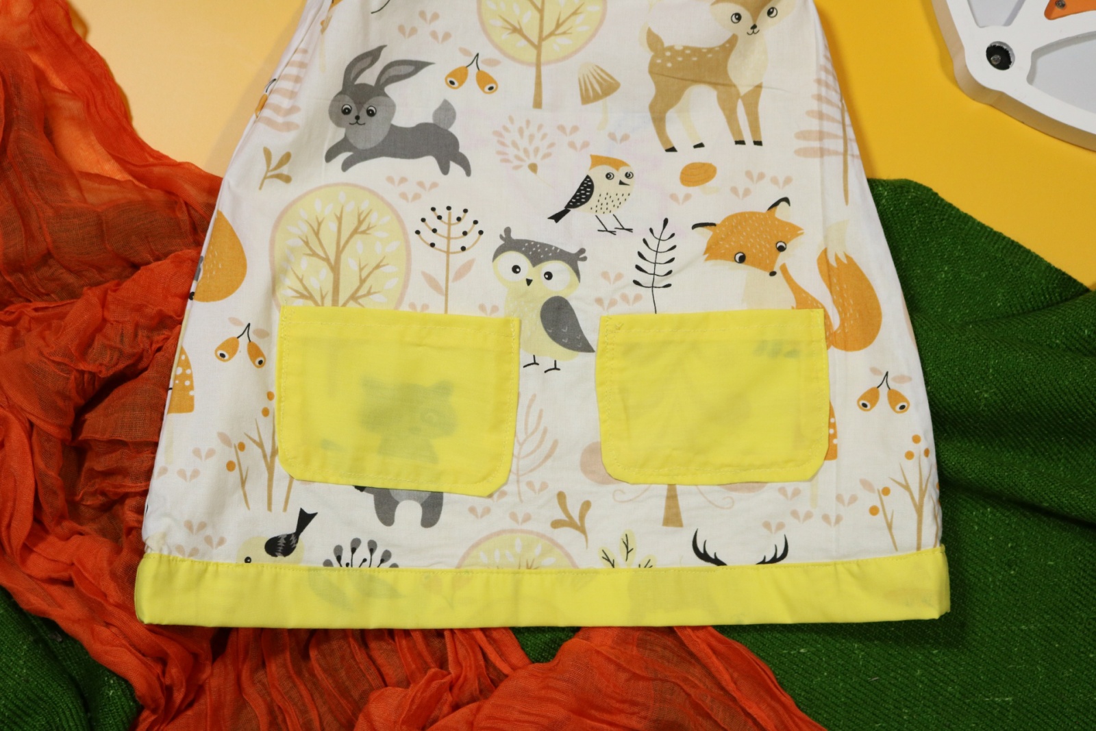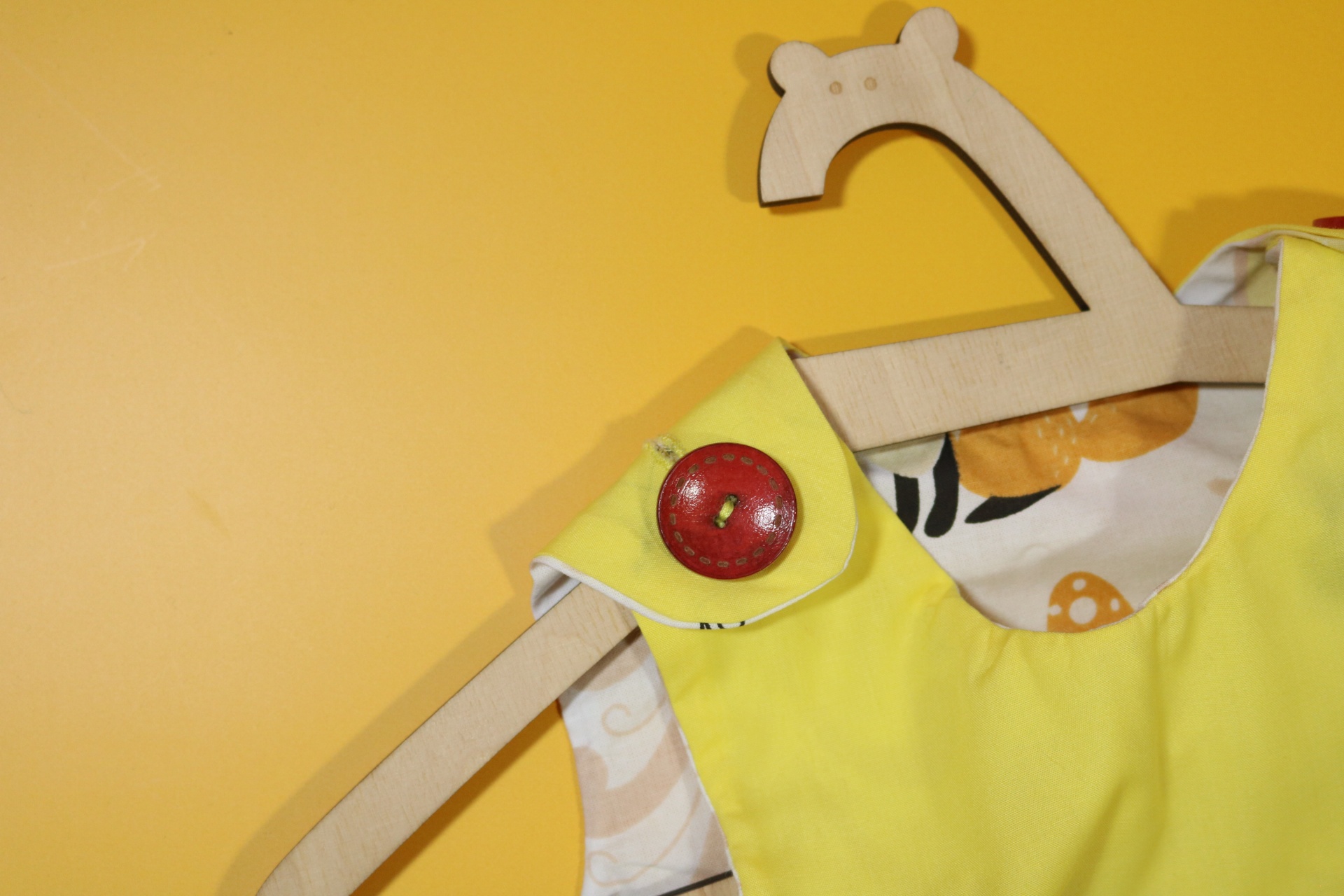 Sukienka wykonana w całości z bawełny (zdekatyzowanej przed uszyciem – sukienka nie skurczy się po praniu). Zapinana na guziki z obu stron, na każdej z nich naszyte także dwie kieszonki. Na pierwszej stronie naszyta aplikacja z wiewiórką.